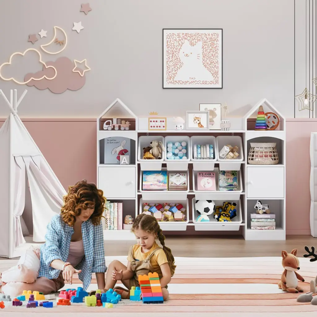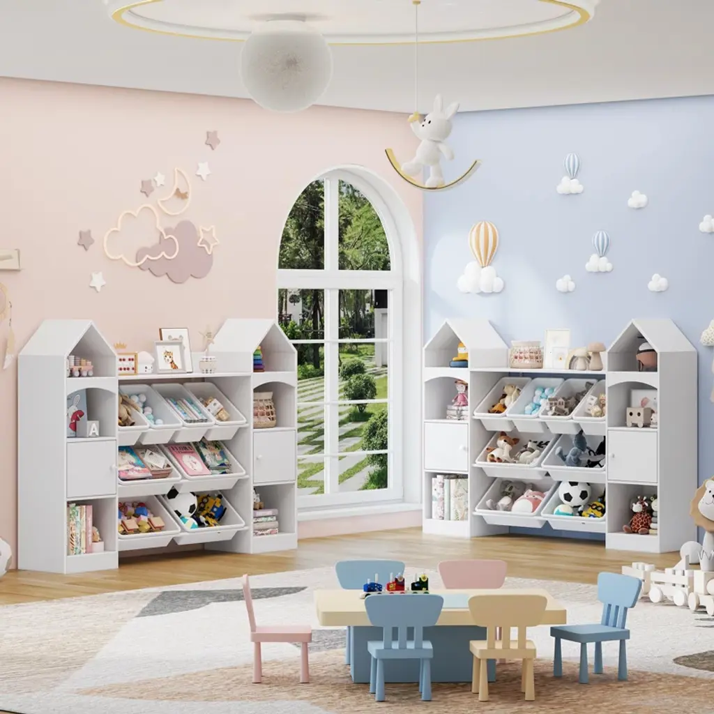 This toy storage organizer, with clean lines and classic solid colors, fits seamlessly into any room. Measuring 55.12×11.81×41.33 inches, it offers 2 cabinets, 6 open stands, and 8 boxes for versatile storage. It encourages kids to develop organizational skills and responsibility through fun tidying. Crafted from high-quality materials with rounded edges, it’s sturdy and safe. Easy to assemble with clear instructions; customer service is ready to help.