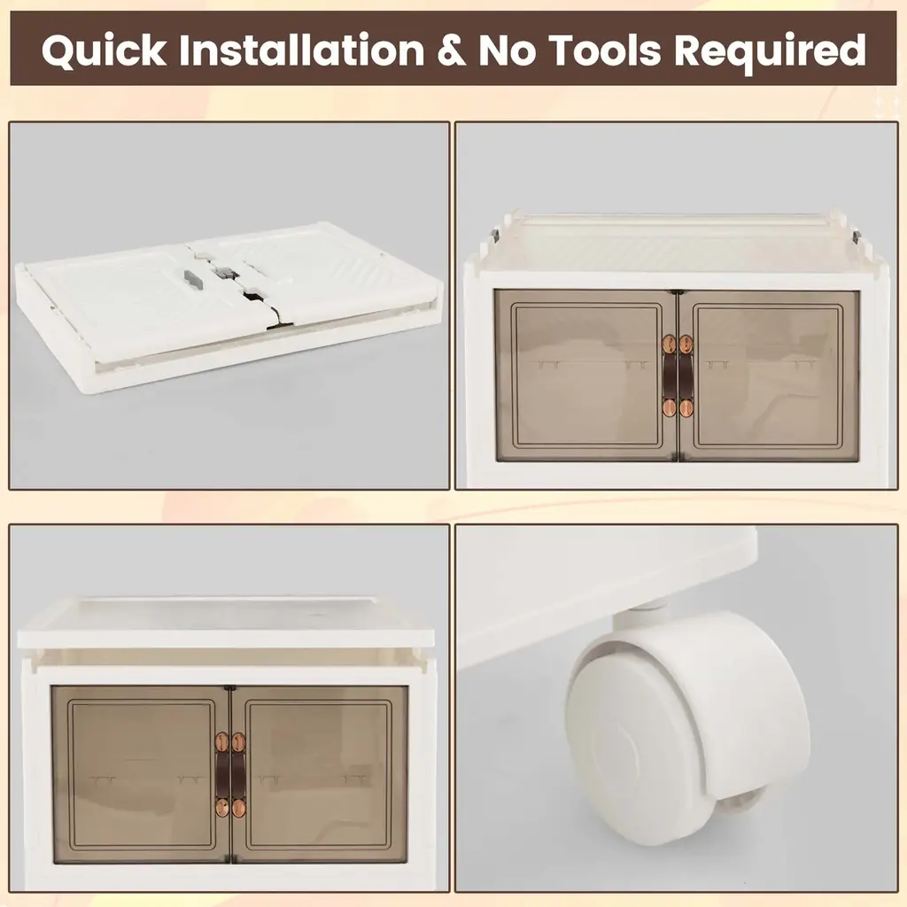 Instantly transform your space with our clever collapsible storage box! Setup is a breeze with its folding design. Snap, stack, and declutter effortlessly! Need to make some room? Simply collapse and store it flat until next time. Accessing your belongings is a breeze with the transparent doors, magnetic catches, and handles. The removable lid allows for easy top access. With four smooth and silent universal casters, move your storage box effortlessly from room to room. Worried about it moving unexpectedly? Just lock the two casters in place. Perfect for closets, living rooms, kitchens, and car trunks. Customize your storage organizer to suit your needs! Features:Specification