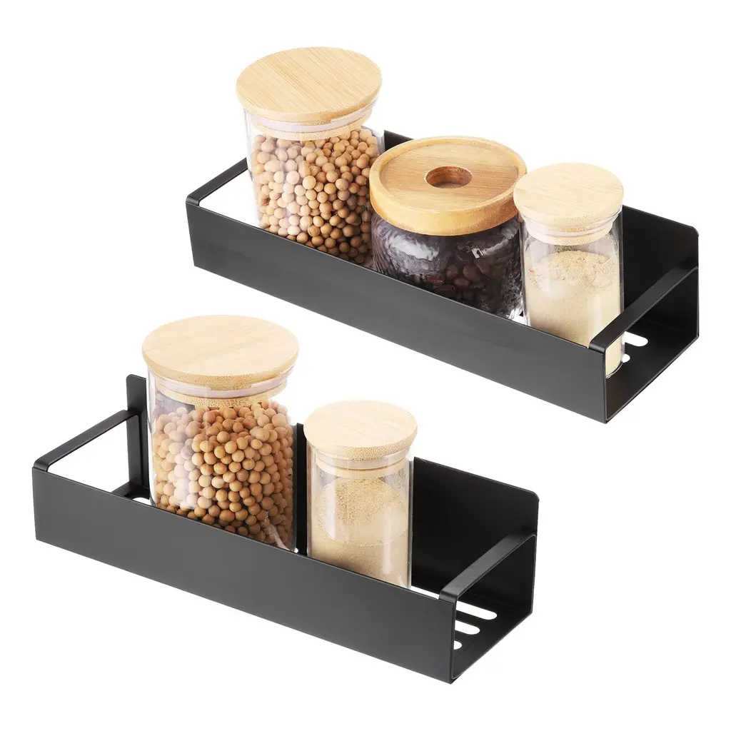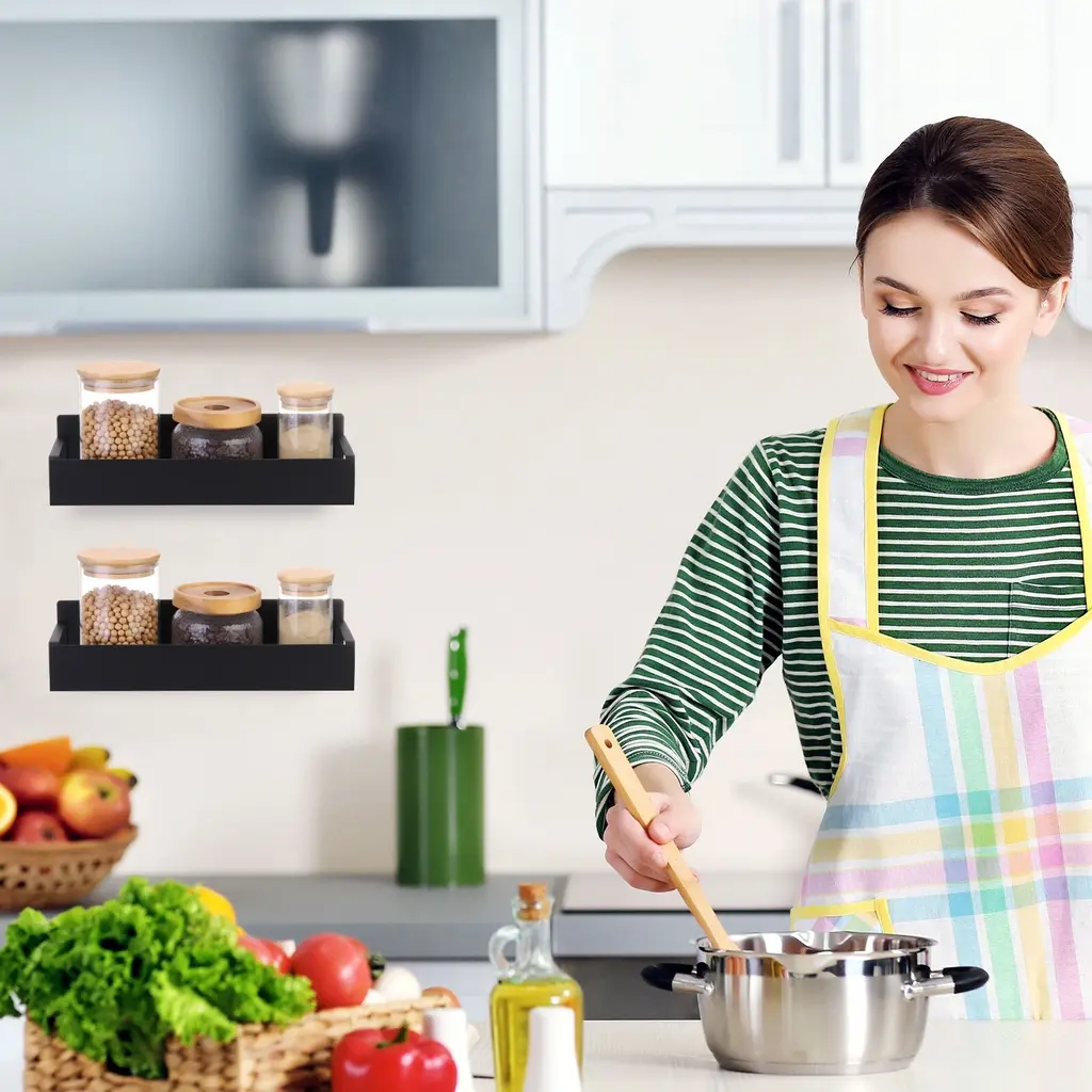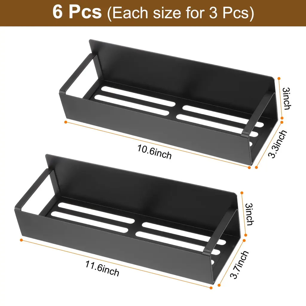Description:QUALITY MATERIAL - Our magnetic spice racks are made of sturdy iron materials, with a black matte finish, rust-proof, waterproof, stable, and durable. They keep spices conveniently within reach and keep your kitchen looking organized. Hollow-out bottom design, ventilation, moisture-proof; Smooth rounded corner design to prevent collision.MULTI-PURPOSE MAGNETIC SHELF - The spice rack organizer is designed with a solid magnetic to hold up to 8.8 lbs of storage weight. Just stick it on the side of the refrigerator door, microwave, oven (or other metal surfaces) won't move or fall off easily. You can adjust the distance between the shelves according to your needs.EASY TO INSTALL - The magnetic spice organizer does not require drilling or assembly. You can stick the magnet spice rack to the fridge or the side of other metal surfaces. They are easy to adhere to and adjust placement as needed, even if they hold a lot of bottles and don't move out of place. They make the most of space around the refrigerator and microwave to keep your countertops tidy and unclutteredEASY TO CLEAN AND SAVE SPACE - Our magnetic spice rack for refrigerators possess a smooth surface that is resistant to oil and dust, making it easy to clean. Rinse it with water or wipe it with a damp cloth for easy cleanup. WIDELY USED - The magnetic spice rack suits refrigerators, microwave ovens, coffee makers, washing machines, dryers, or other metal surfaces.Specification:Color: Black Small Magnetic Spice: 27x8.5x7.2cm/10.6x3.3x3 inches (L*W*H)Large Magnetic Spice: 29.5x9.5x7.2cm/11.6x3.7x3inches (L*W*H)Package Content: 6pcs including 3pcs Small Magnetic Spice and 3pcs Large Magnetic Spice