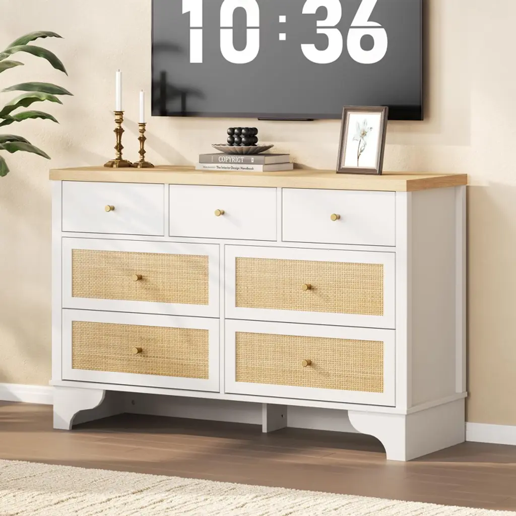 7-Drawer Dresser for Bedroom, 47.3" Wide Rattan Chest of Drawers ¨C Boho-Chic Wood Storage Organizer for Bedroom & Living RoomBrand: TROPOWMaterial: Engineered Wood + Handwoven Natural RattanColor: Natural Wood Tone with Rattan AccentsStyle: Bohemian / Modern FarmhouseDimensions: 47.3"W x 15.9"D x 31.5"HWeight: 118 lbsDrawers: 7 (4 Large + 3 Small)Special Features: Reinforced anti-tip base Polished smooth finish Handwoven rattan frontsAssembly: Required (2-person recommended) PRODUCT HIGHLIGHTSBOHEMIAN CHIC DESIGN Handwoven rattan drawer fronts add organic texture Clean wood frame blends with:? Scandinavian minimalism? Farmhouse rustic? Mid-century modern Versatile styling ¨C top surface for decor like plants or mirrors SMART 7-DRAWER ORGANIZATION 4 large drawers (18" wide) ¨C store sweaters, blankets, jeans 3 slim drawers ¨C perfect for jewelry, socks, cosmetics Divided storage reduces clutter with clear categorization BUILT TO LAST Engineered wood construction resists warping Reinforced base prevents tipping Smooth-gliding drawers with sturdy metal runners MULTI-ROOM FUNCTIONALITY? Bedroom ¨C Clothes & accessory storage? Living Room ¨C TV console or display cabinet? Entryway ¨C Stylish drop zone for keys & mailEASY ASSEMBLY Numbered parts & pre-drilled holes Includes all tools Step-by-step instructions WHY CHOOSE THIS DRESSER?? Unique Rattan Detail ¨C Adds natural warmth? Ample Storage ¨C 7 drawers for all essentials? Sturdy & Safe ¨C Anti-tip reinforced base? Style Versatility ¨C Fits any decor themePerfect For: Small space living (fits tight spaces) Boho, farmhouse or eclectic styles Guest room storage solutions Creating a styled vignette with decor
