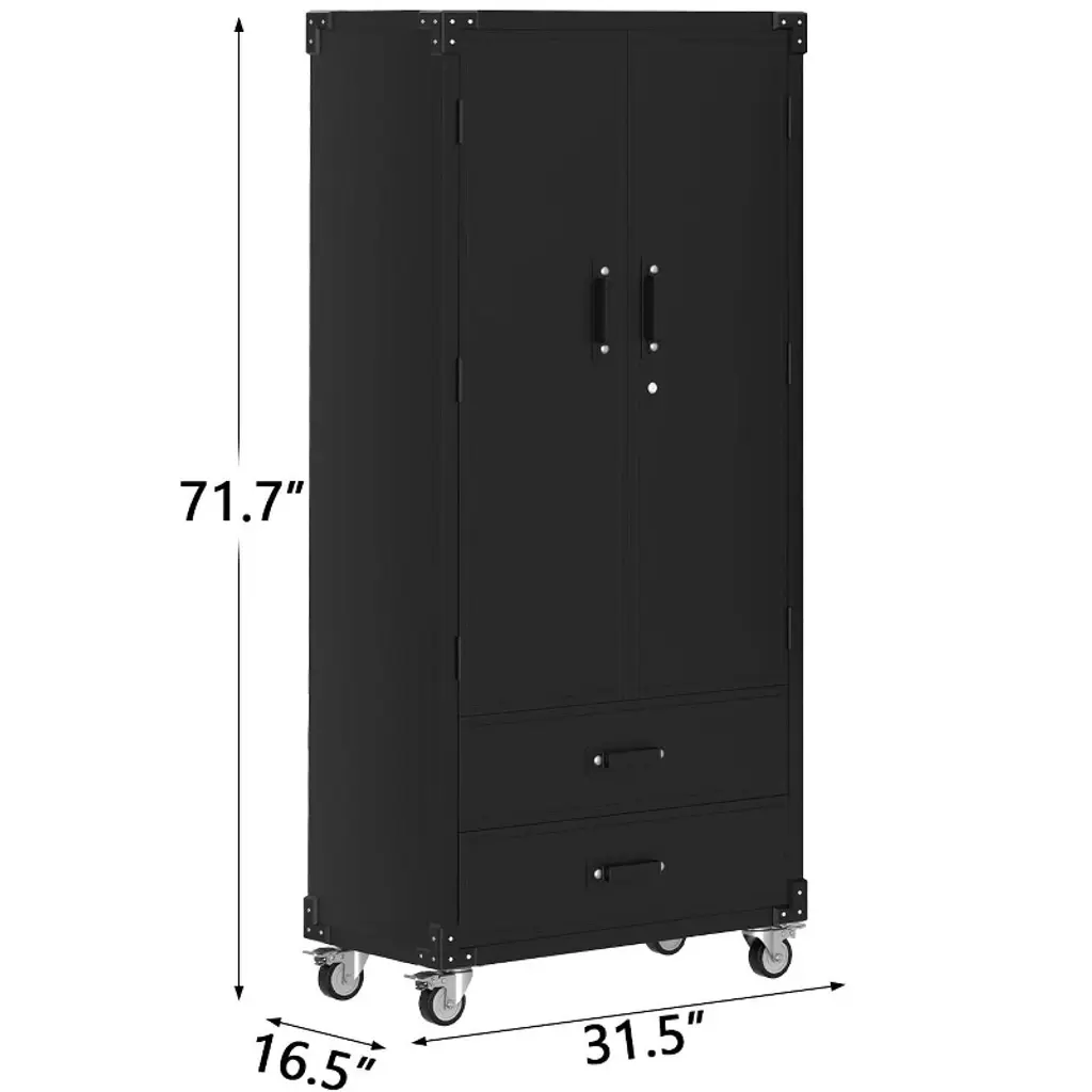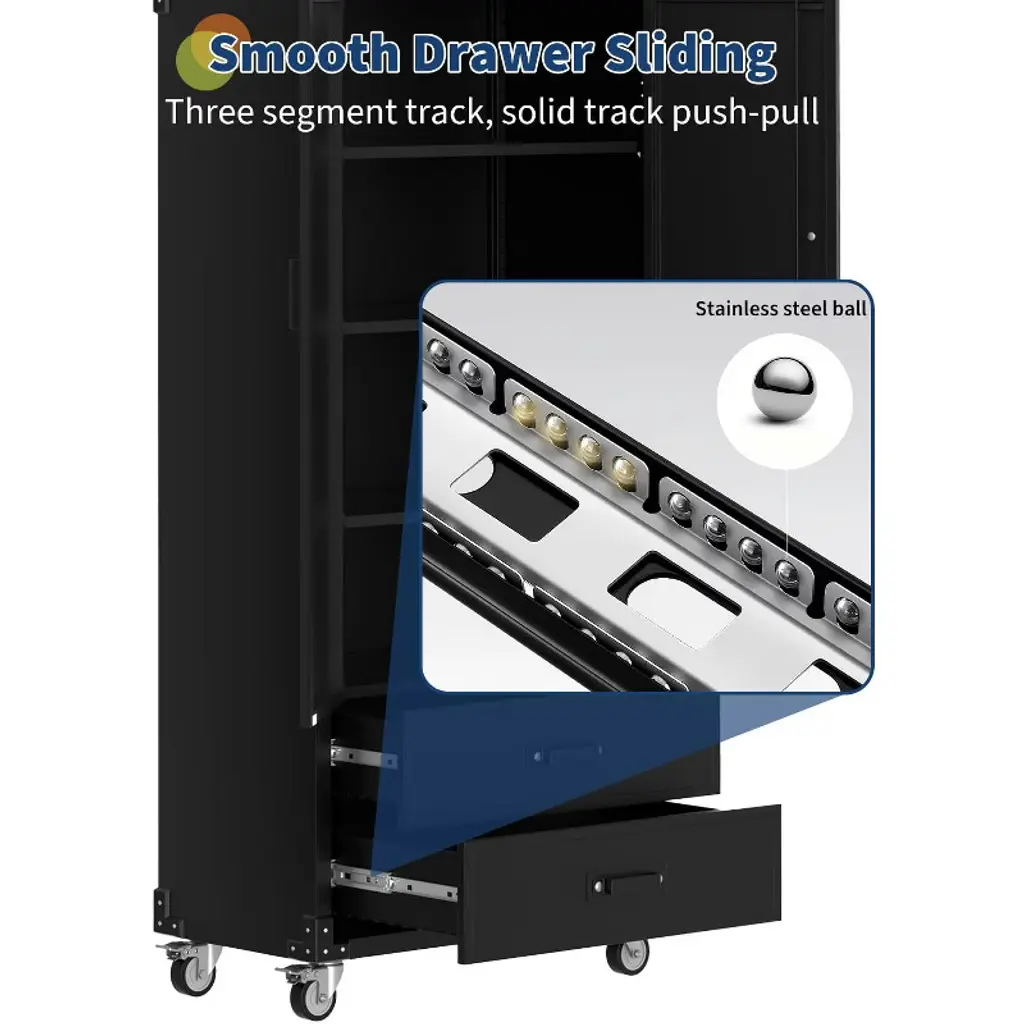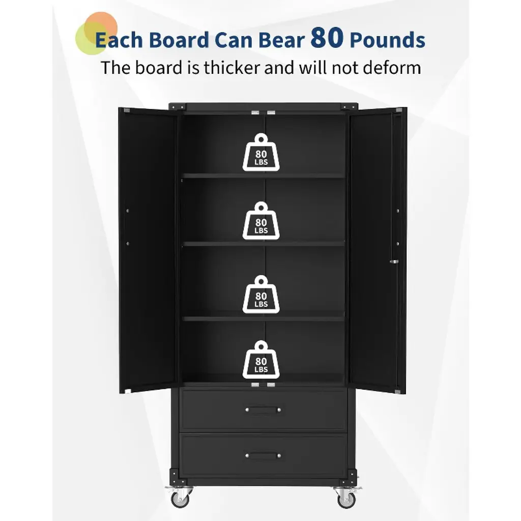 72" Metal Storage Cabinet With Wheels, Locking Doors &2 Drawers,heavy Duty Rolling Garage Organizer With 3 Adjustable Shelves For Home/office/workshop