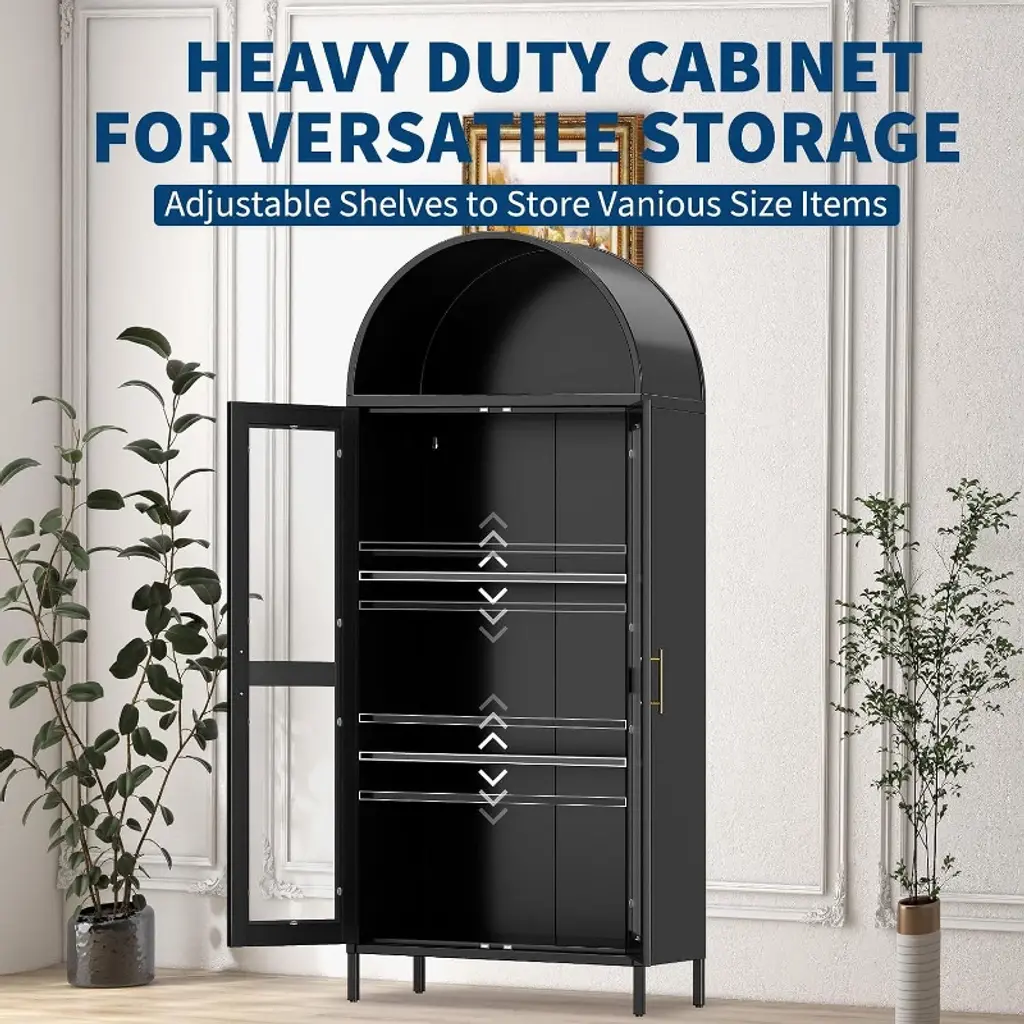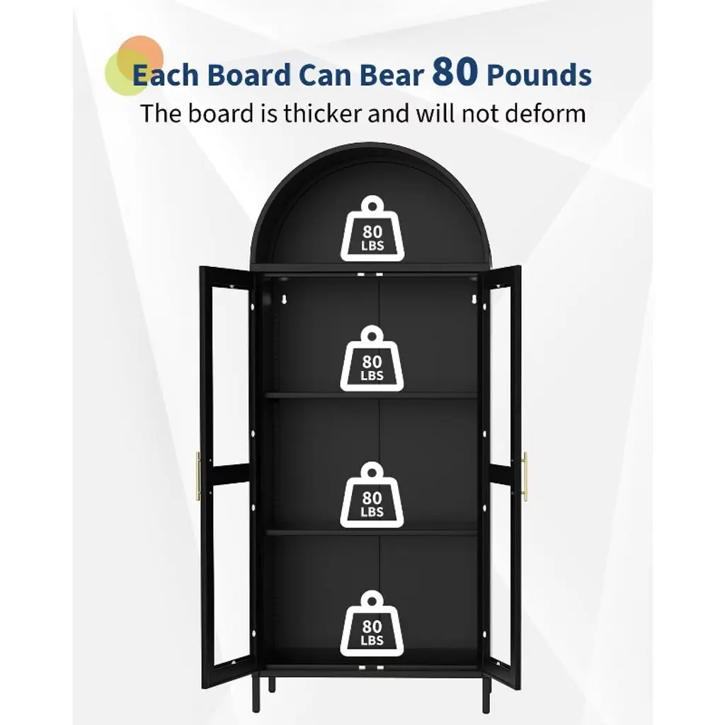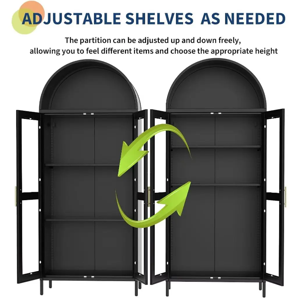 The Unique Arched Top And Glass Cabinet Doors, Gold Bar Handles And Smooth Lines Are Modern And Simple, And Can Be Easily Integrated Into Any Decoration Style. This Storage Cabinet Is Perfect For Storage In Your Kitchen, Dining Room, Bathroom Or Study, Combining Style And Order.The arched cabinet adapts to your style, adjustable shelves for books, collectibles, kitchen pantry items, or beautiful tableware, ideal as a metal display cabinet or bookshelf for home offices, studios, or entryways