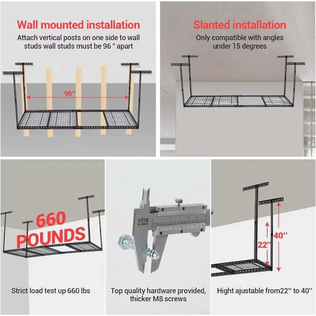 The Acekool Metal Garage Ceiling Rack offers an ideal storage solution for keeping your garage tidy and organized. By taking advantage of unused ceiling space, this overhead rack opens up valuable floor space, making room for your vehicles or other activities. The steel construction ensures impressive strength and resilience, supporting everything from power tools and bins to outdoor equipment and more. Featuring multiple sturdy columns, this rack delivers excellent load-bearing capacity and keeps heavy or bulky items secure overhead. The black powder-coated finish blends seamlessly with most garage interiors while resisting scratches and signs of wear. The design is perfect for homeowners looking to sort, store, and access their belongings efficiently. Installation is straightforward, thanks to included step-by-step instructions and all necessary mounting parts. Whether you're clearing clutter, tackling a garage makeover, or setting up a new workspace, this storage rack helps maintain order while keeping your essentials close at hand. With multiple sizes and support column configurations available—including 4 or 6 columns and dimensions ranging from 180x120cm up to 240x120cm—choose the option that best fits your space and storage needs. Add versatility and structure to your garage by making smart use of ceiling space with Acekool’s innovative design.