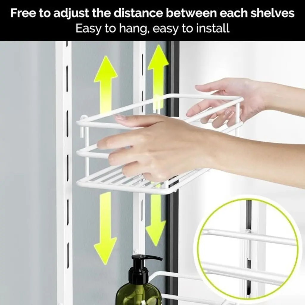 Rustproof.HEIGHT ADJUSTABLE HIGH CAPACITY SHELVES - We can adjust the height between the shelves according to our needs, which means we can put toiletries (such as face creams) in a smaller space, while it also has enough space for the tallest shampoo and conditioner bottles.MULTIPLE BACK FIXINGS, STURDY AND DURABLE - This extra tall over-the-door shower caddy has suction cups and screw fixings to hold it in place from the back, so that it won't slide around on the glass door, and you don't have to worry about it wobbling around and causing a mess when you're using it.STRONG, RUST-RESISTANT AND EASY TO ASSEMBLE - The whole assembly and installation process takes less than 5 minutes, the shelves are specially treated to be not only rust-resistant, but also sturdy and durable.WITH HOOKS AND SOAP HOLDER - Dual hooks are designed to hang razors, shower sponges and brushes for extra convenience. One of the shower organizers also has a built-in soap holder, you don't need to buy extra.WARM DETAILS - We installed soft washers at all contact points between the bathroom organizer and the glass door, which won't scratch the glass door and make the basket more stable and won't wobble. Note: Not applicable to sliding doors.