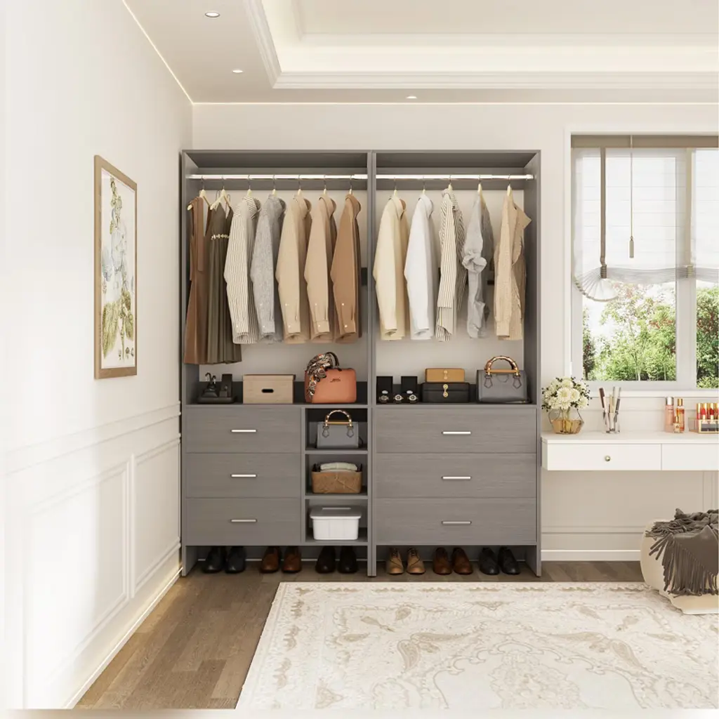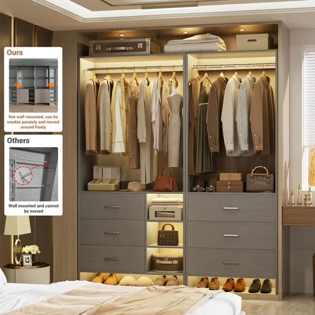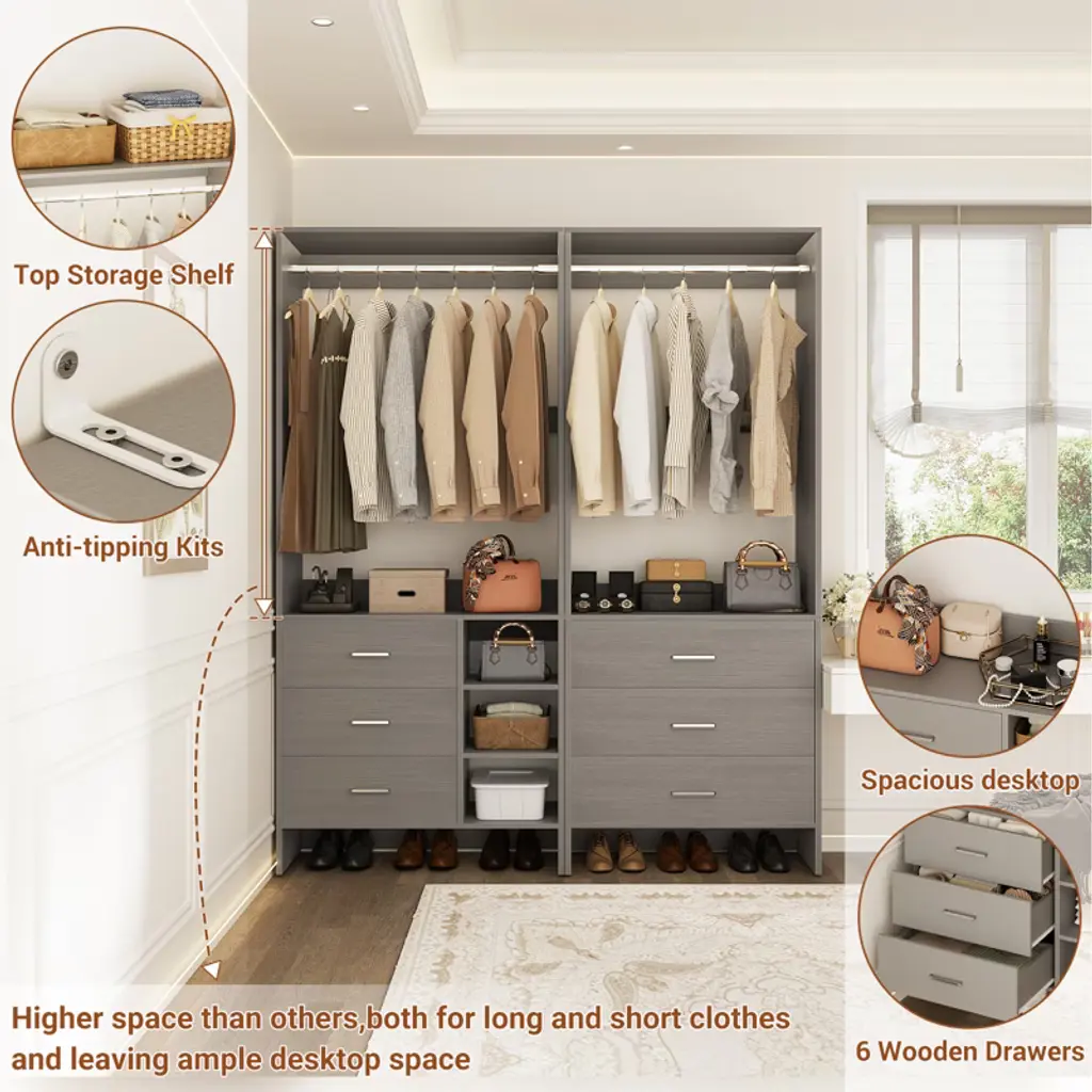 An innovative and comprehensive storage solution designed to transform your wardrobe into a haven of organization. With its wide top, sturdy hanging rods with 150LBS capacity each and 1200+LBS total capacity, and spacious drawers, this freestanding unit offers unparalleled customization and versatility, perfect for any space in your home. Elevate your storage game with the Freestanding Closet System and experience the joys of a well-organized, efficient, and stylish closet.