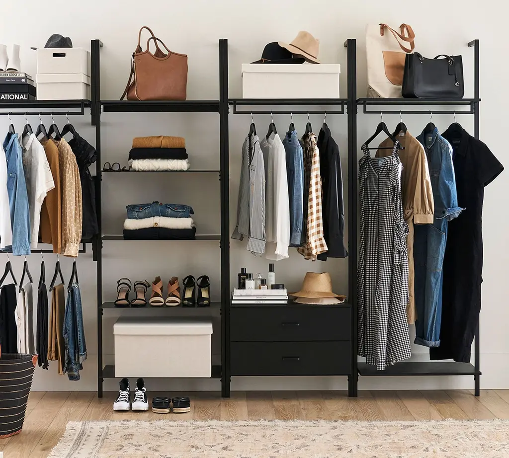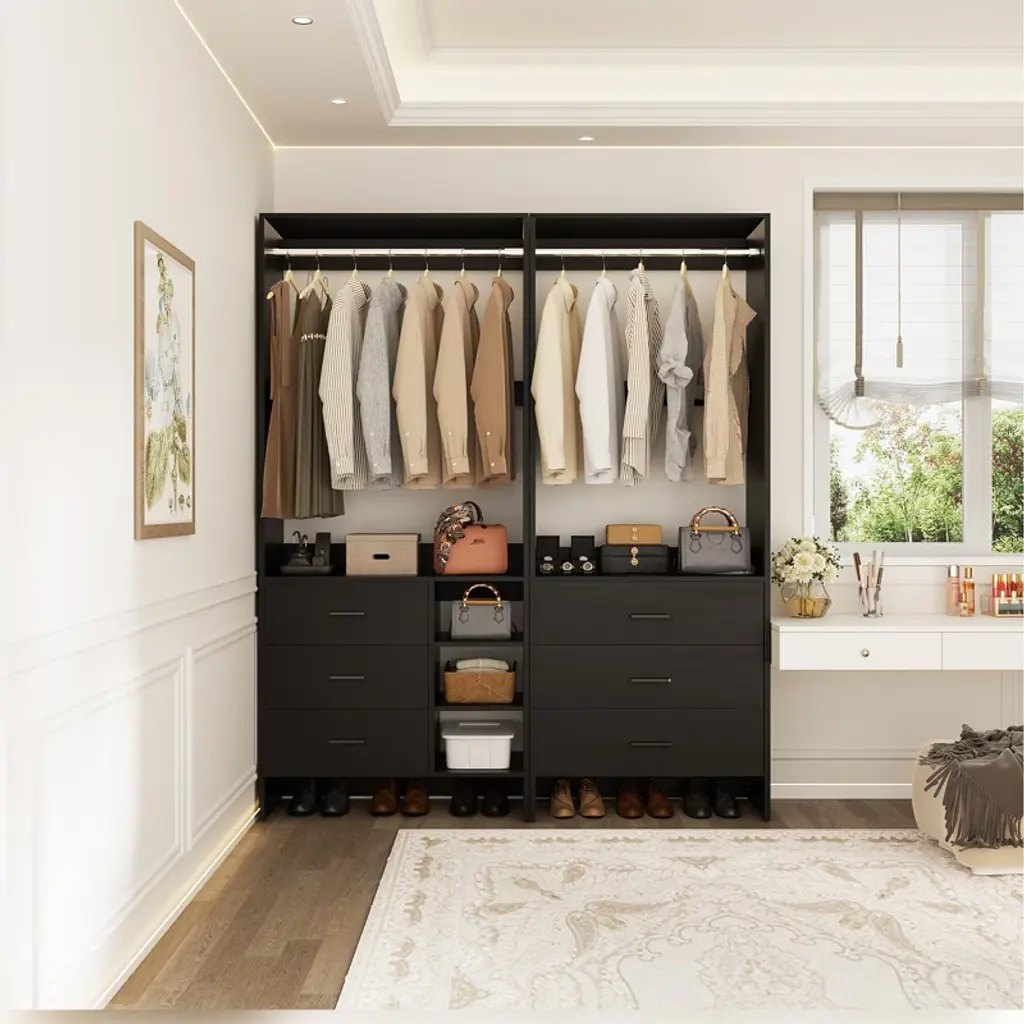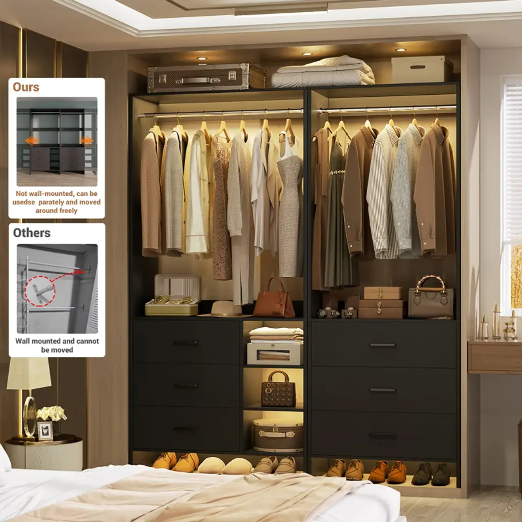 An innovative and comprehensive storage solution designed to transform your wardrobe into a haven of organization. With its wide top, sturdy hanging rods with 150LBS capacity each and 1200+LBS total capacity, and spacious drawers, this freestanding unit offers unparalleled customization and versatility, perfect for any space in your home. Elevate your storage game with the Freestanding Closet System and experience the joys of a well-organized, efficient, and stylish closet.