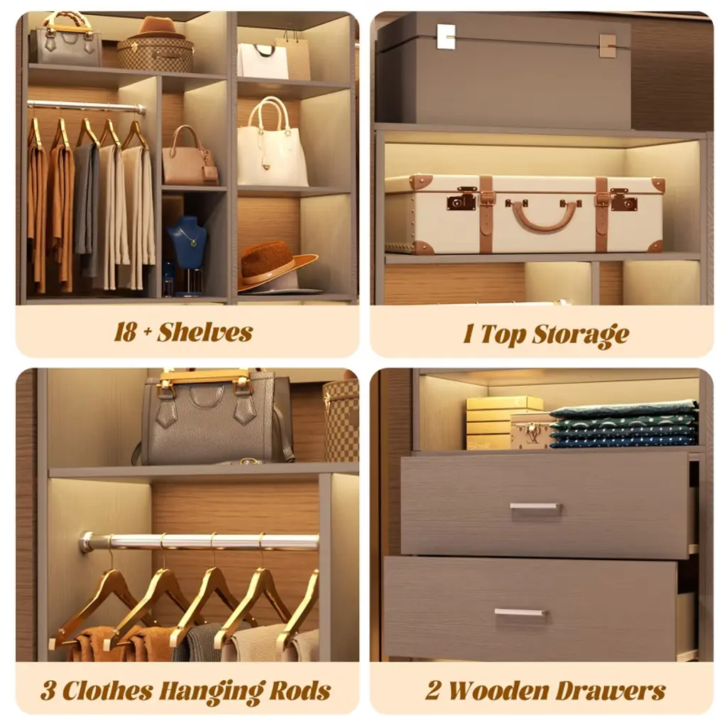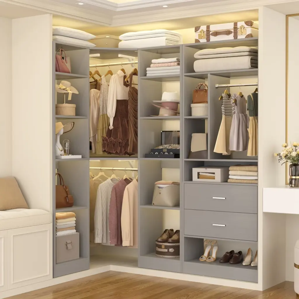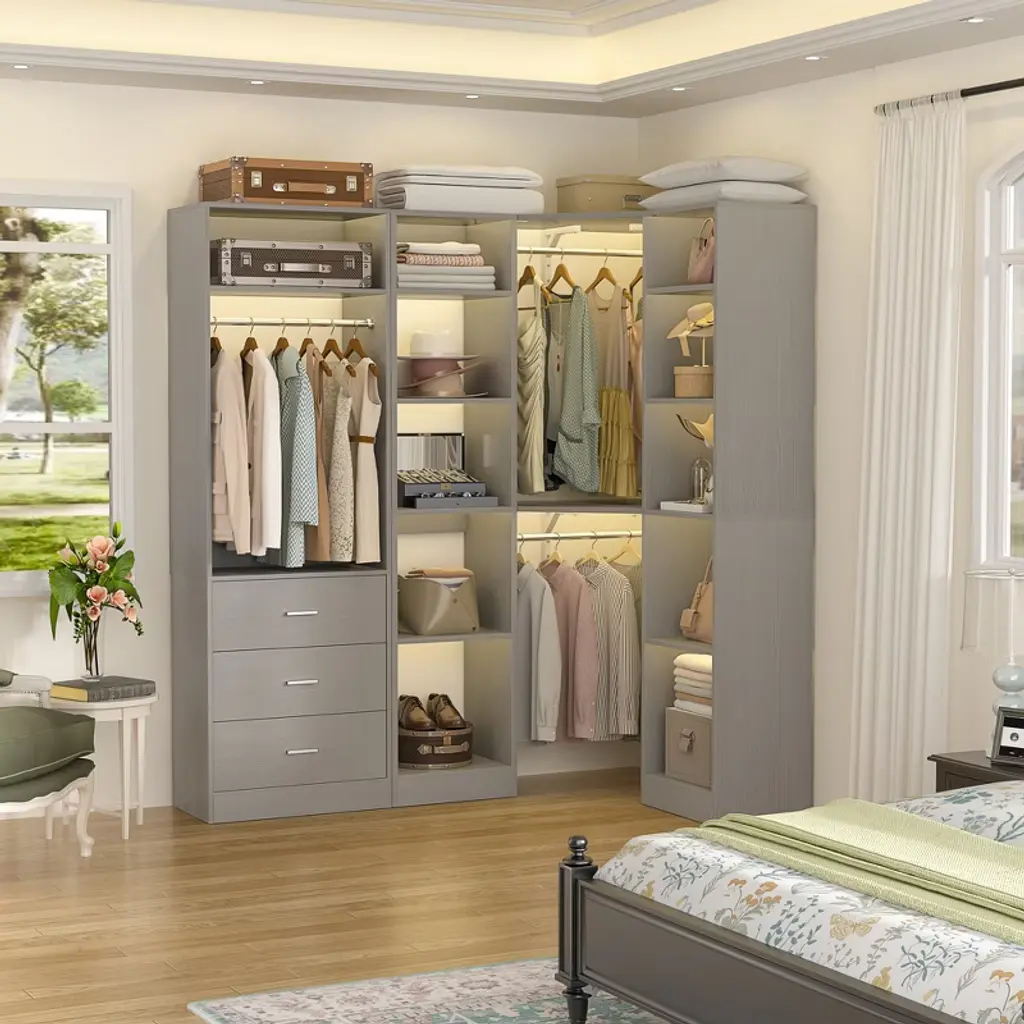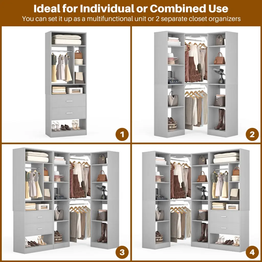 Transform your cluttered closet into a sleek, organized haven with our 2-in-1 Corner Closet System—designed to maximize every inch of your space. Perfect for walk-in closets, this heavy-duty organizer combines 15+ shelves, 2 spacious wooden drawers, 3 adjustable hanging rods, and dedicated shoe storage to hold 400+ items—from jackets and jeans to bags and accessories. No more wasted corners or overflowing drawers!