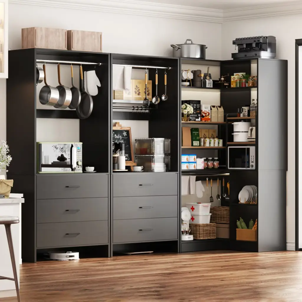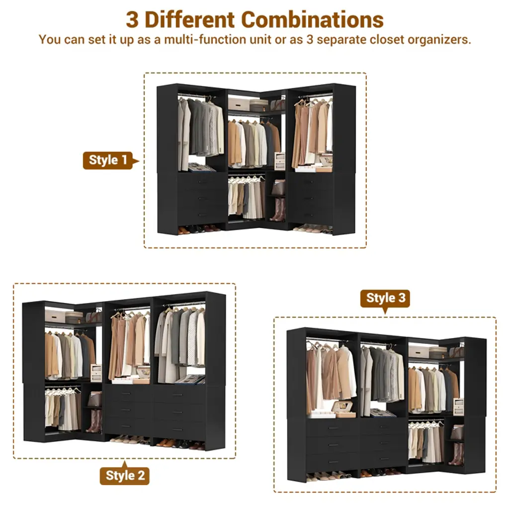 Transform your closet from cluttered chaos to a well-organized haven with the Set of 3 Closet System. Whether you have a small utility closet or a spacious bedroom, this system adapts to any environment, enhancing your storage capabilities. Keep your belongings neatly arranged and easily accessible with the combination of hanging rods, shelving, and drawers. The corner organizer ensures that even the most challenging areas of your closet are utilized efficiently, transforming wasted space into valuable storage. Built to last, this closet system offers a versatile and durable solution that will meet your storage needs for years to come. What's Included: 1 * 33.5'' corner organizer 2 * 23.7'' regular organizer