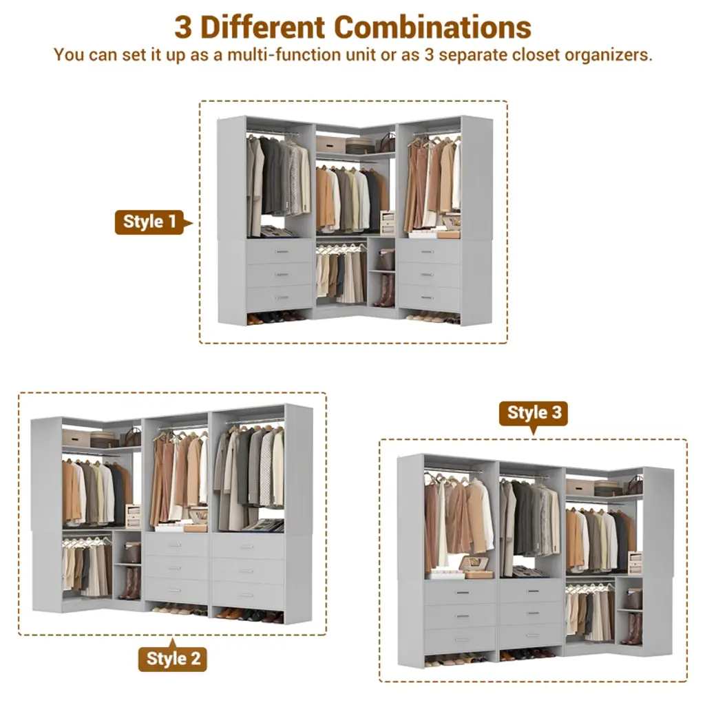 Transform your closet from cluttered chaos to a well-organized haven with the Set of 3 Closet System. Whether you have a small utility closet or a spacious bedroom, this system adapts to any environment, enhancing your storage capabilities. Keep your belongings neatly arranged and easily accessible with the combination of hanging rods, shelving, and drawers. The corner organizer ensures that even the most challenging areas of your closet are utilized efficiently, transforming wasted space into valuable storage. Built to last, this closet system offers a versatile and durable solution that will meet your storage needs for years to come. What's Included: 1 * 33.5'' corner organizer 2 * 23.7'' regular organizer