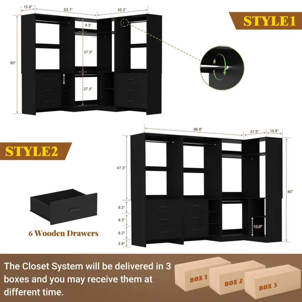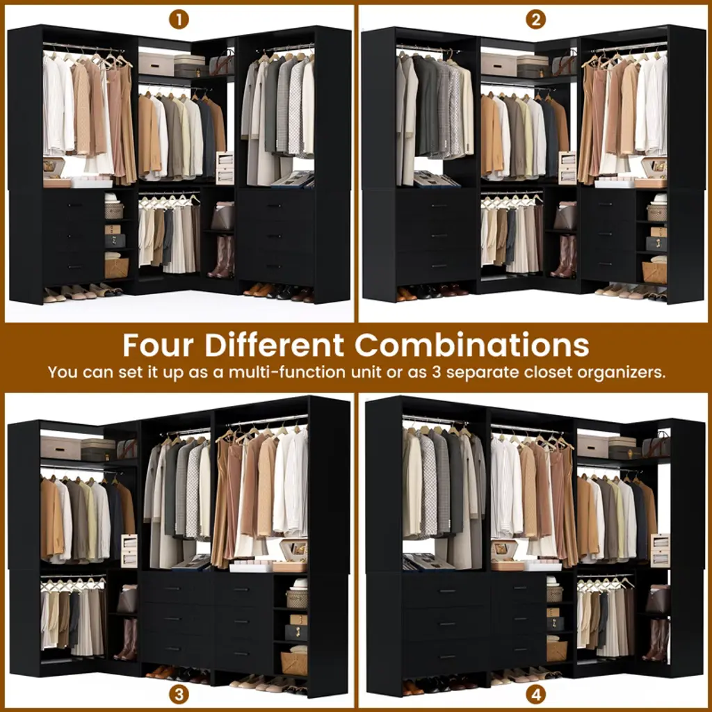 Transform your closet from cluttered chaos to a well-organized haven with the Set of 3 Closet System. Whether you have a small utility closet or a spacious bedroom, this system adapts to any environment, enhancing your storage capabilities. Keep your belongings neatly arranged and easily accessible with the combination of hanging rods, shelving, and drawers. The corner organizer ensures that even the most challenging areas of your closet are utilized efficiently, transforming wasted space into valuable storage. Built to last, this closet system offers a versatile and durable solution that will meet your storage needs for years to come. What's Included: 1 * 33.5'' corner organizer 1* 23.7'' regular organizer 1* 29.6'' regular organizer