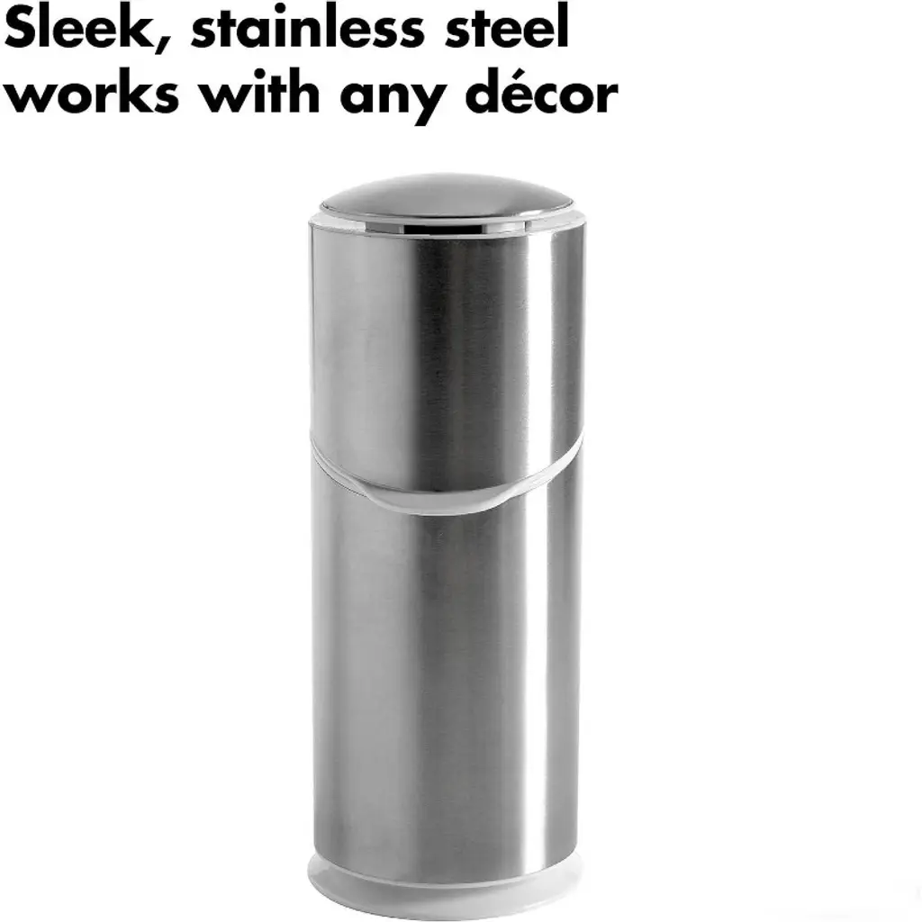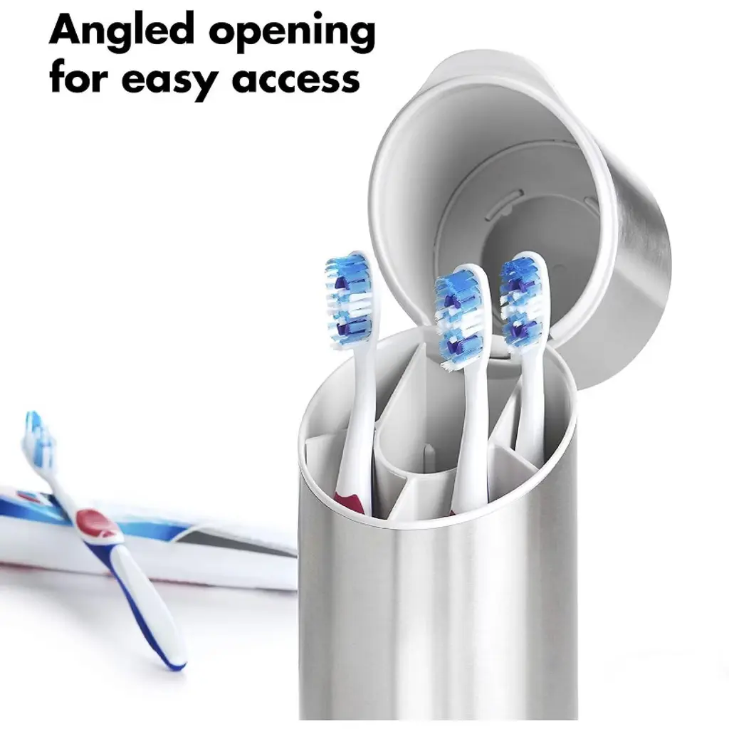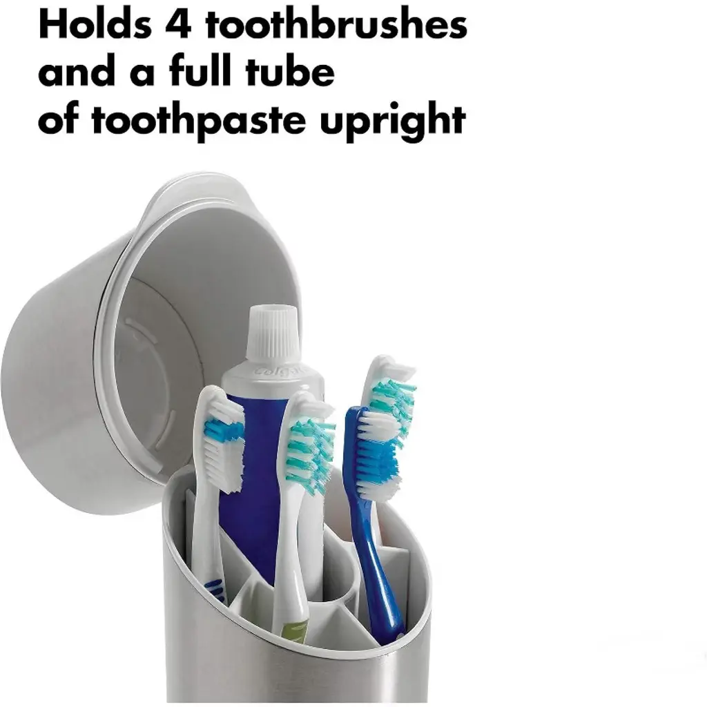 This stainless steel toothbrush organizer measures 4.13"L x 3.75"W x 9.5"H, featuring a freestanding design that requires no additional installation, allowing easy placement on bathroom countertops. It can hold up to 4 toothbrushes and a full tube of toothpaste, meeting daily family use needs. The angled opening design enables convenient access to toothbrushes, while the top and bottom ventilation slots effectively keep the interior dry and prevent bacterial growth. It has a removable divider with flexible grips around it, which can securely hold toothbrushes and avoid contact between brush heads for more hygienic use. Made of rustproof stainless steel, it is durable and easy to clean, adding tidiness and texture to bathroom storage.