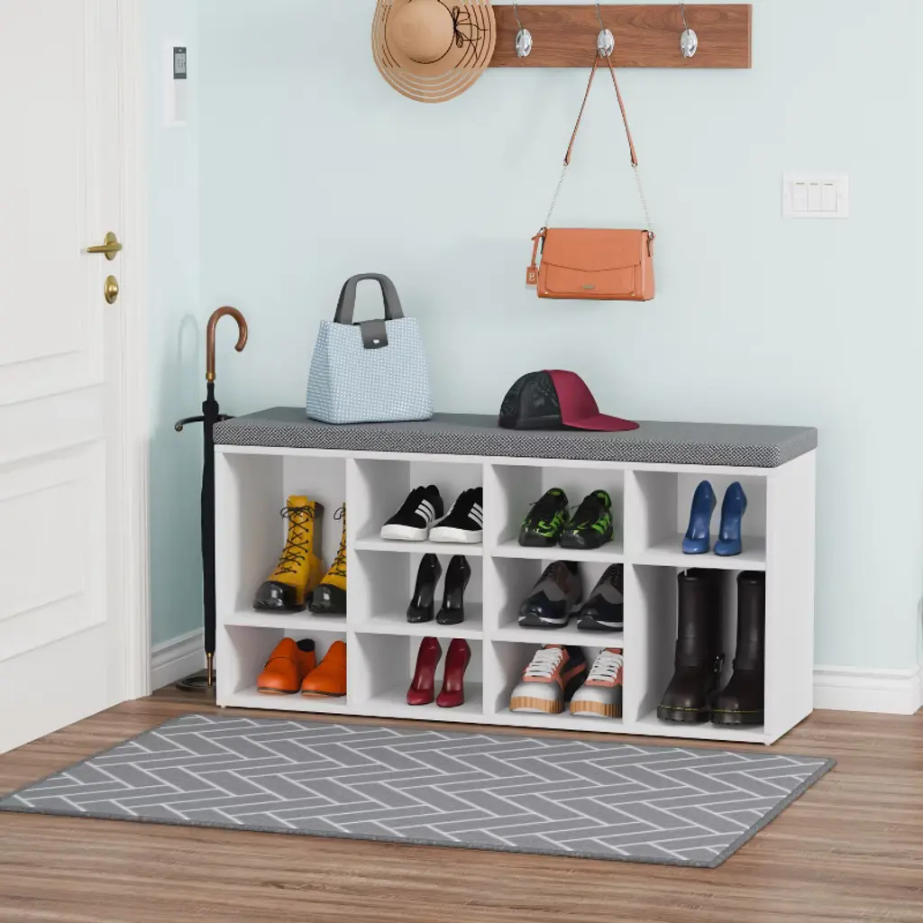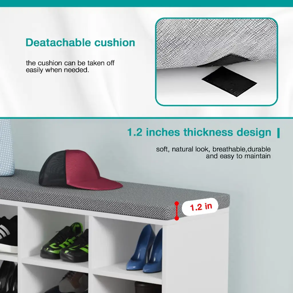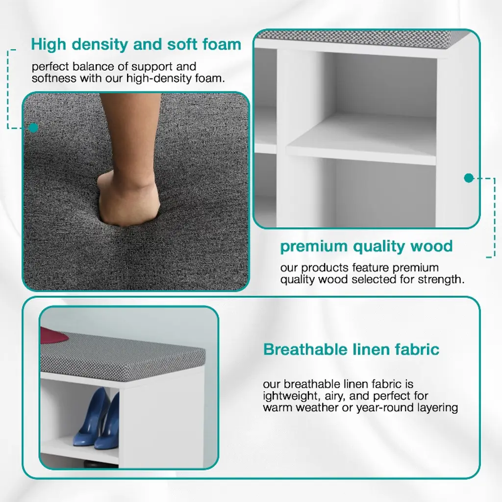 BestMassage Versatile Shoe Bench that combines storage, seating, and style. Featuring 10 compartments, it accommodates up to 10 pairs of shoes, keeping your space tidy and functional. With a compact, three-tier design, it maximizes storage for shoes, bags, and decor, making it perfect for small spaces. Constructed from sturdy particle board, this bench supports up to 600 lbs.The removable, washable cushion, covered in soft cotton-linen fabric, is secured with Velcro, preventing it from shifting. Designed for easy setup, this bench comes with clearly marked parts and instructions, ensuring effortless assembly. Our support team is here to assist if you have any questions, ensuring your satisfaction.