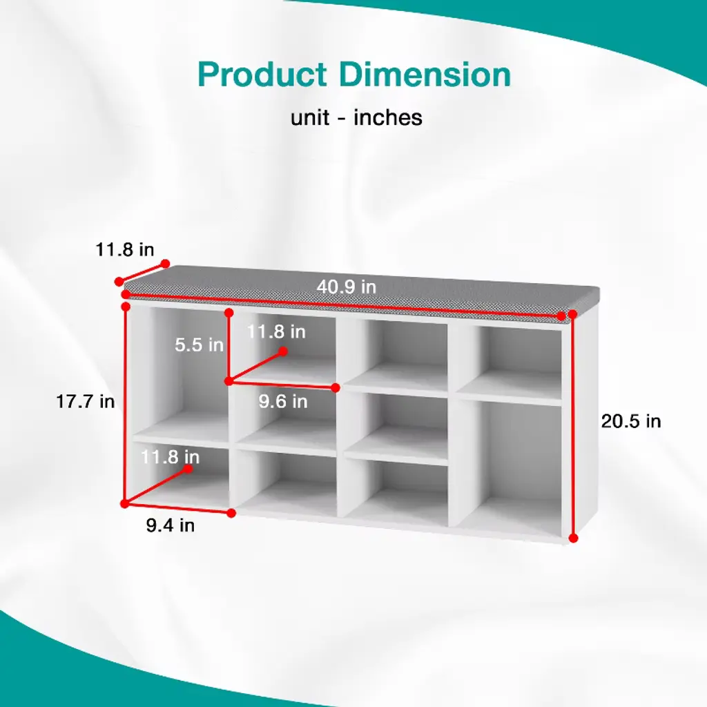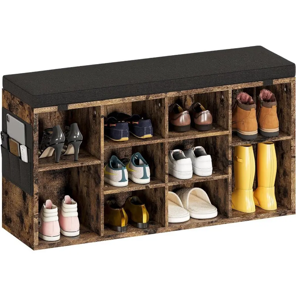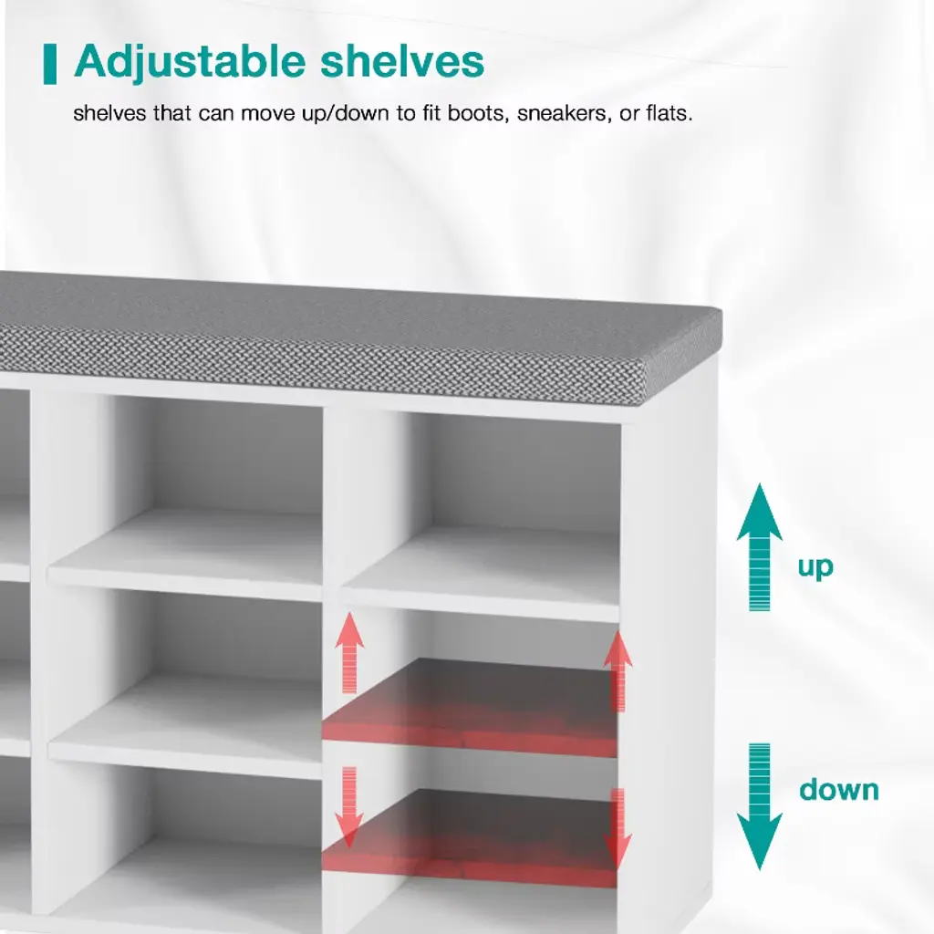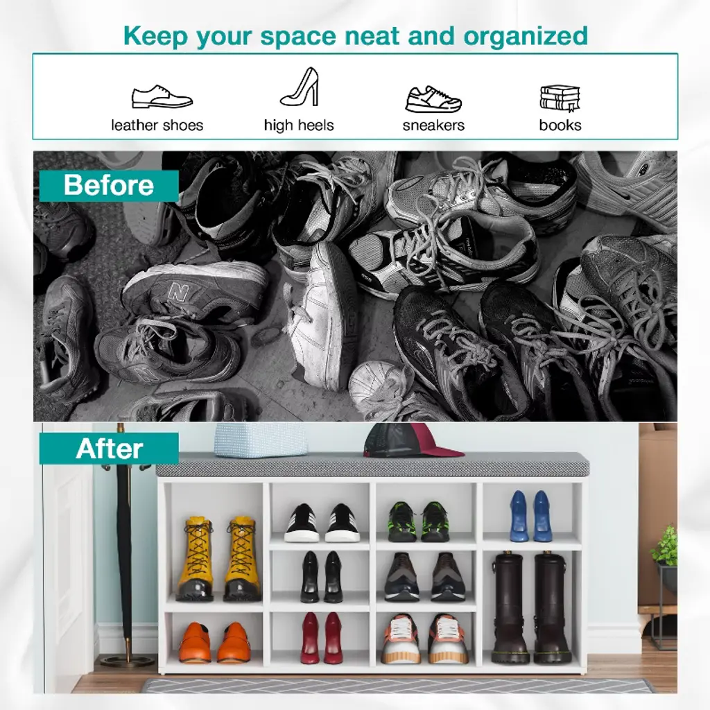 BestMassage Versatile Shoe Bench that combines storage, seating, and style. Featuring 10 compartments, it accommodates up to 10 pairs of shoes, keeping your space tidy and functional. With a compact, three-tier design, it maximizes storage for shoes, bags, and decor, making it perfect for small spaces. Constructed from sturdy particle board, this bench supports up to 600 lbs.The removable, washable cushion, covered in soft cotton-linen fabric, is secured with Velcro, preventing it from shifting. Designed for easy setup, this bench comes with clearly marked parts and instructions, ensuring effortless assembly. Our support team is here to assist if you have any questions, ensuring your satisfaction.