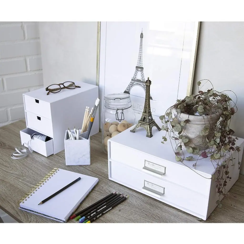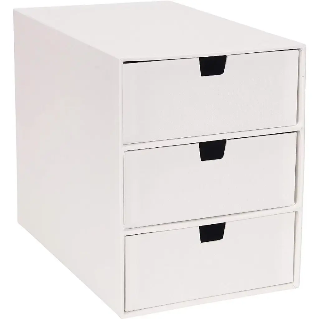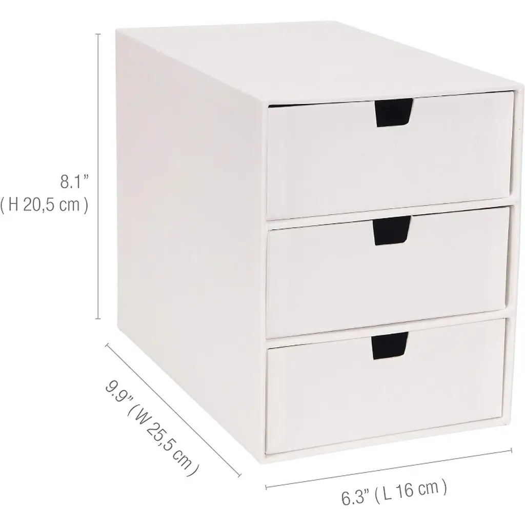 Bigso’s Ingrid 3-Drawer Fiberboard Desk Organizer makes organization easy and helps you maximize your desktop space. It is an attractive decorative container that keeps supplies and other small accessories in one place and declutters your workspace. The 6.3in x 9.9in x 8.1in size allows it to hold small office supplies and cosmetic items like makeup and jewelry. This desk organizer is stackable and the completely removable drawers slide out smoothly with help from the cut-out handles. Each drawer is 5.81in wide x 10.62in deep x 2.44in tall.