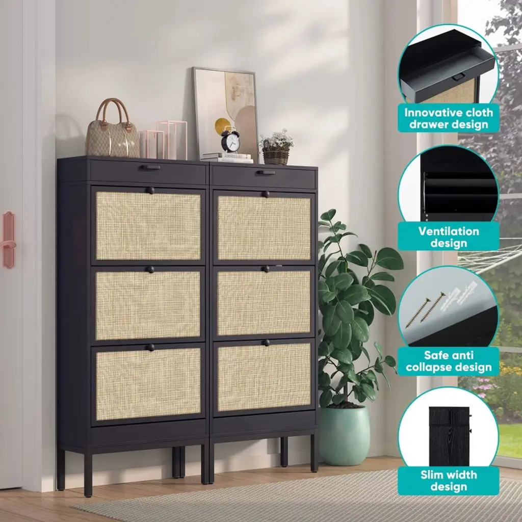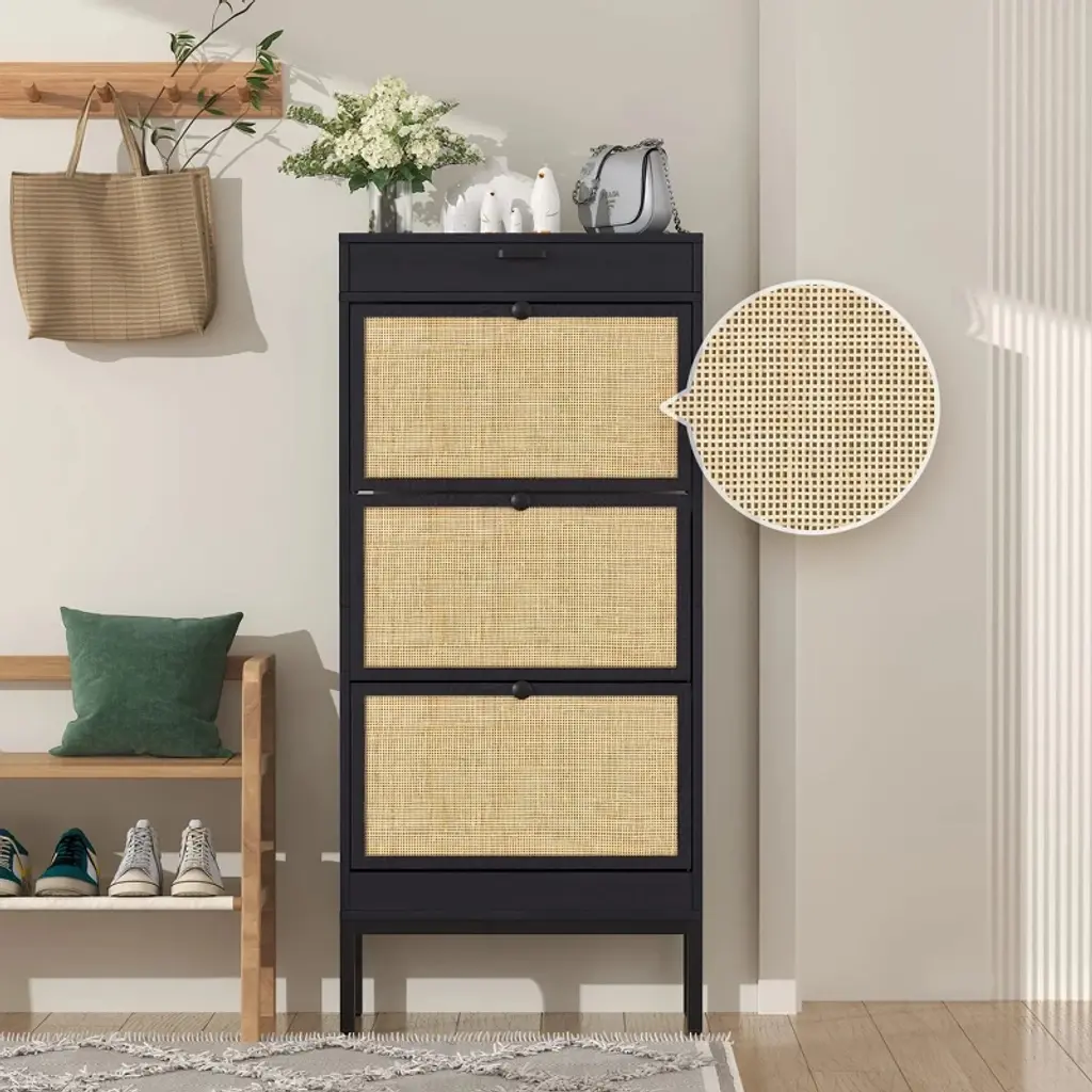 Brafabhome Rattan Shoe Storage Cabinet With 3 Flip Drawers, Freestanding Narrow Entryway Shoe Organizer For Slippers, Sneakers, Boots, Holds 18 Pairs
