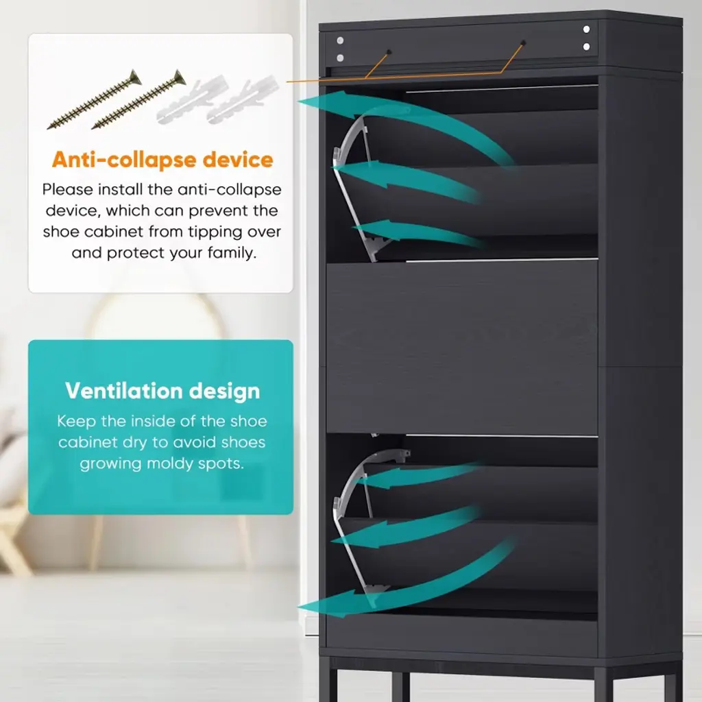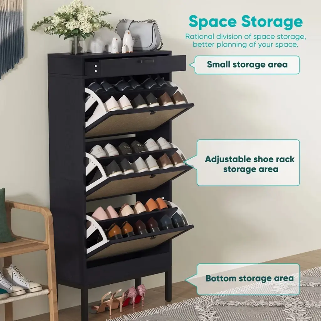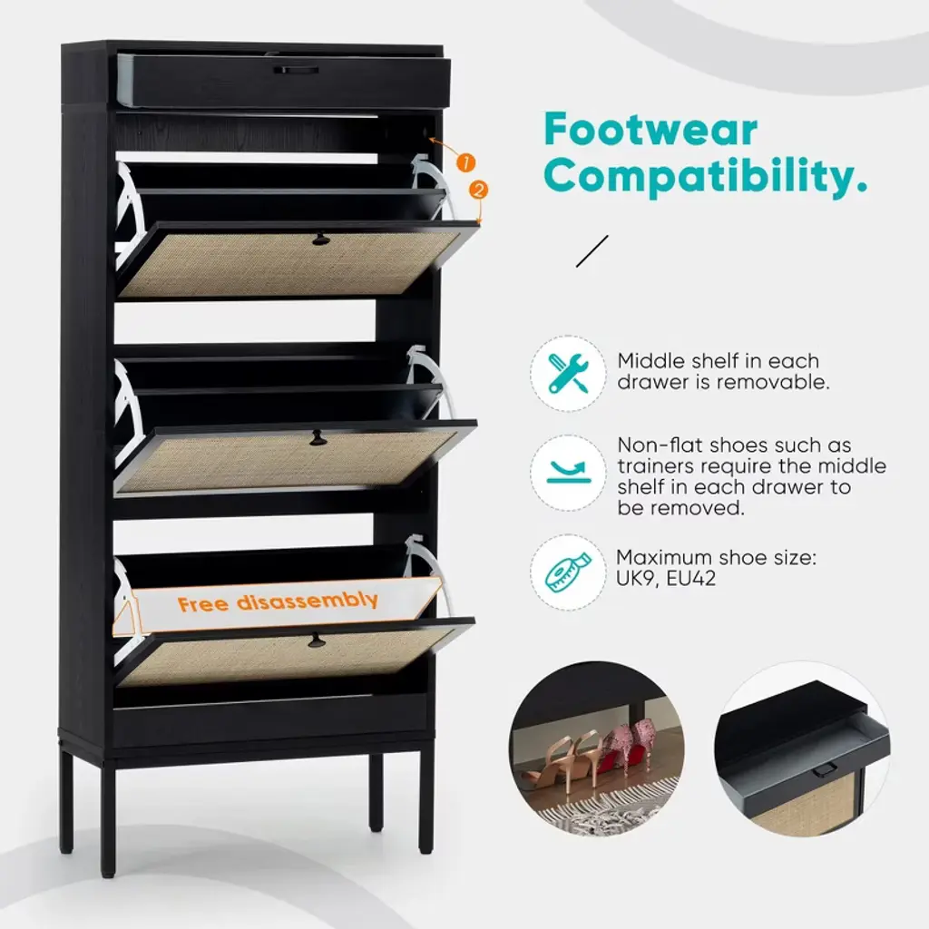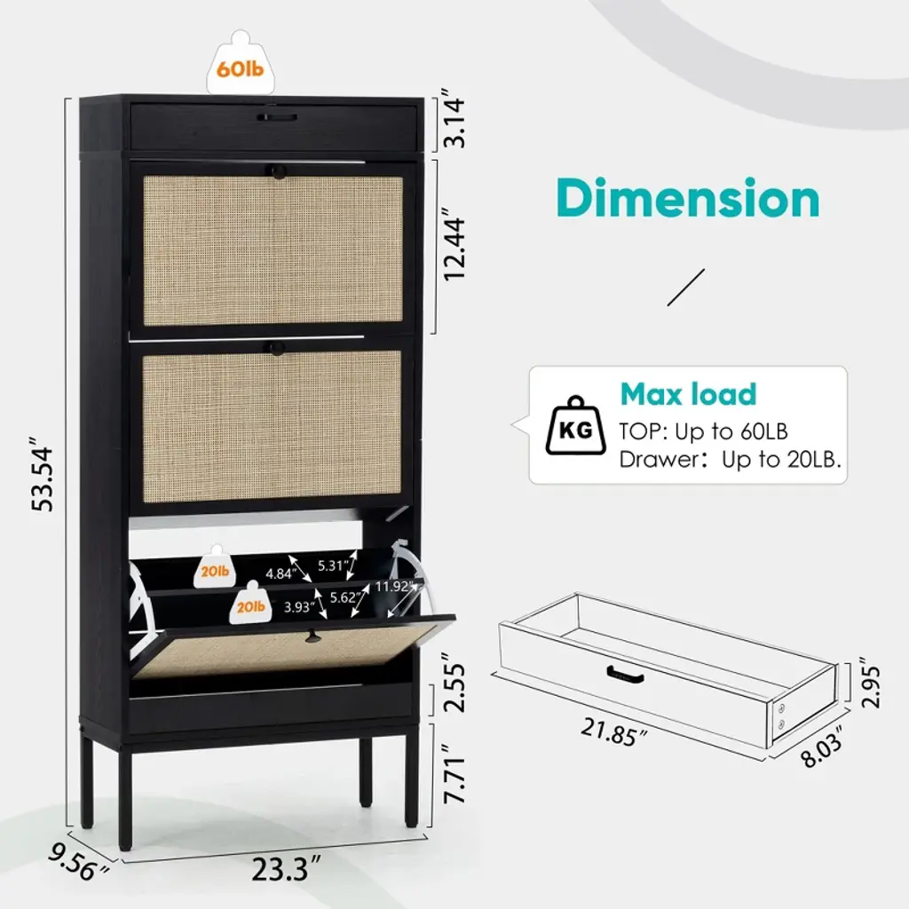 Specifications: Material: Wood+Nature Rattan+Metal. Care Instructions:Wipe with Dry Cloth. Color: Black. Drawer: 3 Flip Drawer. Shoes Capacity: 18 pairs. Shoe Cabinet Measuring: 23.3"L x 9.56"W x 53.54"H. Drawer Measuring: 21.85"L x 8.03"W x 2.95"H. Shoe Cabinet Weight Capacity:60 lbs. Drawer Weight Capacity:20 lbs. Required Assembly:Yes. Room Type: Entryway, Hallway, Living Room, Dorm. Recommended Use: Shoe Storage Cabinet, Shoe Storage Closet, Shoe Storage Organizer, Wood Shoe Racks, Shoe Cabinet,Shoes Locker, Shoe Drawers Wardrobes,Shoe Dresser, Shoe Holder Floor. Great gifts for your family or friend, suitable for Christmas, Thanksgiving Day, Mother's Day, Father's Day, Birthday, Valentine's Day. Package Content: 1 x Rattan Shoe Cabinet. 1 x Accessory Kit. 1 x Instructions.