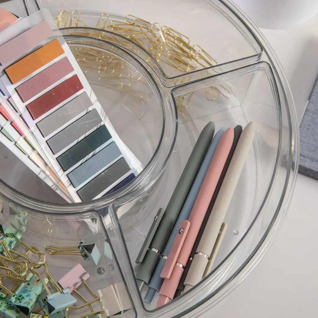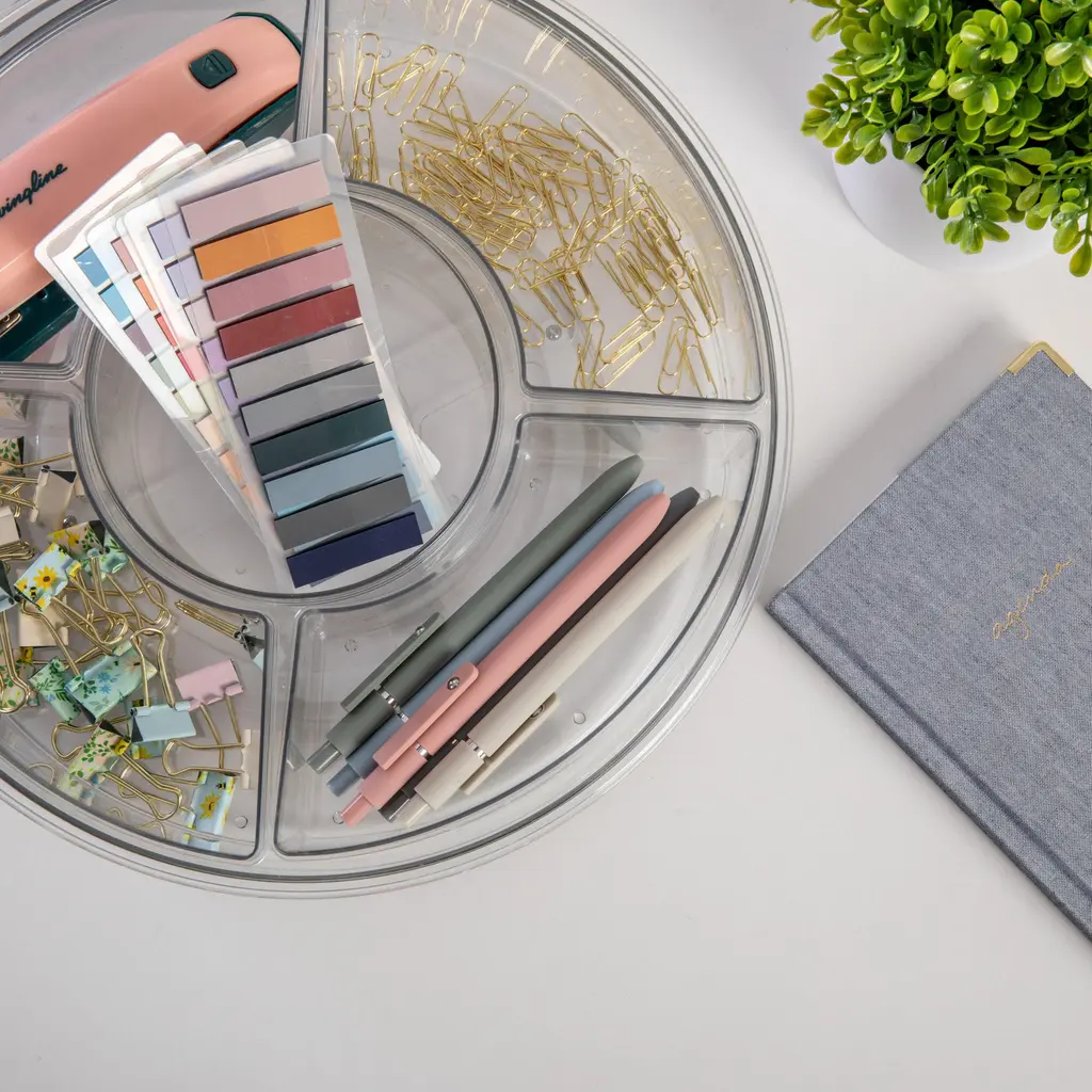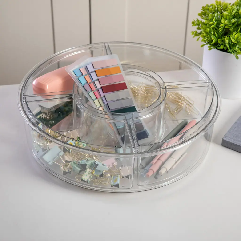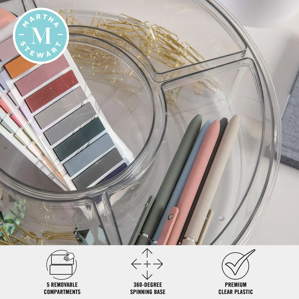Whether it's paperclips and push pins or cotton balls and nail polish, the Martha Stewart 12 Inch Lazy Susan Organizer will keep your desktop, countertop, and vanity surfaces neat and tidy. Comprised of transparent, crack-resistant, premium, BPA-free plastic, this compact organizer provides line of sight for each divided section so there is no guesswork in retrieving your items. Five removable compartments, four outer bins, and one center bin paired with 360° swivel allows you to easily reach your supplies and accessories while the deep outer walls keep everything in place during rotation. Non-slip feet ensure the unit stays safely and securely where you place it and a damp cloth makes cleanup a breeze. Add this compact storage center to any room in your home to help manage clutter and locate your items.