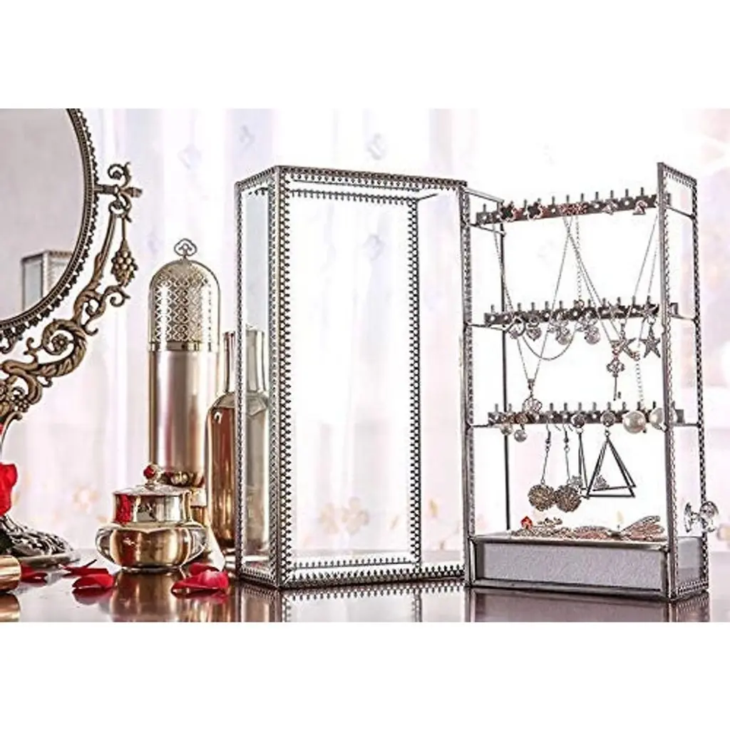 EARRING HOLDER: crystal clear glass earring holder is handcrafted with exquisite precision to ensure superior quality. Constructed of durable, impact resistant glass with copper to assure sturdiness and long lasting durability. MULTI-PURPOSE: This holder contains 3 rows, each row has 13 holes, 12 grooves for necklaces and a removable ring holder, which could hold up to 19 pairs of earrings and 12 pairs of rings. DUST-PROOF: Keep your precious jewelry free from dust particles from entering the holder, keeps your jewelry neat and tidy. ANTIQUE DESIGN: Inspired by professional makeup artists, you will notice this transparent storage make you easy to spot the one you need also display your collection. Save space and keep organized. It can be placed on your counter top or dresser, making your counter neater with more space. PERFECT GIFTS: This earring holder is the best valentine gifts, birthday gifts, anniversary gifts for your wife, girl friends, someone who loves make up or that special person in your life.