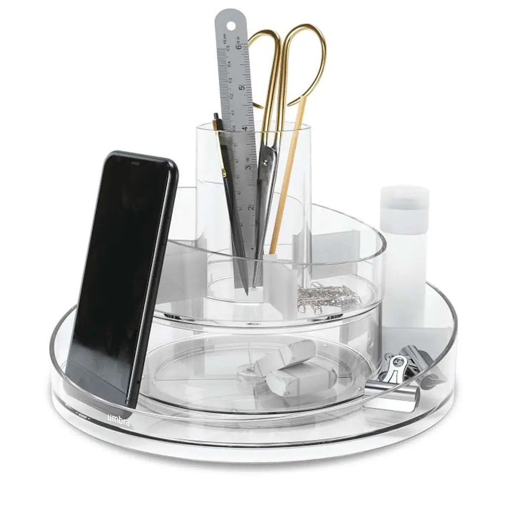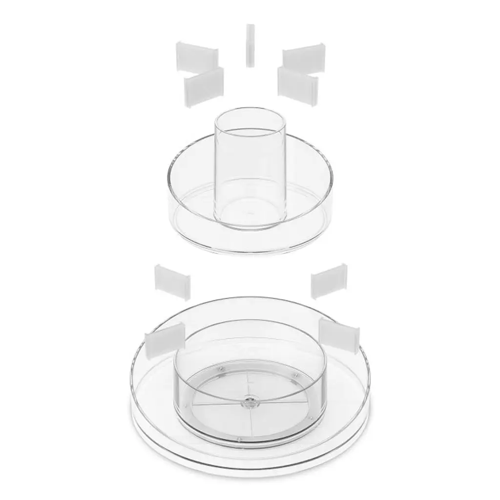 A modern take on organization, the Cascada Cosmetics Organizer has multiple tiers and compartments to store all your accessories or cosmetics and keep your countertop clutter free. 9.8"diam. x 6.7"h. ABS plastic in a Clear finish. 2 stackable compartments. 9 removable dividers. Swivel base. Sold individually. Made in China.