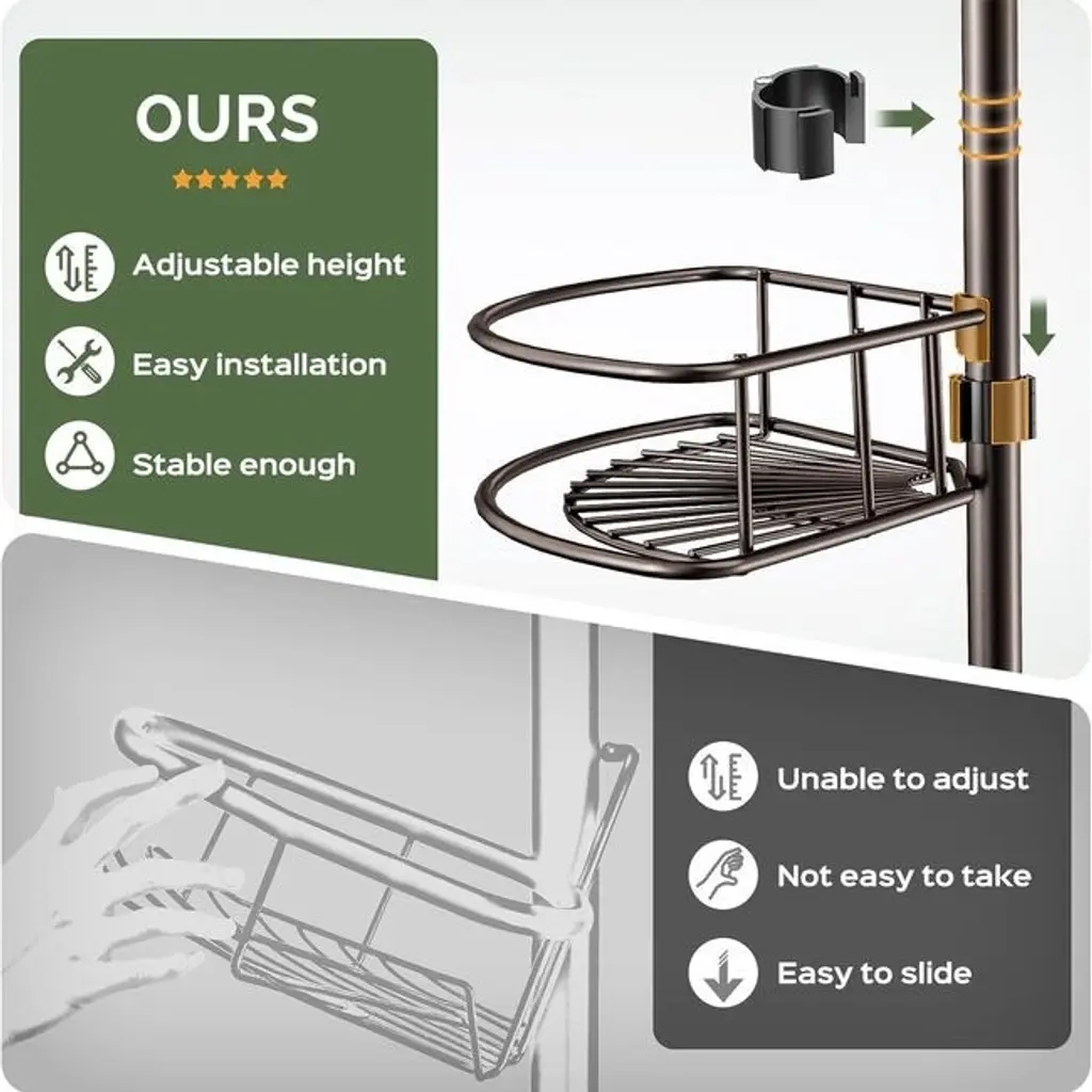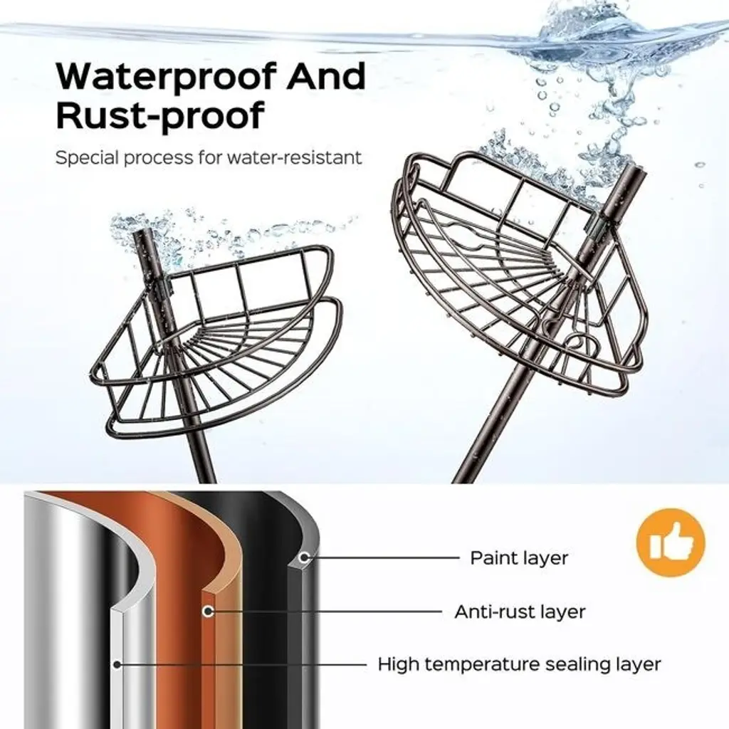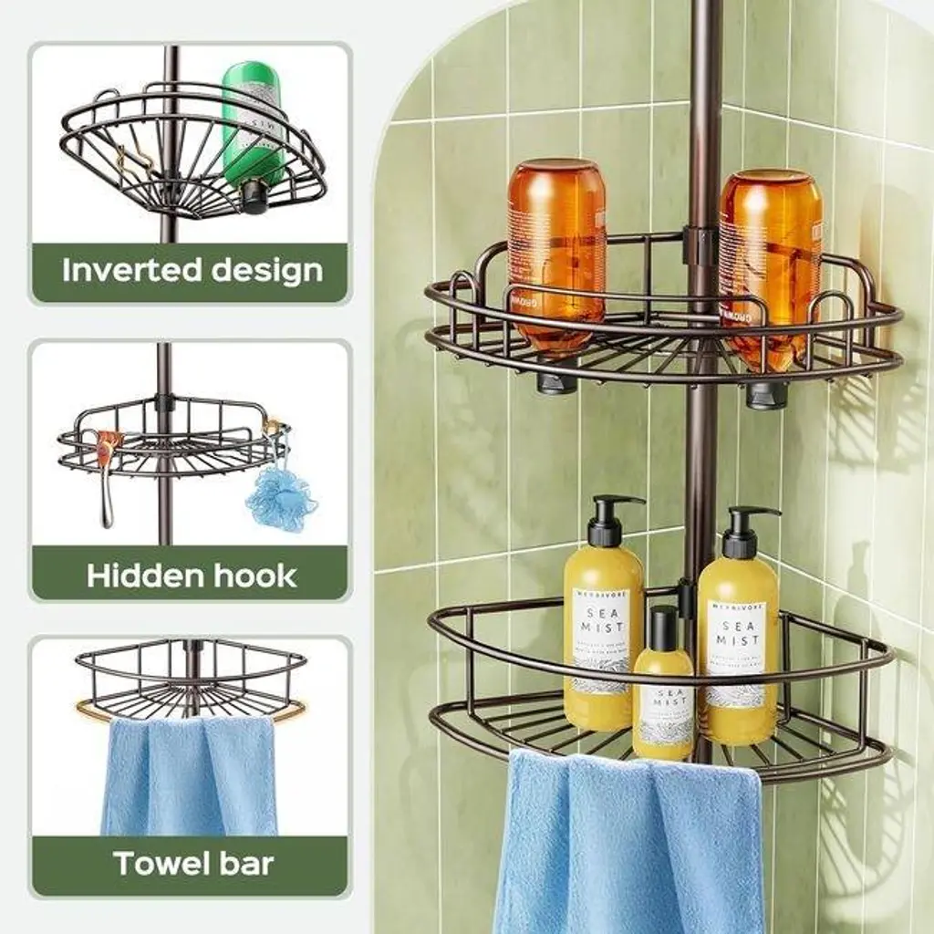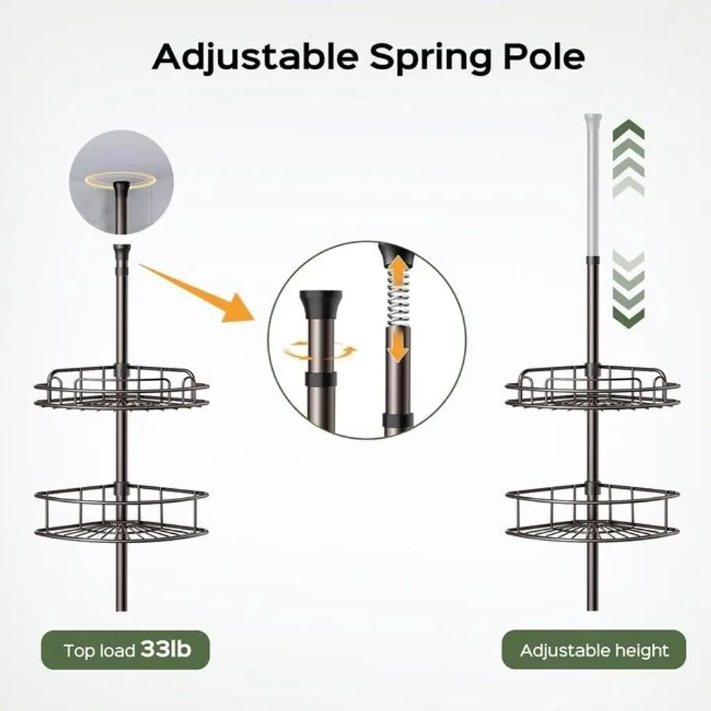 RELIABLE NON-TIP DESIGN: Featuring stable construction, each shelf has a high weight capacity and can hold large shampoo bottles weighing up to 20 pounds. The height of the shelf can be adjusted in just 2 seconds with the clip-on clips. The telescoping bar at the top stabilizes the shower shelf and prevents it from loosening or sliding. No more worries about falling!QUICK INSTALLATION WITHOUT DRILLING: Perfect for renters and small bathrooms, the Corner Shower Shelf is easy to move around without tools or permanent installation. Tool-free installation takes only a few minutes, perfect for DIY enthusiasts. NOTE: This shower rod is not suitable for sloped ceilings.RUST AND WATERPROOF MATERIAL: Made of stainless steel and coated metal for durability against wet conditions. Each shower shelf is durable, rust and scratch resistant. Hollow design allows for good ventilation and drainage, easy to cleanMULTI-TIERED BATHROOM ORGANIZATION: The corner shower caddy features 4 tiers of large shelves for high-capacity vertical storage for organizing shampoos, conditioners and other toiletries for the whole family. Hidden hooks are ideal for hanging razors, loofahs, towels, sponges and other small accessories.SPACE-SAVING CORNER DESIGN: With flexible height adjustment, it maximizes the corner space in the shower stall, suitable for homes, apartments, RVs, bathtubs and bathrooms where space is at a premium.