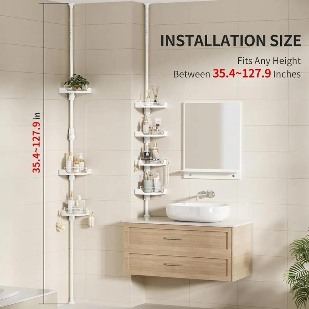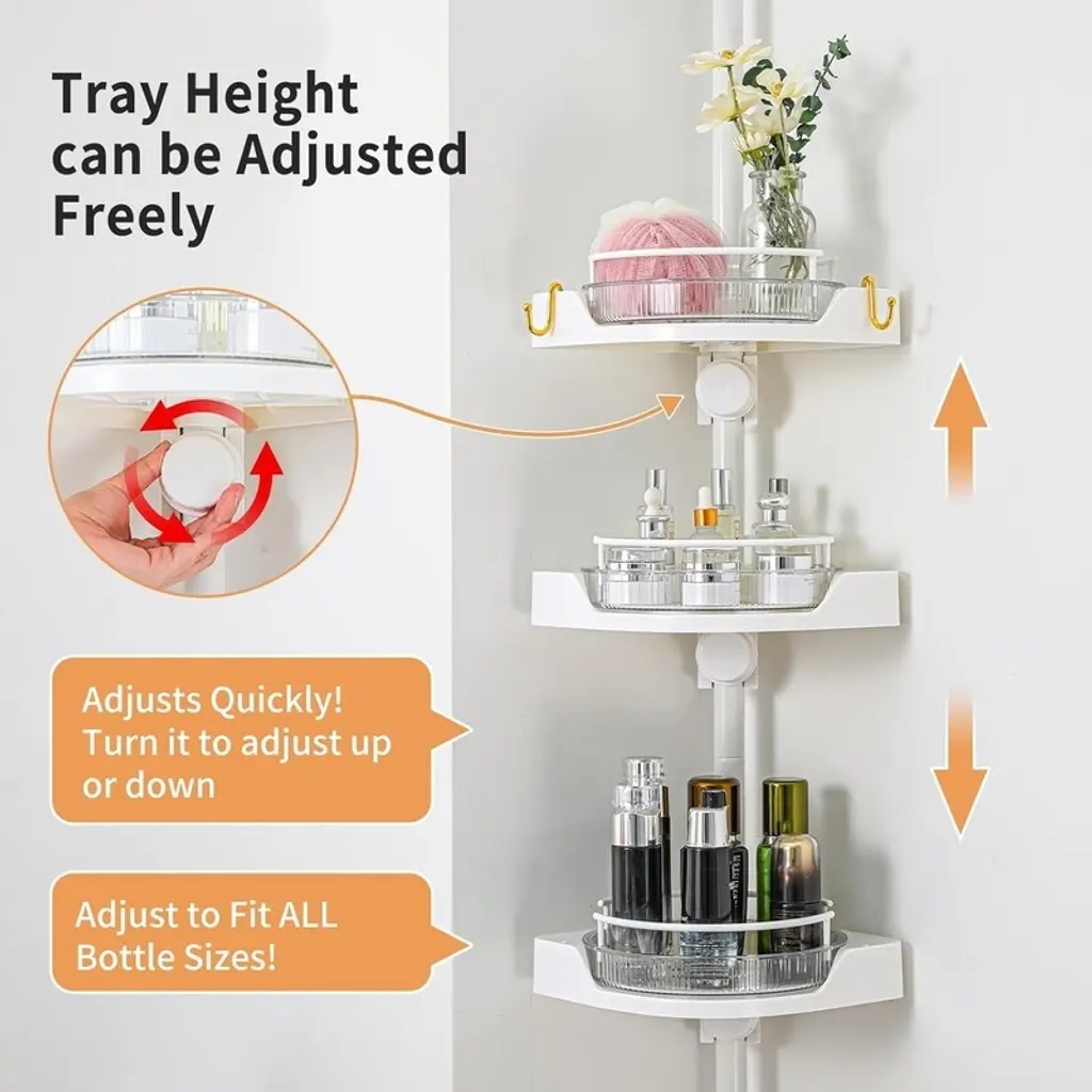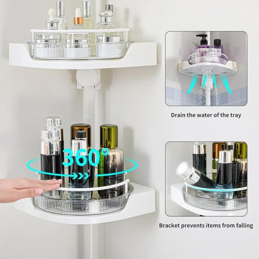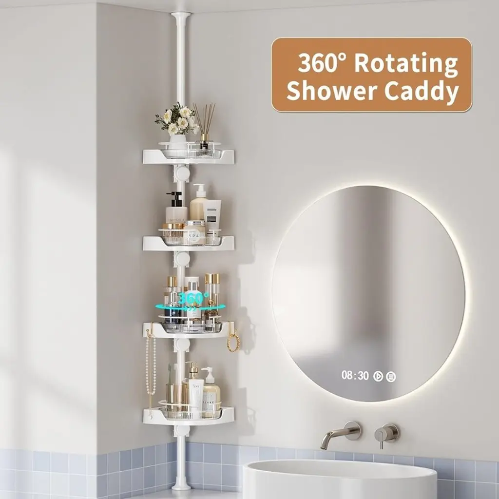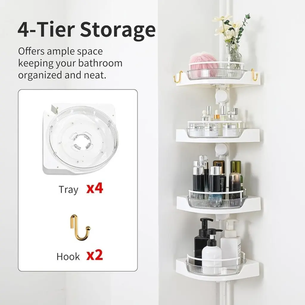 Corner Shower Caddy Tension Pole Organizer - 4-Tier 360° Rotating Plastic Shelves, Adjustable Rustproof Bathroom Storage - White