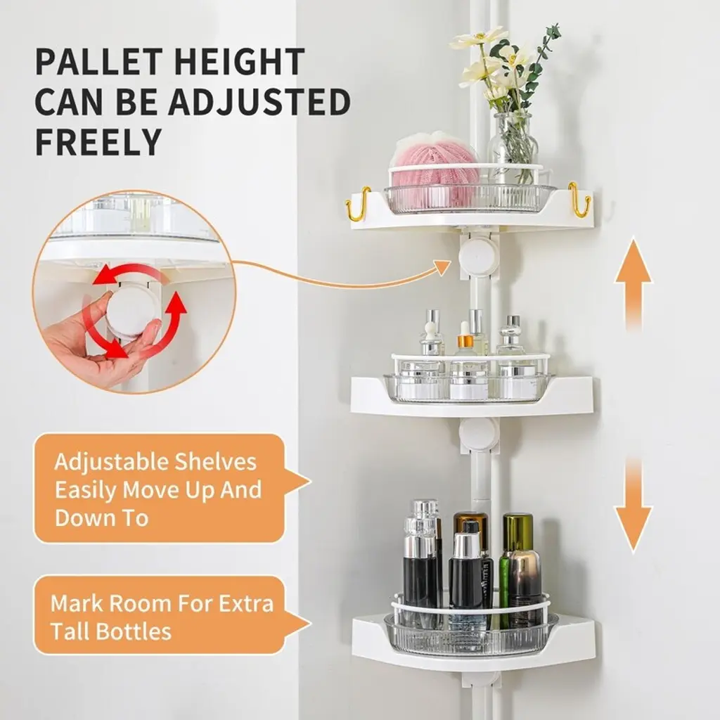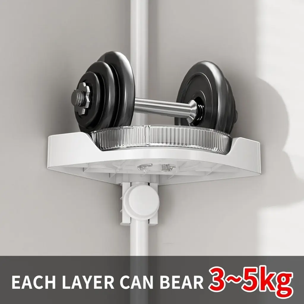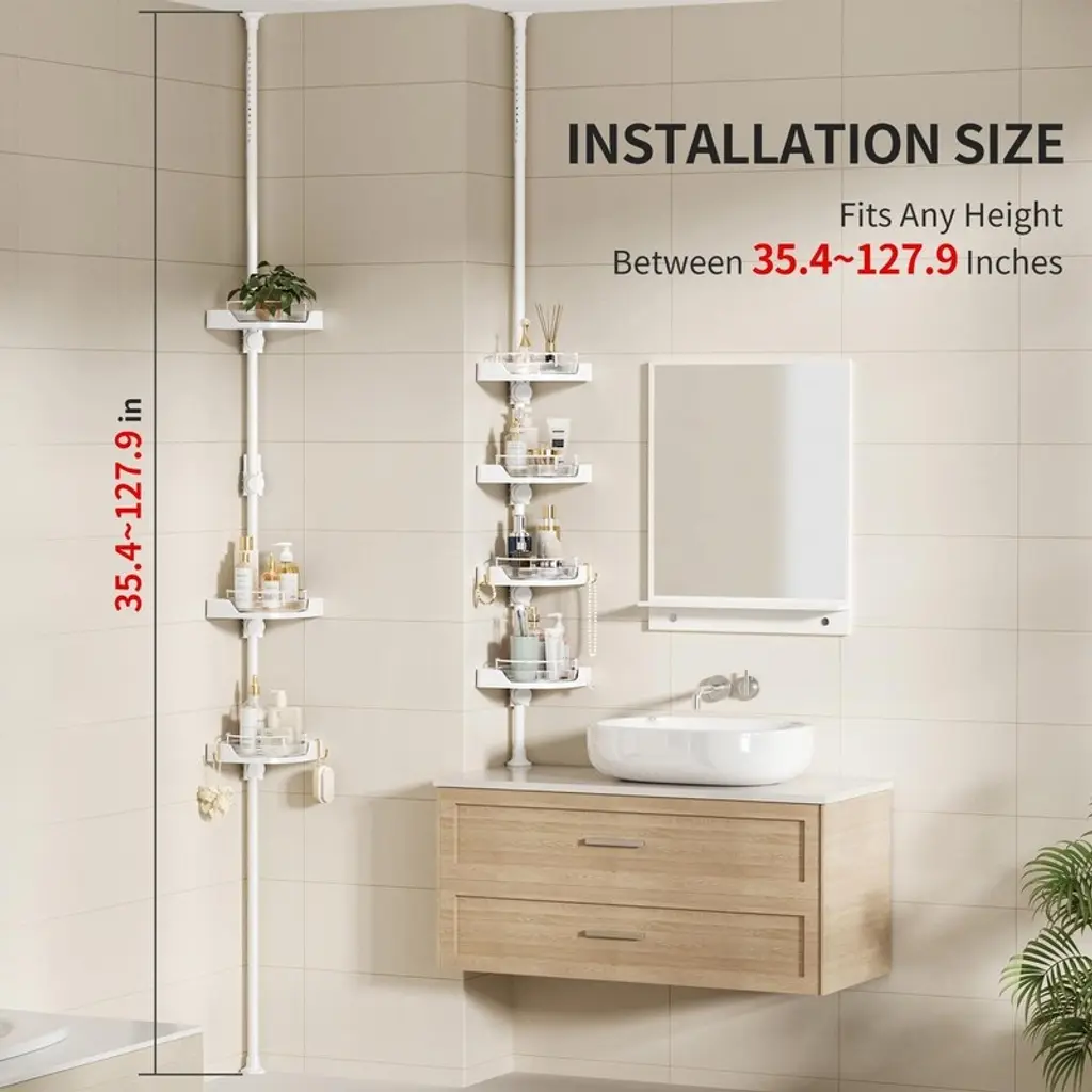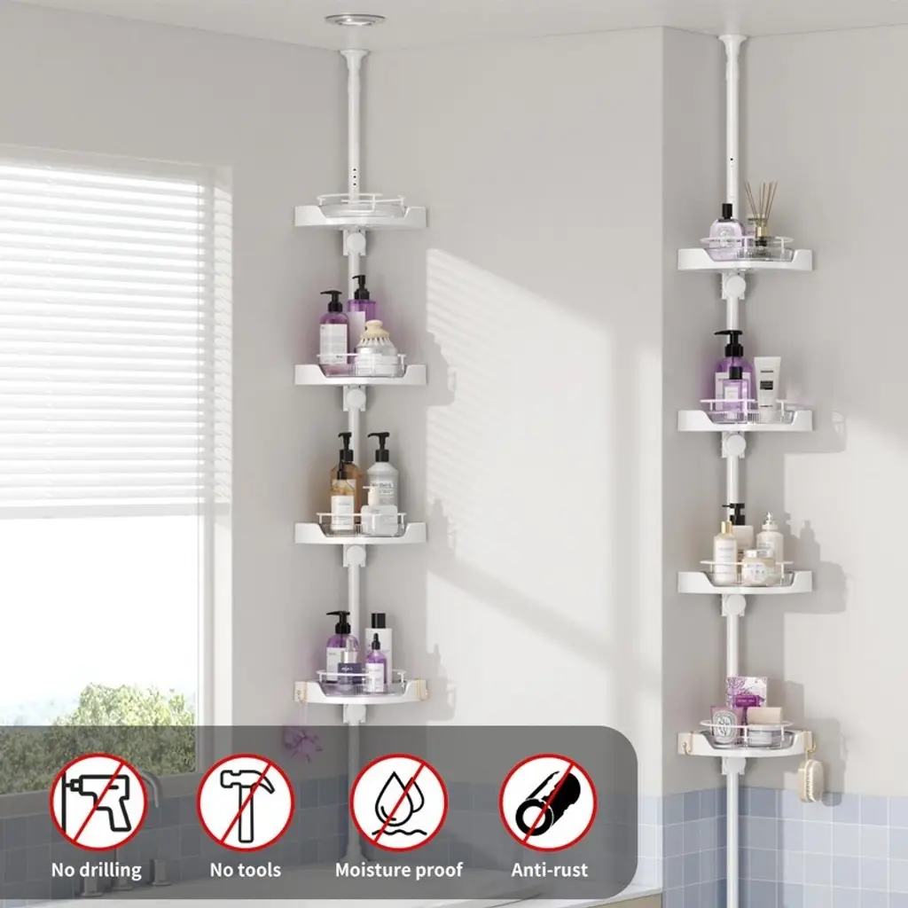Enjoy complete customization with easy-to-turn adjustment knobs that let you modify shelf heights in seconds. The secure locking mechanism keeps trays firmly in place while allowing effortless reorganization whenever your storage needs change.Designed for universal placement, this versatile caddy adjusts from a compact 35.4" to an expansive 127.9" to fit virtually any space. Whether installed in showers, placed between laundry room walls, or used freestanding in kitchens, it adapts perfectly to your unique space requirements.Perfect for mobile lifestyles, this organizer requires zero tools for installation or relocation. The tension rod system makes it ideal for temporary living situations - easily set it up in dorms, rental properties, or RVs, then take it with you when you move.Four spacious draining trays provide generous storage, each supporting up to 5kg (11lbs) of weight. The ample capacity comfortably holds all bathroom essentials or kitchen supplies while promoting proper air circulation and quick drying.Each tray rotates 360° for convenient access from any angle, while protective guardrails keep items securely contained. The smart design prevents spills while allowing you to effortlessly reach shampoos, soaps, or cleaning products without rearranging the entire caddy.Constructed from heavy-duty PET plastic and corrosion-resistant electroplated metal, this caddy withstands daily use in wet environments. The waterproof materials resist rust and deterioration, maintaining structural integrity even in humid showers or busy kitchens.