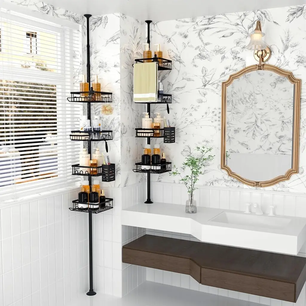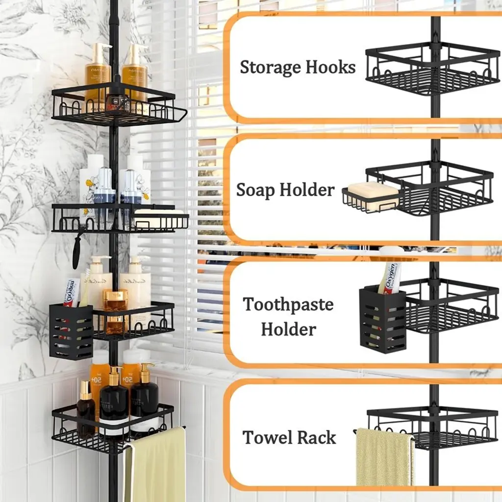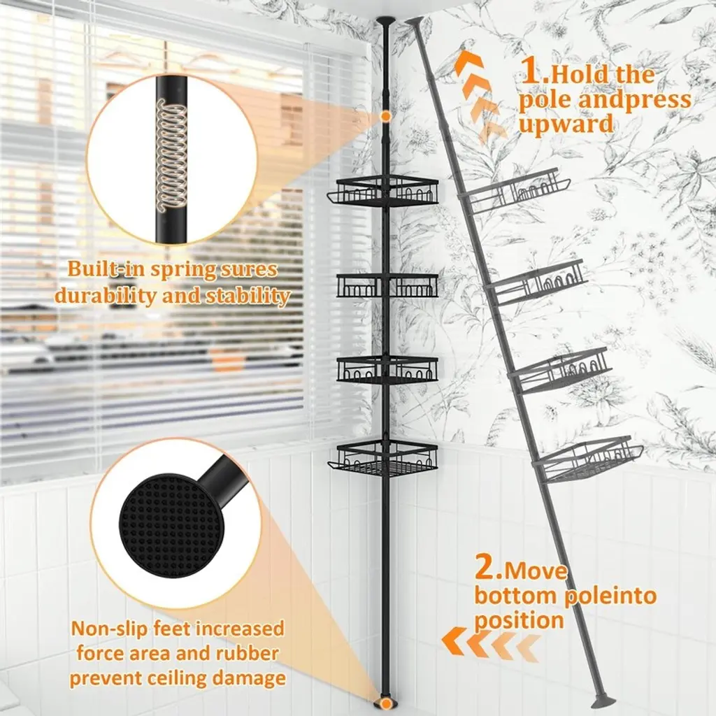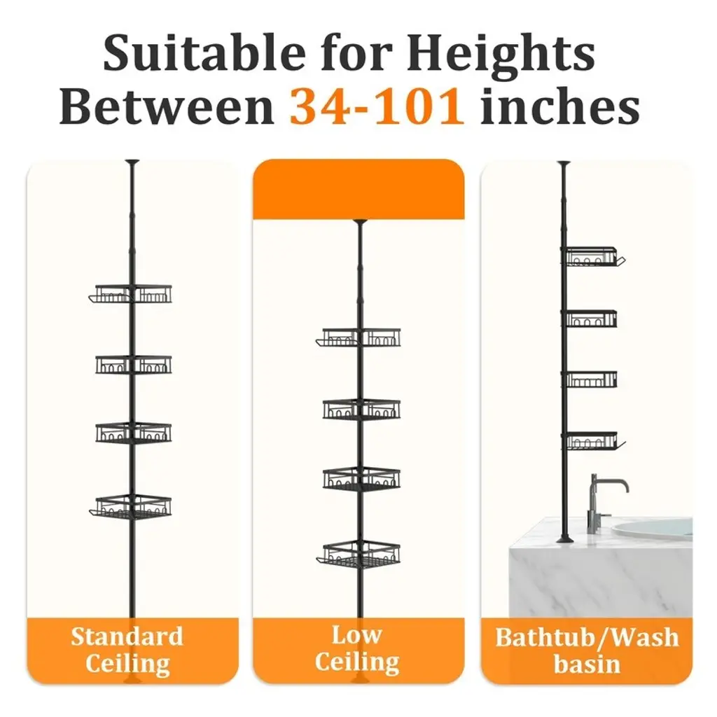 The baskets and rods of the shower caddy tension pole are crafted from high-quality stainless steel, offering rustproof durability for long-term use in humid environments. The basket's hollow design ensures excellent ventilation and drainage, keeping the bathroom dry.Upgraded anti-slip silicone rings prevent the corner shower caddy from sliding, securing the trays firmly. The safety bar design stops items from falling off and is easily removable. A powerful tension spring inside ensures a tight contact with the ceiling and floor, preventing shaking or falling.The corner shower caddy tension pole is easy to assemble and install without drilling or tools. Its top has a spring-loaded buffer to protect the ceiling. Install the tension rod from the floor or bathtub side to the ceiling. Non-marring rubber end caps add extra stability.This shower shelf includes 4 baskets, providing plenty of space for various-sized shampoo, conditioner, and body wash bottles. It also features a towel bar, toothbrush holder, and additional hooks for hanging razors, loofahs, towels, etc., meeting most shower storage needs and keeping the bathroom organized.The adjustable shower shelves fit spaces ranging from 34 to 101 inches, suitable for both high-rise apartments and low-rise residences. The freestanding shower organizer can be used in bathrooms, kitchens, RVs, laundry rooms, etc., helping to keep any space tidy and organized. Note: It is not designed for sloped ceilings.