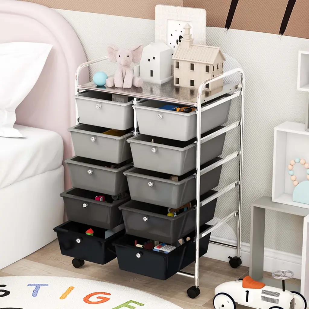 Check out this practical storage cart! This 10-drawer storage cart is perfect for all your storage needs and makes it easy to categorize your belongings. The drawers are easy to pull out with the handles. 4 wheels and handles on both sides make it easy to move the cart around, whether it's on the hardwood, tile or carpet. Two of the wheels can be locked to secure the cart. You can freely pull or push drawers. What's more, if need, you can fully remove drawers from shelf. (Tips: When stuff inside, please timely push back drawers to prevent it topple over.) The high-quality metal frame provides excellent load-bearing capacity and the rust-resistant coating increases the life of the trolley. You can place this practical modern cart anywhere in your kitchen, living room or office.Features10 storage drawers for your storage and sorting needs Spacious top for frequently used items 4 smooth universal wheels (including 2 lockable wheels) for 360° swivel and silent mobility Track of drawers sturdily hold stuff inside Two metal handles on both sides of the trolley make it easy to move it around Selected metal frame provides a stable structure Rusproof Metal Frame Chrome Finish Suitable for living room storage, salon or barbershop use, craft &sewing storage, playroom storage, etc. Color: Black/Clear/Macaron/Grey Gardient/Black Gardient/Multicolor/Pink Gradient/RainbowithWhite/Hot Pink/Skin Pink/Purple Material: Metal, Plastic Overall Dimension: 26'' x 14.5'' x 34'' (L x W x H) Interior Dimension of Drawer: 13'' x 10'' x 5'' (L x W x H) Net Weight: 14.5 lbs Weight Capacity of Top: 22 lbs Weight Capacity of Each Drawer: 5.5 lbs Package Includes: 1 x Storage Cart 1 x Instruction