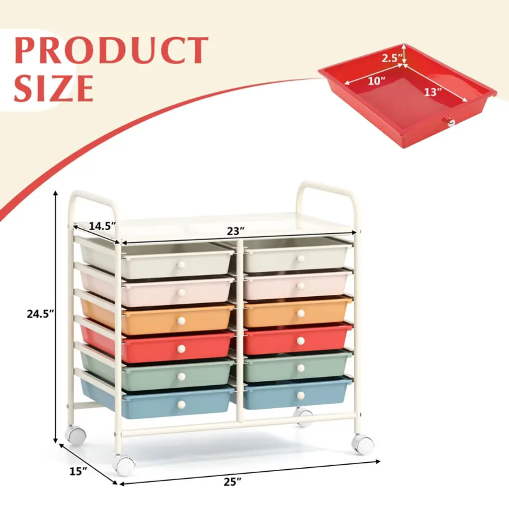 Simplify your storage woes with our 12-drawer rolling storage cart! The 12 removable drawers offer ample storage space for your art materials, office supplies or any other items you need to keep in order. What sets this classroom cart apart is its mobility. Equipped with 4 360° swivel wheels, you can effortlessly move your cart around your space, allowing you to access your essentials wherever you need them. Not only is this rolling storage cart perfect for art studios and classrooms, but it also excels as a multi-purpose storage solution. Use it in your office to store paper, pens, files and office supplies. Keep your sewing and crafting materials easily accessible. Organize your tools and small parts in your garage or workshop.FeaturesKeep your space well organized with 12-drawer storage space Top platform for additional storage space Metal handles and 4 smooth wheels for quiet and effortless movement Keep this storage cart in place thanks to 2 lockable wheels Removable drawers for different needs Slide out the drawers easily with convenient knobs Sturdy metal frame for strong stability Suitable for home, office, classroom, workshop and more Simple to assemble for time-savingColor:Macaron/White/Light Pink/Purple/Pink/Clear/Gray/Rainbow/Multicolor/Hot Pink/Black Material: Metal, Plastic Overall Dimension: 25" x 15" x 24.5"(L x W x H) Inner Dimension of Each Drawer: 13" x 10" x 2.5" (L x W x H) Net Weight: 12 lbs Weight Capacity of Top Platform: 22 lbs Weight Limit of Small Drawer: 3 lbs Package Includes: 1 x 12-drawer Cart 1 x Instruction