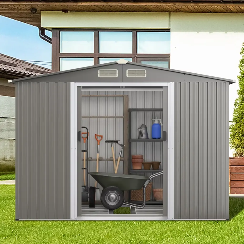 Keep your garden or yard clean with our storage shed! This 8.5' x 6.8' x 6' storage shed can accommodate large tools and bicycles, so it is not only suitable as a tool room, but also as an outdoor storage room, garbage room or pet room. Made of galvanized steel and color steel tile roof, our tool room has excellent weather resistance and stability. Besides, we had added 4 vertical tubes on all four sides of the overall frame to improve wind resistance. What's more, our tool room is designed with a foundation that prevents items from directly touching the ground and keeps them clean and dry. In addition, the tool room has 4 louvers to promote air circulation. And there is a sliding door with ramp provides easy access to your cart. This practical tool room will arrive in 3 boxes, which include complete accessories, 2 pairs of gloves and an instruction to help you assemble.FeaturesLarge inner space is perfect for bicycles, ladders, mowers 4 vertical tube on all four sides of the frame improve stability Equipped with a foundation to protect the items from wet floor 4 elegant louvers facilitate airflow to keep items dry Sliding door comes with ramp for easy access of carts Galvanized steel structure is rust-resistant and stable Tilting roof ensures quick water drainage in rainy days Meet your diverse needs as a tool shed, garbage room, storage house Including a pair of gloves to protect your hands during assembly All the part are packed and delivered in 3 boxesColor:Light Grey/Dark Grey Material: Galvanized Steel, Color Steel Tile Overall Dimension: 8.5' x 6.8' x 6' (L X W X H) Overall Dimension(Without Roof): 8' x 6.3' x 5.2'(L X W X H) Door Size: 5' x 3.4' (L X W) Net Weight: 36 lbs Package Includes: 1 x Tool Room 1 x Foundation 1 x User's Manual 2 x Gloves