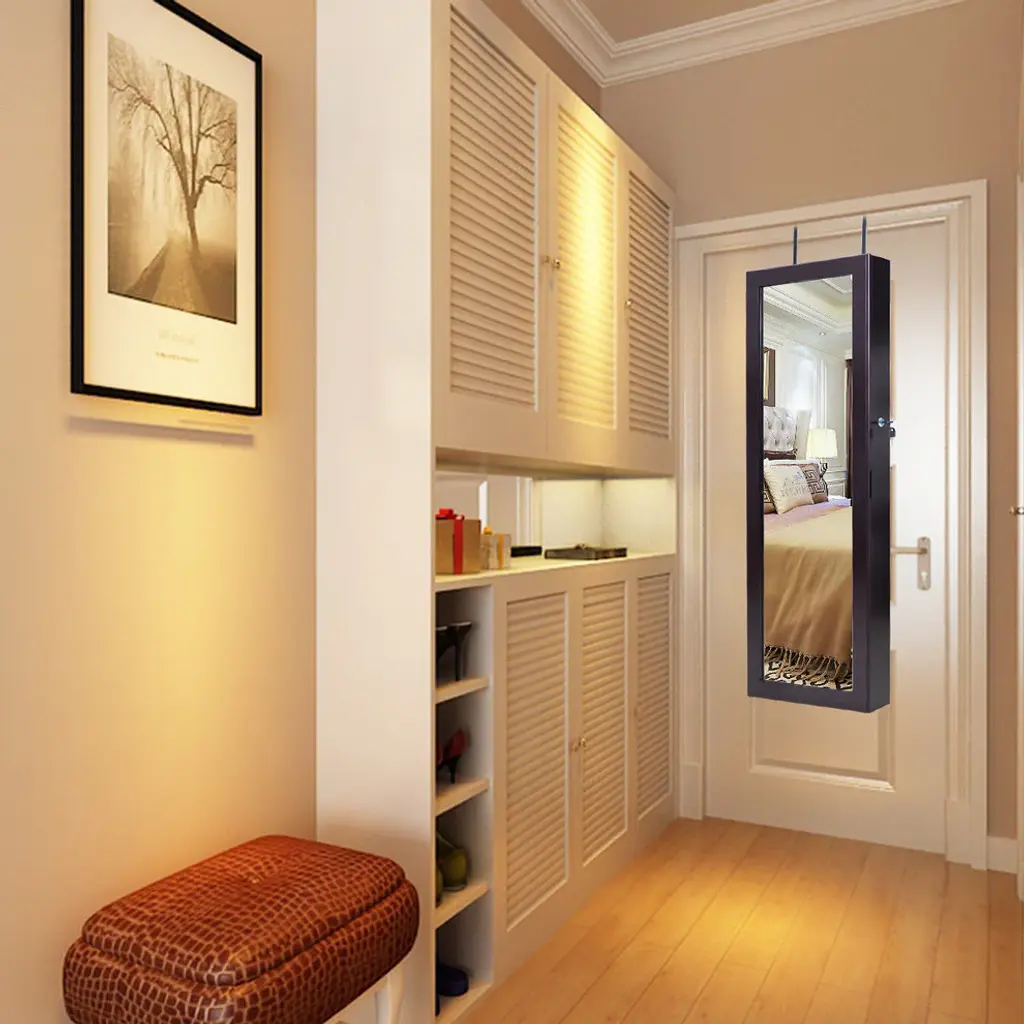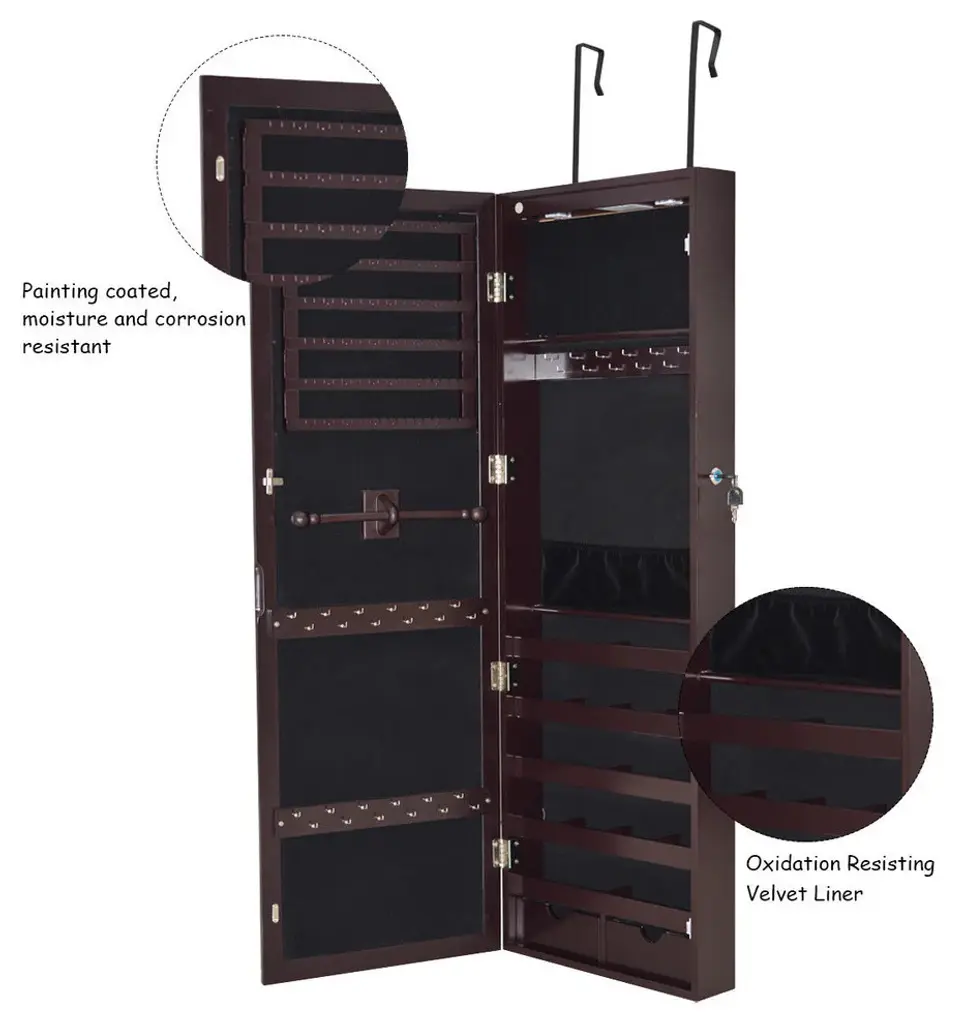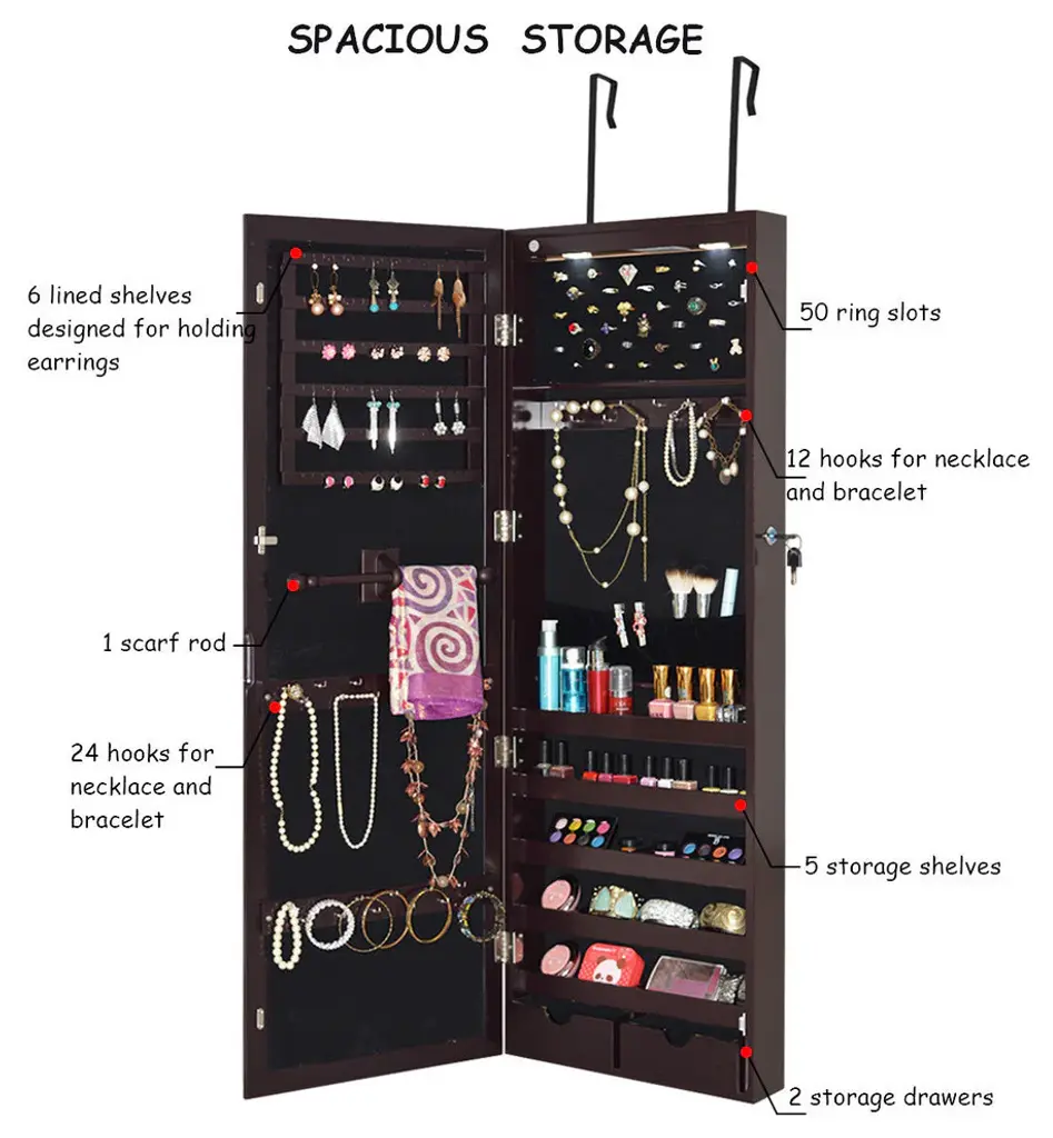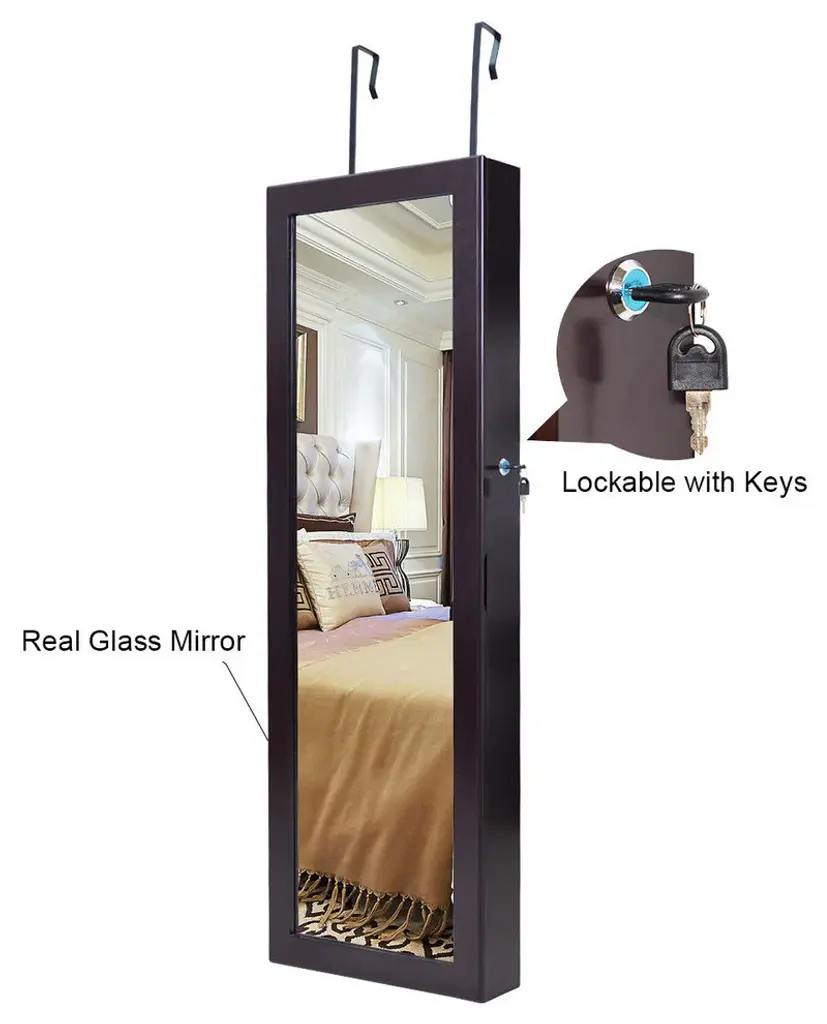 This is our elegant jewelry cabinet, which is perfect for organizing and storing your favorite rings, necklaces, bracelets. Made of high-quality MDF, this jewelry cabinet is sturdy and sturdy. Designed as a wall moubted or door mounted jewelry cabinet, it is space-saving. It Is Equipped With A Big Mirror And Owns A Powerful Storage Capacity. For Its Built-In Different Compartments And Separate Hooks, You Can Save Your Favorite Accessories Safely And In An Organized Manner. It Makes It Easy To Choose Your Jewelry In The Morning Without The Frustration Of Looking For Loose/Missing Pieces. Organize valuables and display an elegant furniture in your home.FeatureSpace-saving wall/door mounted design, maximizing your roomMade of premium MDF, sturdy and sturdyAn elegant full-length mirrorPowerful Storage CapacityDressing mirror and jewelry cabinet cleverly combinesFeatures LED lights(Auto lights up when open the door), making your jewelry more dazzlingSafe & secure storage:Features a lock and keys to protect jewelry, makeup, or other accessoriesEasy to assemblePerfect for bedroom, Jewelry ShopSpecificationMaterial: MDFType: Wall/Door MountedOverall dimension :14.6''''x 3.8'''' x 43.3'''' (LxWxH)Mirror dimension:11''''Wx 39.8''''LQuantity of battery:3• AAA (Not included)Quantity of LED Lights:8Package includes:1 x Jewelry Cabinet