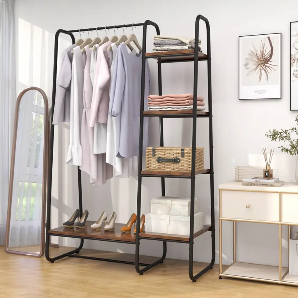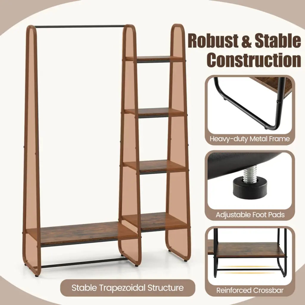 Still troubled by the limited space in your home with nowhere to store clothes? Our closet storage organizer would be worth considering. Equipped with a hanging rod, a wide bottom shelf and 4 side shelves, this closet storage organizer provides you with multiple storage options for assorting wide daily items, such as clothes, shoes, bags, blankets and plants. In addition, this closet storage organizer has more thoughtful details, it has smooth surface, rounded corner, stable base with strong screw connection, ensuring safe and sturdy use. Hence, our closet storage organizer is suitable for use in the living room, bedroom, cloakroom or small space.FeaturesCombine a clothes rack, a shoe rack and side display shelves for multiple use With large capacity to keep your room clean and organized With modern and stylish appearance to fit most home decorations Ideal for using in the living room, bedroom, cloakroom or small space With a hanging rod and a wide bottom shelf to keep shoes and clothes in order Made of high quality material, suitable for long time use 4 adjustable foot pad to keep stable stand on uneven ground With straight forward illustrations and descriptions, easy to assemble Adopts trapezoid structure for great stabilityColor: Rustic Brown+Black Material: Engineered Board, Metal Overall Dimension: 39" x 16" x 59.5" (W x D x H) Side Shelves Depth: 9.5", 11.5", 13", 15" Side Shelves Width: 12" Bottom Shoe Rack Dimension: 24.5" x 15" (L x D) Net Weight: 29.5 Ibs Package includes: 1 x Closet Storage Organizer 1 x User Guide