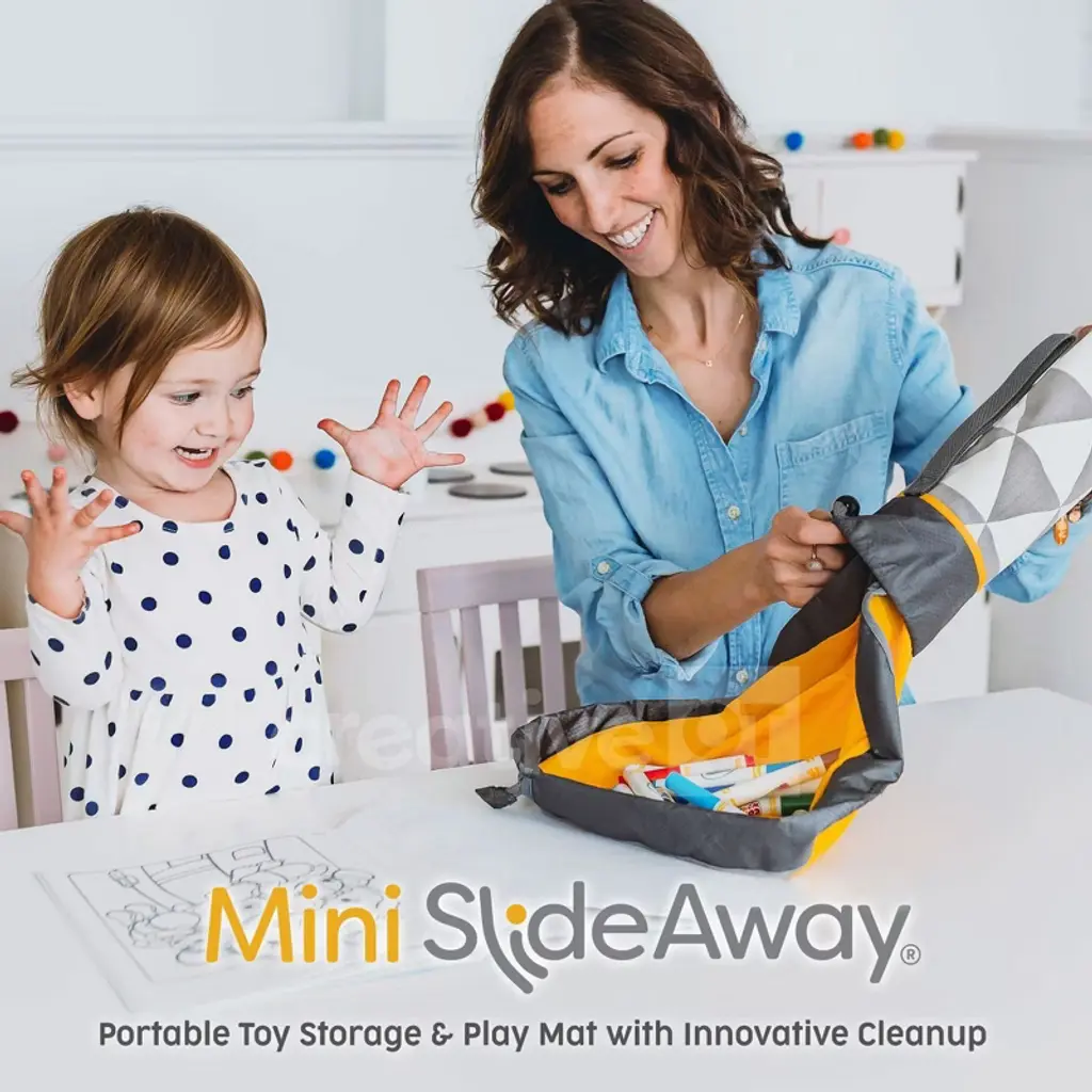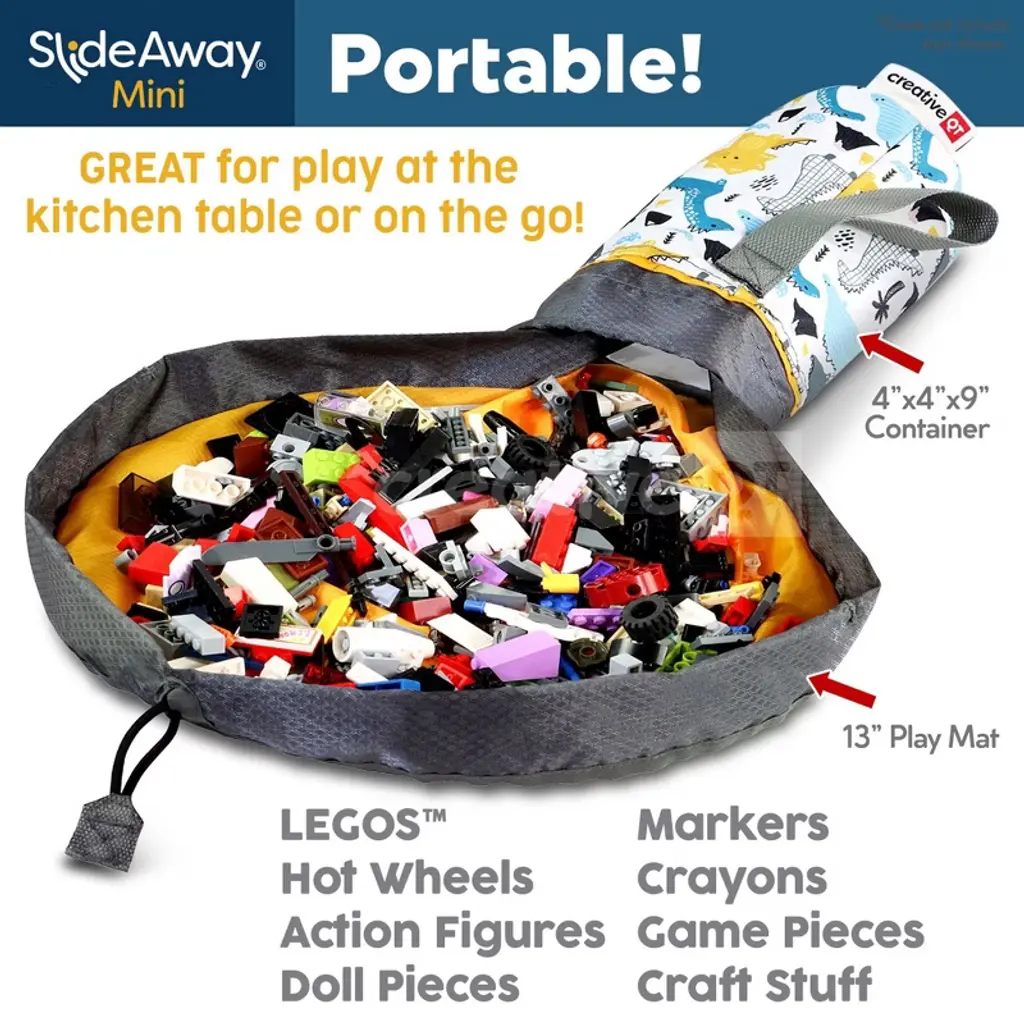 Introducing the Creative QT Mini SlideAway - a revolutionary toy storage mat bag that's here to transform playroom organization and storage. Say goodbye to the chaos of scattered toys and messy play areas. This innovative toy sack combines style and functionality, making it the ultimate playroom organization and storage solution for parents and caregivers alike. With its ingenious integrated tabletop play mat, the Creative QT Mini SlideAway takes toy storage to the next level. No more hunting for missing pieces or spending extra time tidying up. Simply pour the toys onto the spacious 15" play mat, and with a quick pull of the handles and a gentle shake, watch as the toys effortlessly slide away into storage. But the Creative QT Mini SlideAway isn't just practical; it's also stylish and convenient. Standing at a compact 9" tall with a 4" diameter, this premium toy storage basket is designed to be portable and easy to carry. Its drawstring closure ensures that toys stay neatly tucked inside, making cleanup a breeze. Whether you're headed to a restaurant, a doctor's office, or a friend's house, the sturdy handle allows you to transport the drawstring toy storage mat bag effortlessly, making it the perfect companion for on-the-go fun. Boys and girls alike will love this versatile toy storage solution. The Creative QT Mini SlideAway not only simplifies cleanup but also sparks creativity and imagination with its integrated tabletop play mat. The SlideAway feature steals the show as you effortlessly pull the handles and give the toy storage bag a gentle shake - a satisfying sight for both kids and parents. Whether you're getting ready for a family gathering, a playdate at a friend's house, or embarking on a long road trip, the Creative QT Mini SlideAway's sturdy handle ensures easy transport. Embrace the convenience of toy storage and playroom organization without compromising on aesthetics.