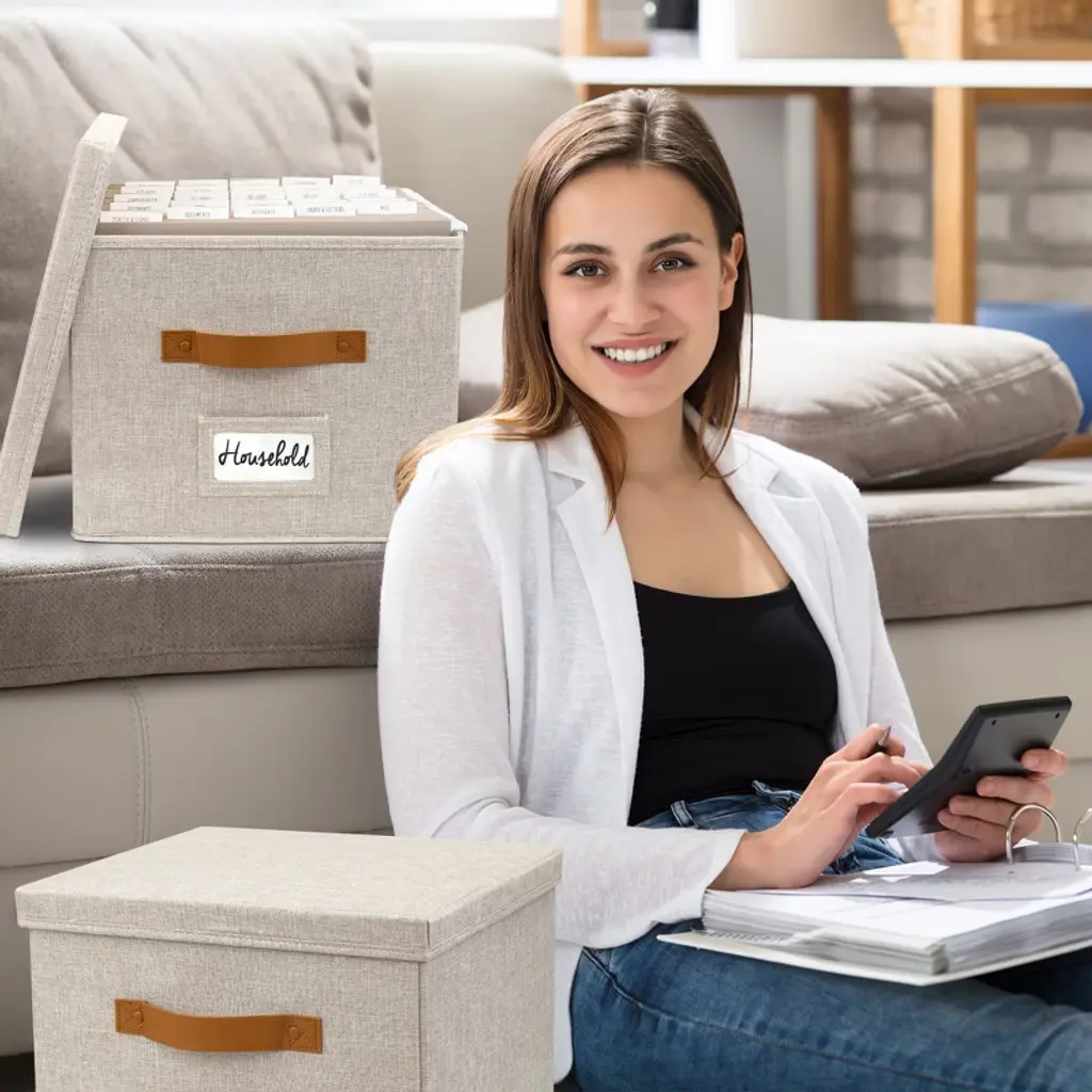 Decorative File Organizer Box Set Of 2 - Collapsible Linen Filing Cabinets With Handles For Documents & Hanging Folders - Portable With Lid