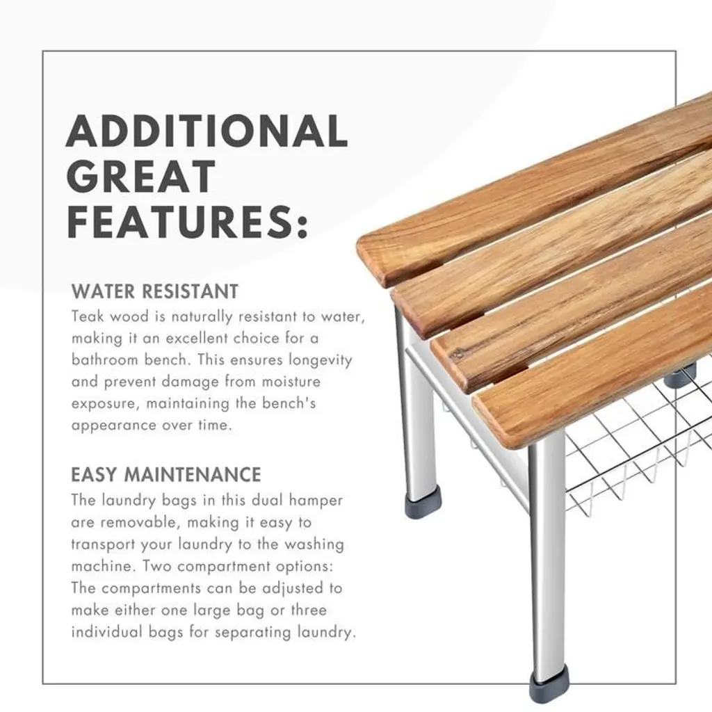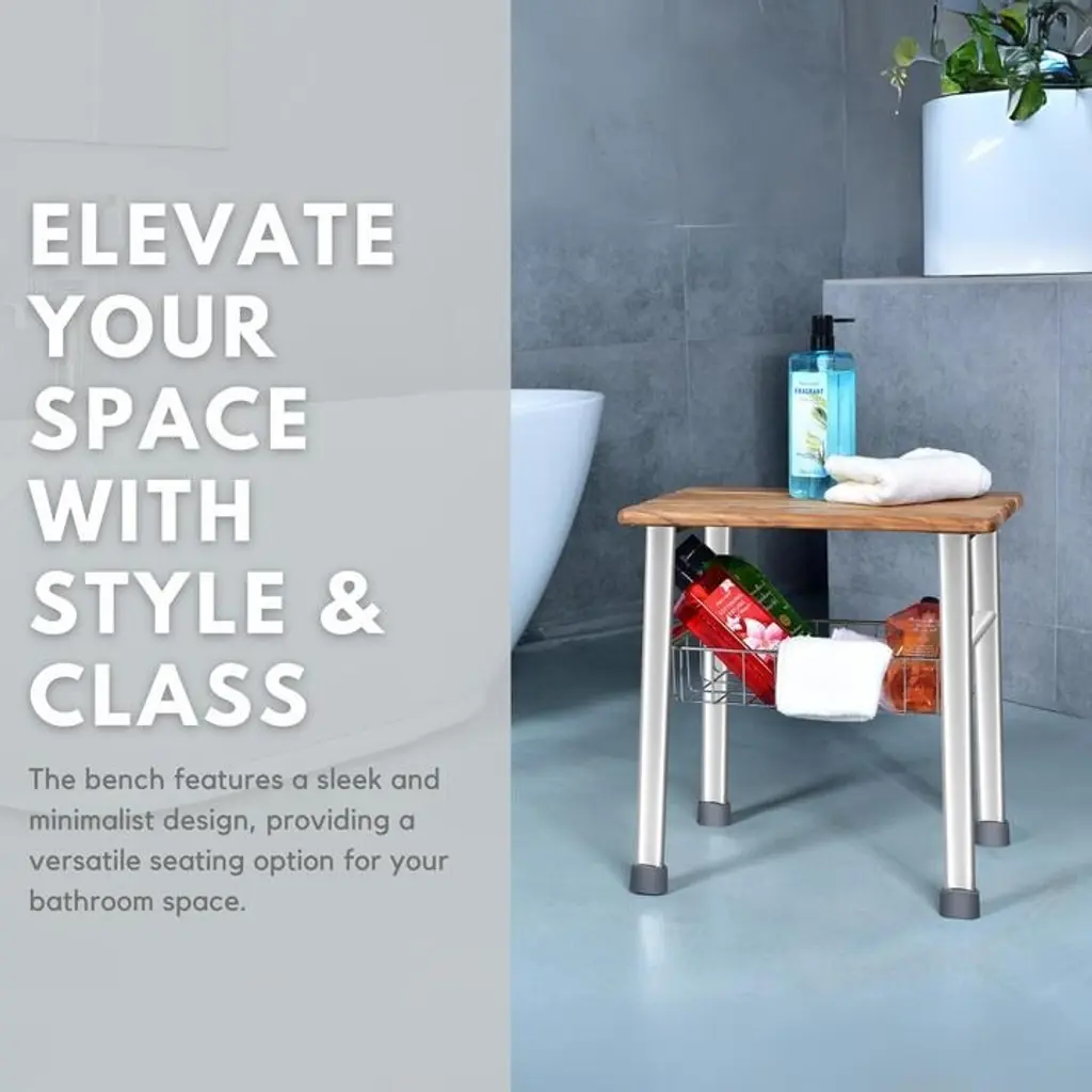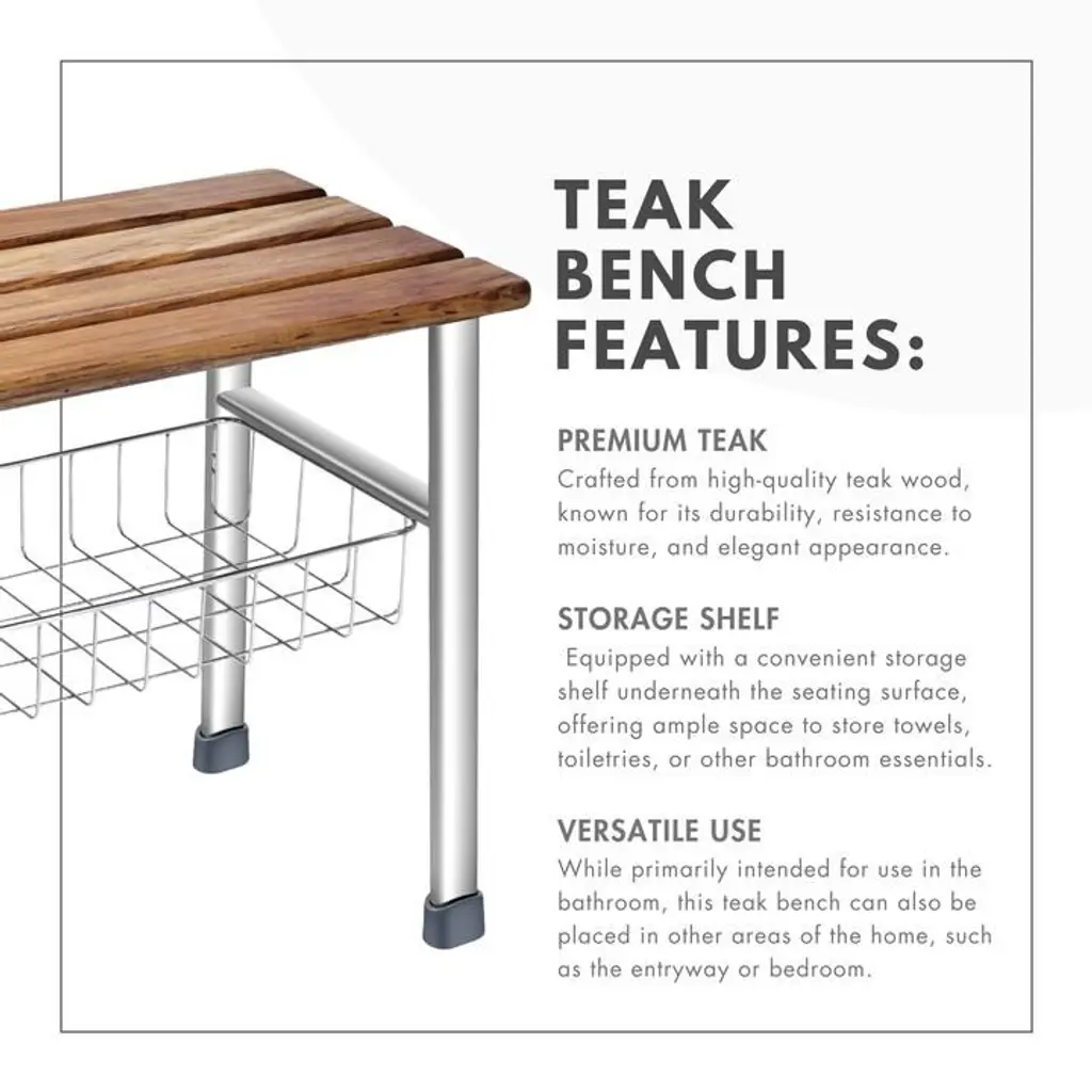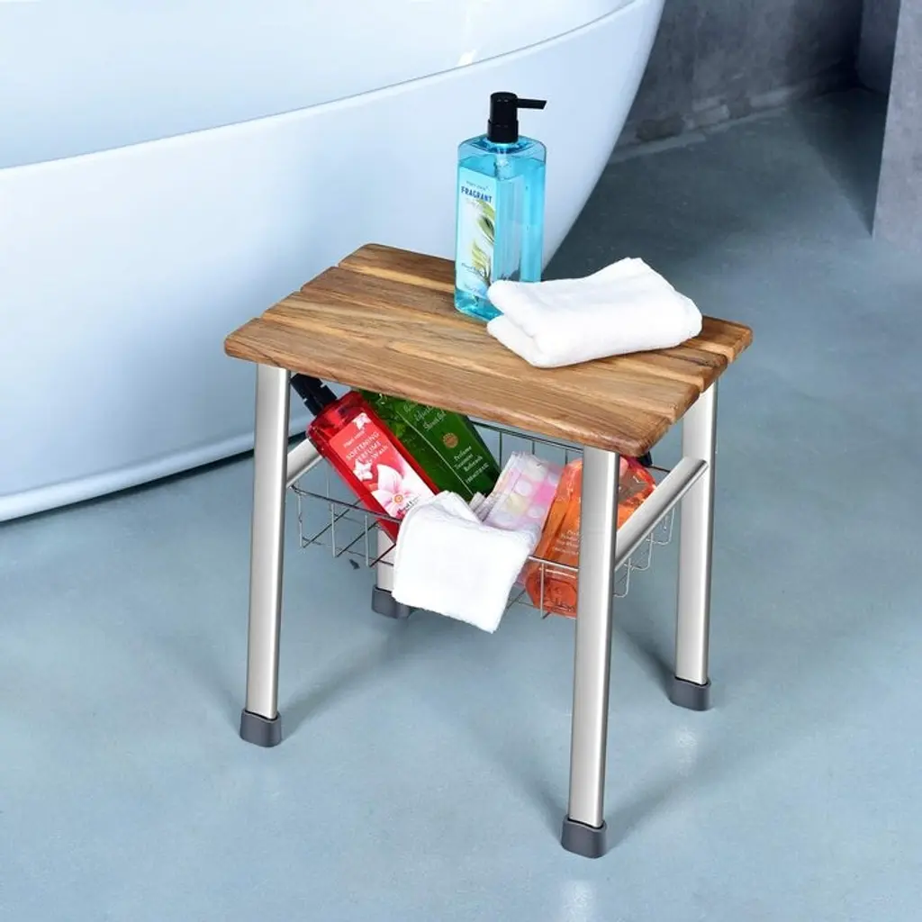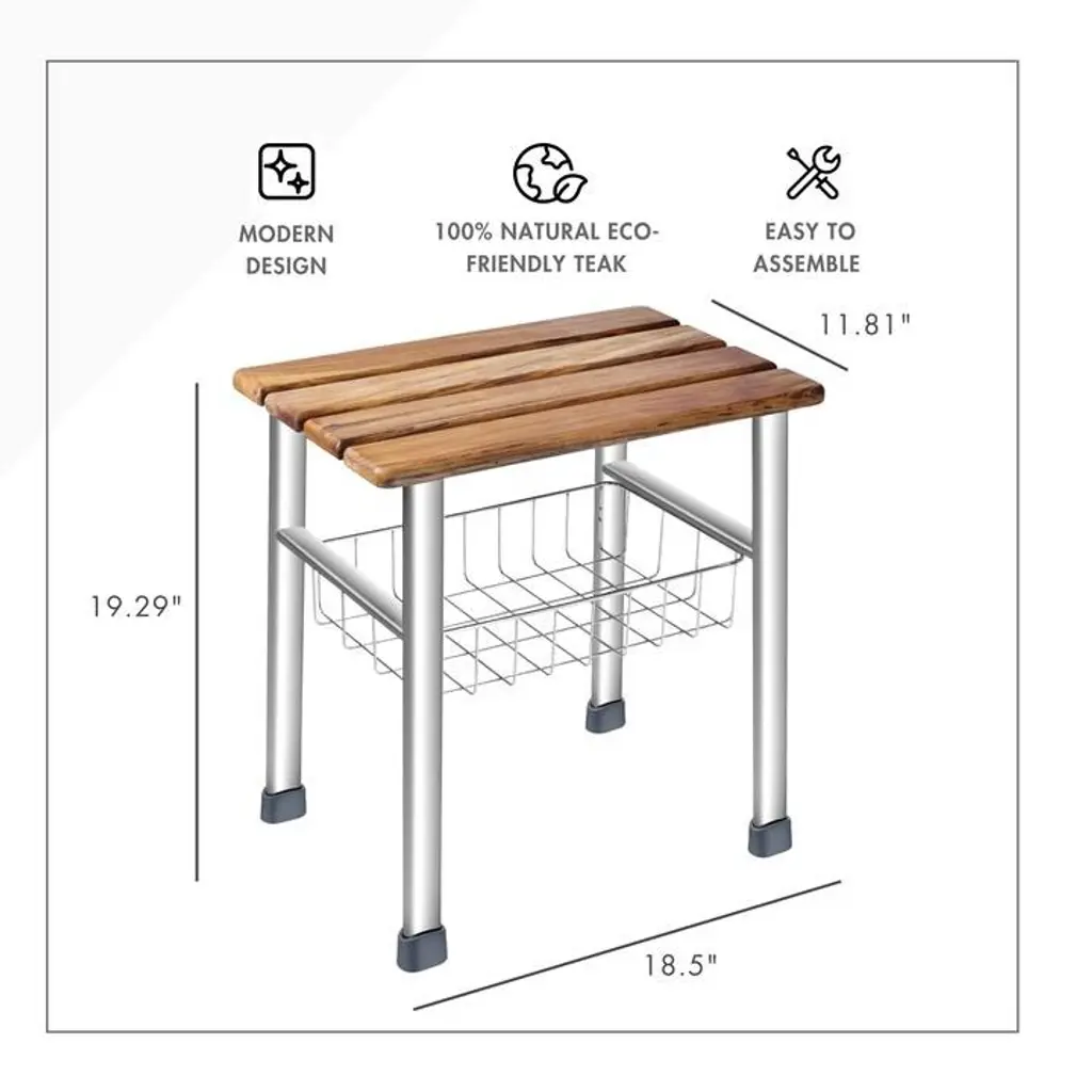 Our ToiletTree Products Teak Shower Bench is designed to offer unmatched quality, setting it apart from other ordinary shower seats. Constructed with premium-grade teak wood, known for its durability and water-resistant properties, this shower bench ensures a long-lasting and beautiful addition to your bathroom. The legs and attached storage basket are crafted from high-strength, rust-resistant 304-level stainless steel, making this bench as durable as it is stylish. Whether you're using it in the shower or as a decorative bathroom accessory, it will always look as good as new.Storage Basket for Convenience In addition to providing a comfortable seat, the ToiletTree Products Teak Shower Bench features an integrated storage shelf. The robust stainless steel basket allows you to conveniently store your bathroom essentials, such as soaps, shampoos, towels, or even reading materials. Whether you’re showering, relaxing, or tidying up, this bench with a storage compartment keeps everything you need close at hand. The basket’s design is sleek, stylish, and functional, ensuring that your bathroom stays organized without sacrificing elegance.Rubber Grip Feet for Stability Safety and stability are paramount when choosing a shower bench, and our Teak Shower Bench doesn’t disappoint. Equipped with rubber grip feet, this shower chair ensures that the bench stays firmly in place, even on wet bathroom floors. The non-slip feet provide reliable support and security for adults of all sizes, making it ideal for those with mobility concerns or anyone who values extra stability while bathing. The strong rubber grips prevent any unwanted movement, ensuring you feel safe and secure every time you use it.Durable and High-Quality Materials Crafted from top-tier teak wood, this shower seat is built for durability and long-lasting use. The premium teak provides resistance to water damage, ensuring the bench withstands years of exposure to moisture without losing its beauty. The flawless finish eliminates any sharp edges or splinters, preventing skin irritation and providing a smooth and comfortable experience. With a weight capacity of 441 lbs, this shower bench can support adults of all sizes, making it a reliable option for everyone in your household.Non-Skid Rubber and Stainless Steel Legs The legs of this shower stool are made from rust-resistant 304 stainless steel, providing excellent durability and stability. The non-slip rubber tips are designed to distribute weight evenly, ensuring that the bench remains stable, even on wet floors. Whether you're sitting to wash your feet, relax, or need a stable surface for showering, this bench offers ultimate support, comfort, and safety.Lightweight and Portable Design At a compact 18.5 inches wide and 19.2 inches tall, this shower bench won’t take up too much space in your bathroom. Despite its sturdy construction, it weighs only 8 lbs, making it easy to transport and reposition wherever you need it. Whether you're looking for a convenient shower seat or need extra storage in another room, this lightweight bench makes it effortless to carry it around your home.Ideal for Special Needs and Comfort This shower bench is the perfect solution for individuals with mobility issues, post-surgery recovery, or anyone who experiences discomfort while standing for long periods. The comfort provided by this bench enhances your shower experience, offering a safe and supportive seat for individuals of all ages and physical abilities. It’s a thoughtful and practical piece of furniture that will make your daily routine more comfortable and hassle-free.