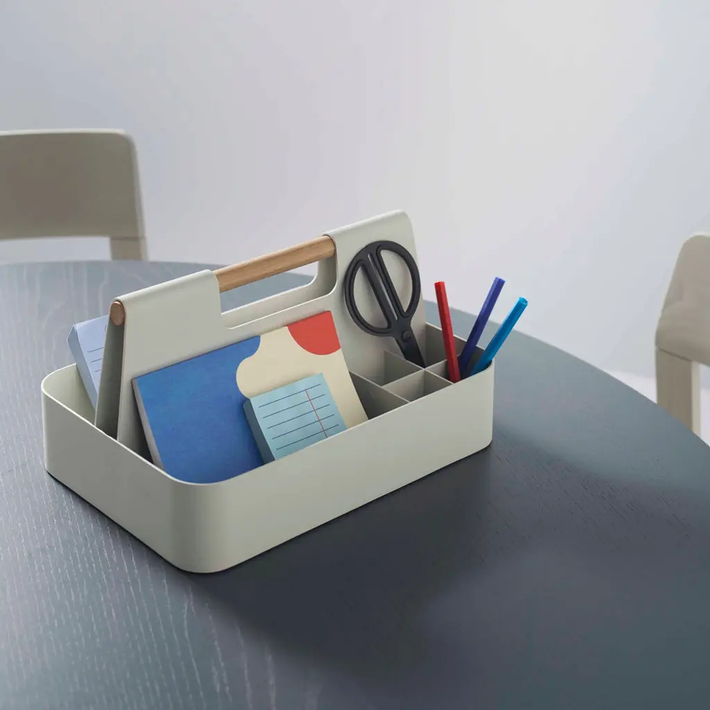 Meet the Desk Caddy: a toolbox-inspired storage solution for items big and small. Powder coated aluminum, integrated compartment dividers and a solid wood handle create a stylish, functional caddy that's built to last.