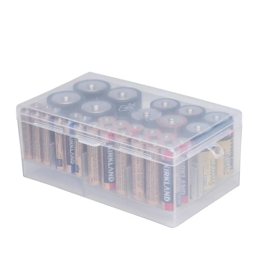 Keep your batteries neatly organized and easy to find with this compact battery storage case. Designed to hold 12 AAA, 12 AA, 6 C, and 4 D batteries, it features individual compartments for each size and a clear snap lid for quick visibility. Made from durable plastic, it's perfect for use in the garage, utility room, or kitchen—and compact enough to take on the go. Measures 2.75" L x 6.5" W x 3.75" H. BPA-free and backed by a 1-year manufacturer's defect warranty.