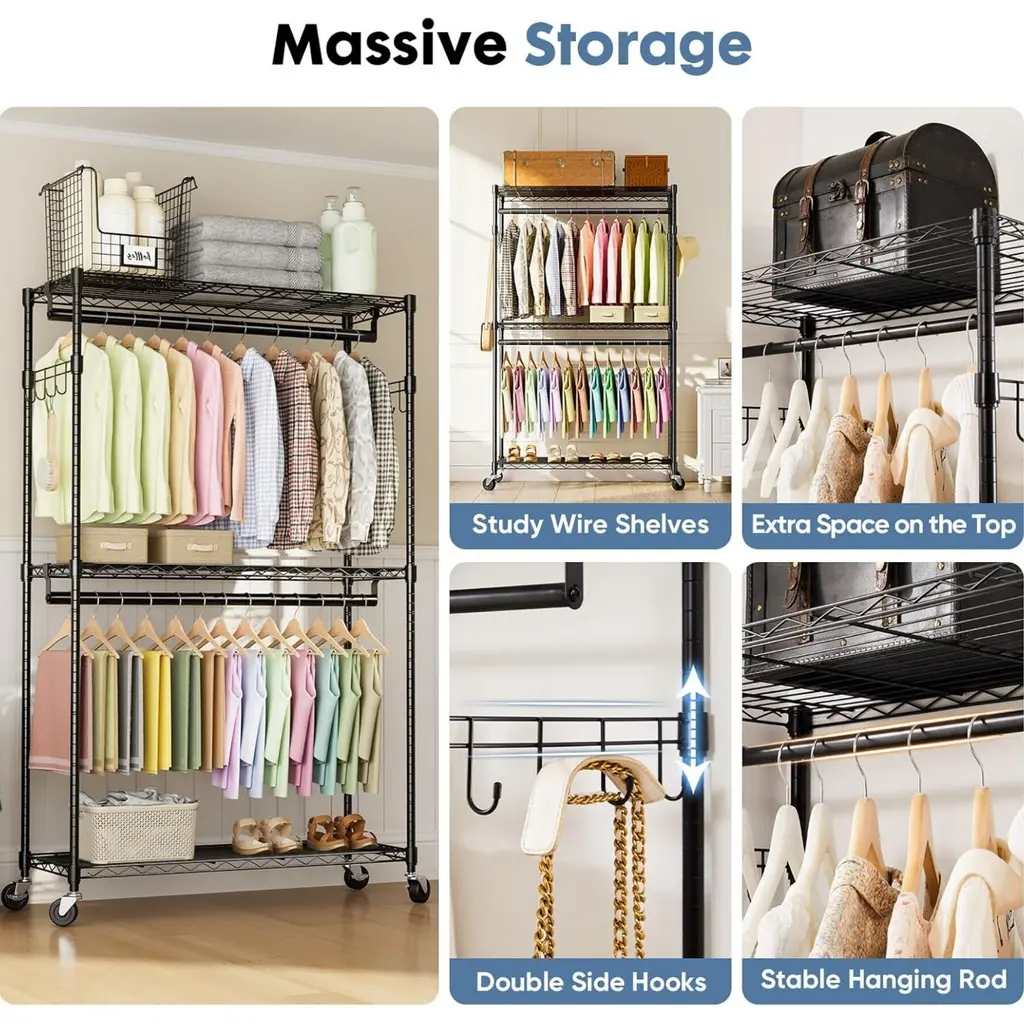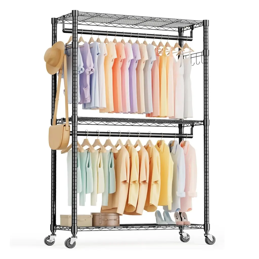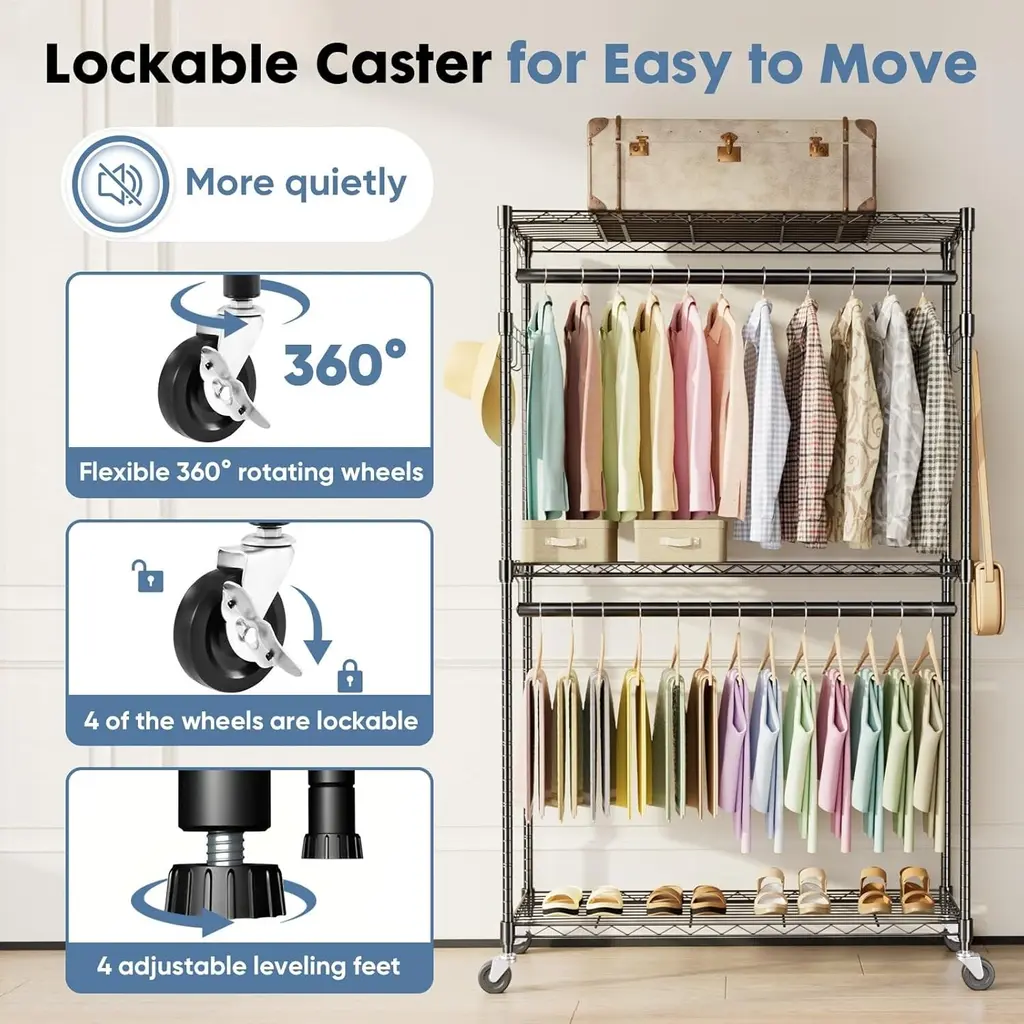 Description:The Double Rod Clothes Rack is the perfect solution for organizing and storing your garments in style. Constructed from heavy-duty steel, this clothing rack is durable and can hold a large amount of clothing without any worry of it collapsing. The adjustable design allows you to customize the height of the rods to accommodate longer garments such as dresses and coats. The two side hooks are perfect for hanging accessories such as scarves, belts, or purses. With wheels for easy mobility, this garment rack can be easily moved from room to room or even from closet to closet. This makes it perfect for use in a bedroom, laundry room, or even a retail store. Say goodbye to cluttered closets and disorganized clothing with the Double Rod Clothes Rack. Keep your garments neat, organized, and easily accessible with this versatile and stylish clothing rack.Mobile Clothing Rack: The Portable Clothes Rack is equipped with four 360° swivel wheels, allowing you to effortlessly move the rack to any desired location. The locking feature ensures that the rack stays in place once you've found the perfect spot. Designed with your comfort in mind, the quiet wheels ensure smooth movement without disturbing noise, and they won’t scratch or damage your floors.Adjustable Clothes Rack: The Adjustable Clothes Rack offers great flexibility, allowing you to easily manage and organize your clothing. You can adjust the height of the dividers based on the size and type of clothes you're hanging, ensuring efficient use of space. This feature allows you to store a variety of garments—whether long dresses or shorter items—keeping everything neat and organized. With a designated space for each piece of clothing, this rack helps maintain a tidy and accessible wardrobe.Sturdy and Durable: The Metal Clothes Rack is designed for exceptional sturdiness and durability. It can support up to 350 lbs. per net layer with load-bearing feet installed, and up to 440 lbs. with wheels, offering a static load capacity of 440 lbs. and a dynamic load capacity of 260 lbs. Built with strong metal construction, it can handle heavier clothing without easily deforming or getting damaged. Additionally, the metal surface is easy to clean—simply wipe it with a damp cloth to keep it looking neat and tidy. This rack offers long-lasting strength for all your storage needs.Easy Assembly: The Metal Clothes Rack is designed for easy assembly. Before starting, carefully read the installation instructions to ensure you follow the correct order and connect all components properly.
