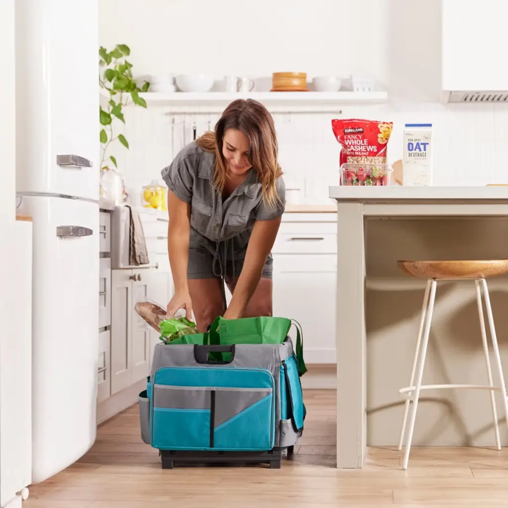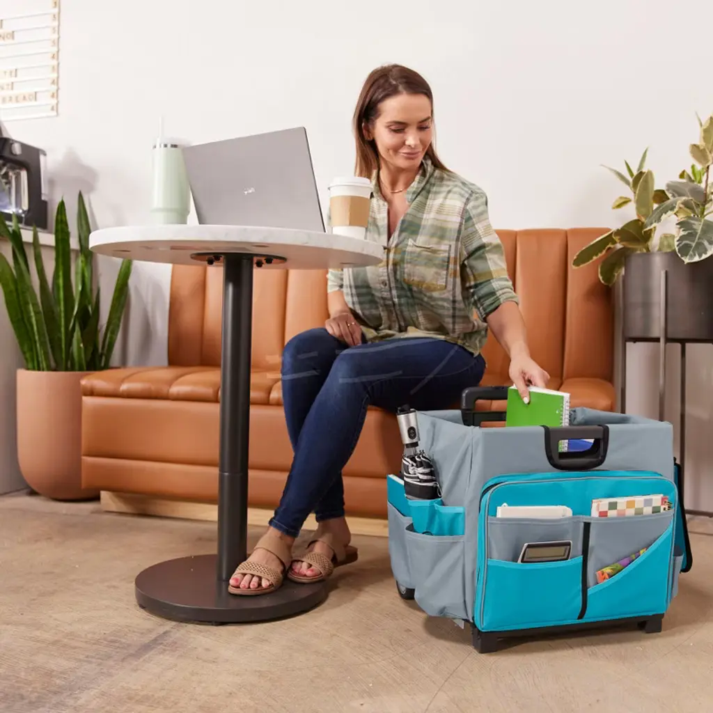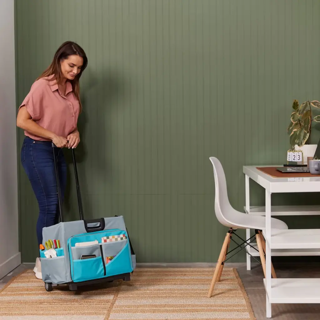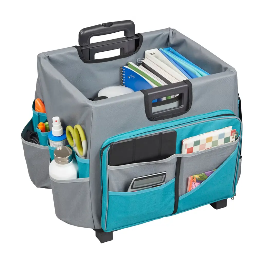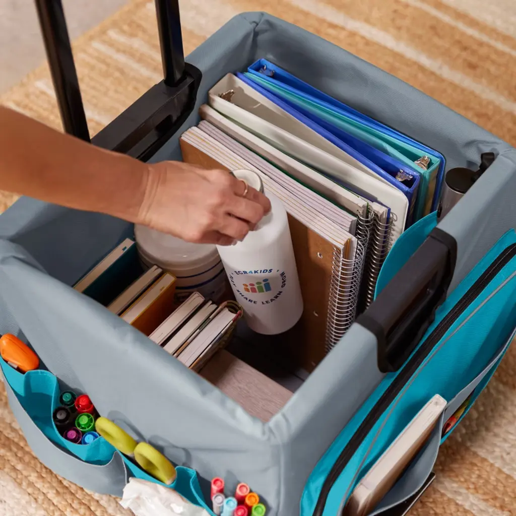 The ECR4Kids Universal Rolling Cart with Organizer Bag is the ultimate mobile solution for transporting school supplies, files, and textbooks. In addition to being a teacher toolbox for classroom organization, the rolling storage cart can be used to organize arts and crafts supplies, scrapbooking material, sewing supplies, tools, photo albums, garden equipment, or cleaning supplies. This versatile handcart effortlessly unfolds, locking into place with double-sided stability rails that reinforce side panels. The rails conveniently store in the base when not in use. Built-in handles allow for easy lifting, while heavy-duty rolling casters ensure smooth and effortless transport. The removable saddlebag organizer slides over the cart, featuring over 30 storage compartments, zippered pockets, and stay-put fasteners to keep your supplies secure and within reach. The carts with wheels accommodate letter and legal-size folders, hanging files, and binders, making it an essential tool for staying organized on the go. The ergonomic retractable handle extends and locks into three positions, ensuring comfortable use whether you’re heading to school, meetings, or running errands. When not in use, the rolling carts with wheels fold into a compact square for space-saving storage, making it as practical as it is functional.