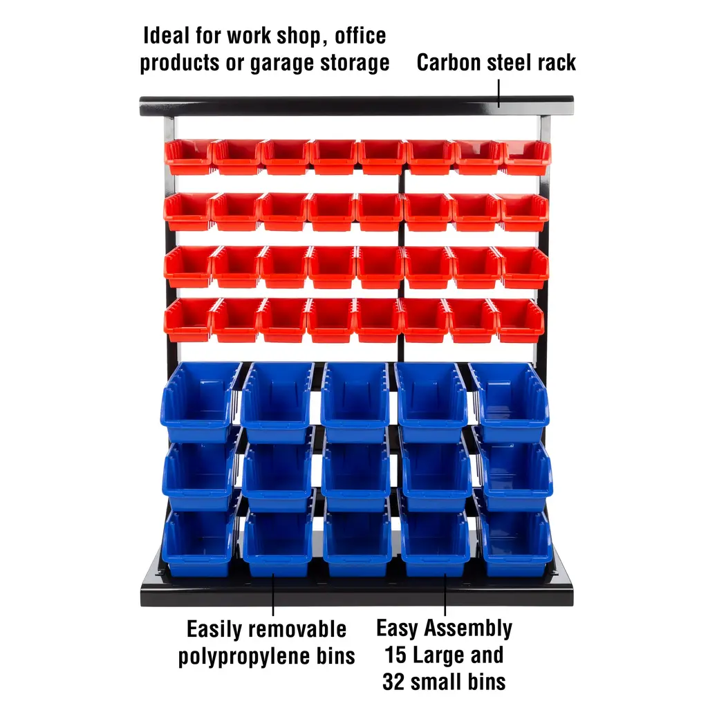 The 47 Organizer Bin Display Rack from Fleming Supply provides you with an easy way to keep your parts, hardware, screws, tools, beads, art supplies, thread, and craft accessories neat and tidy. The 15 large blue containers and the 32 small red bins attach to the black peg panel board for easy wall mounting in your garage, shed, storage room, office, or crafting area.