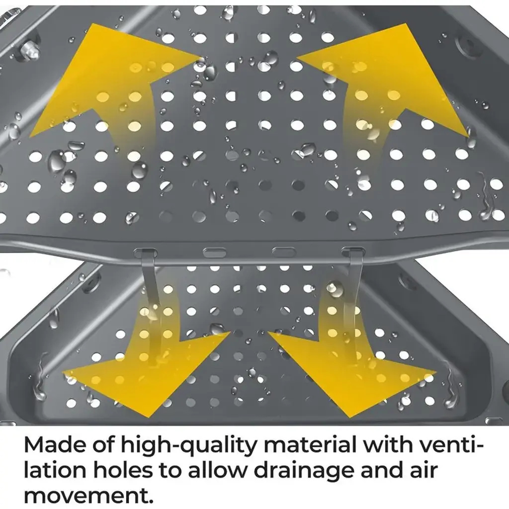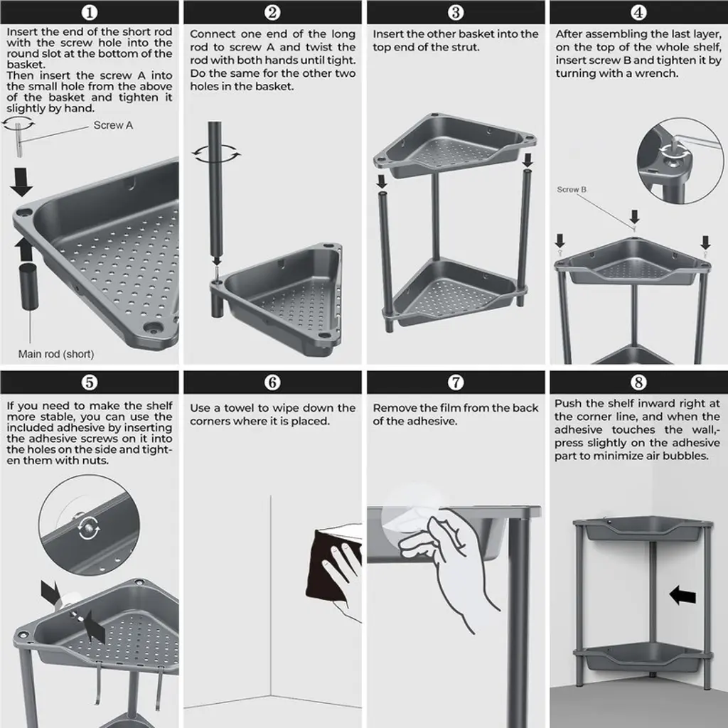 QUICK and CUSTOMIZABLE SETUP - Easy to assemble without tools; adjustable tiers to fit your storage needs.Extra Storage Hooks - Includes hooks , brushes, towels or rags.RUST AND WATERPROOF - Durable metal + plastic construction resists rust and moisture.STRONG AND SPACIOUS DESIGN - Reinforced adhesive ensures stability; high spacing for large bottles.SUITABLE FOR ANY ROOM - Organize your bathroom, kitchen or bedroom essentials in stylish style.