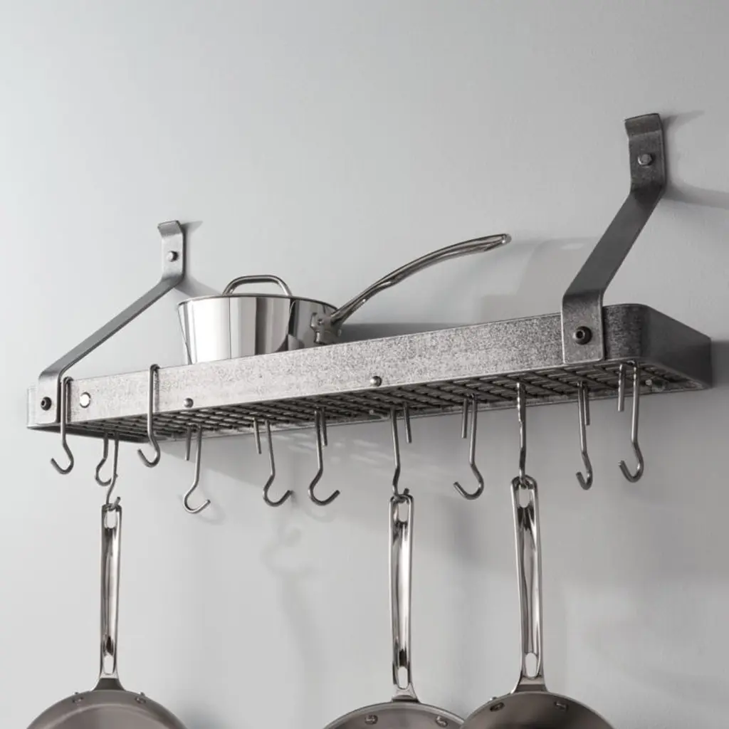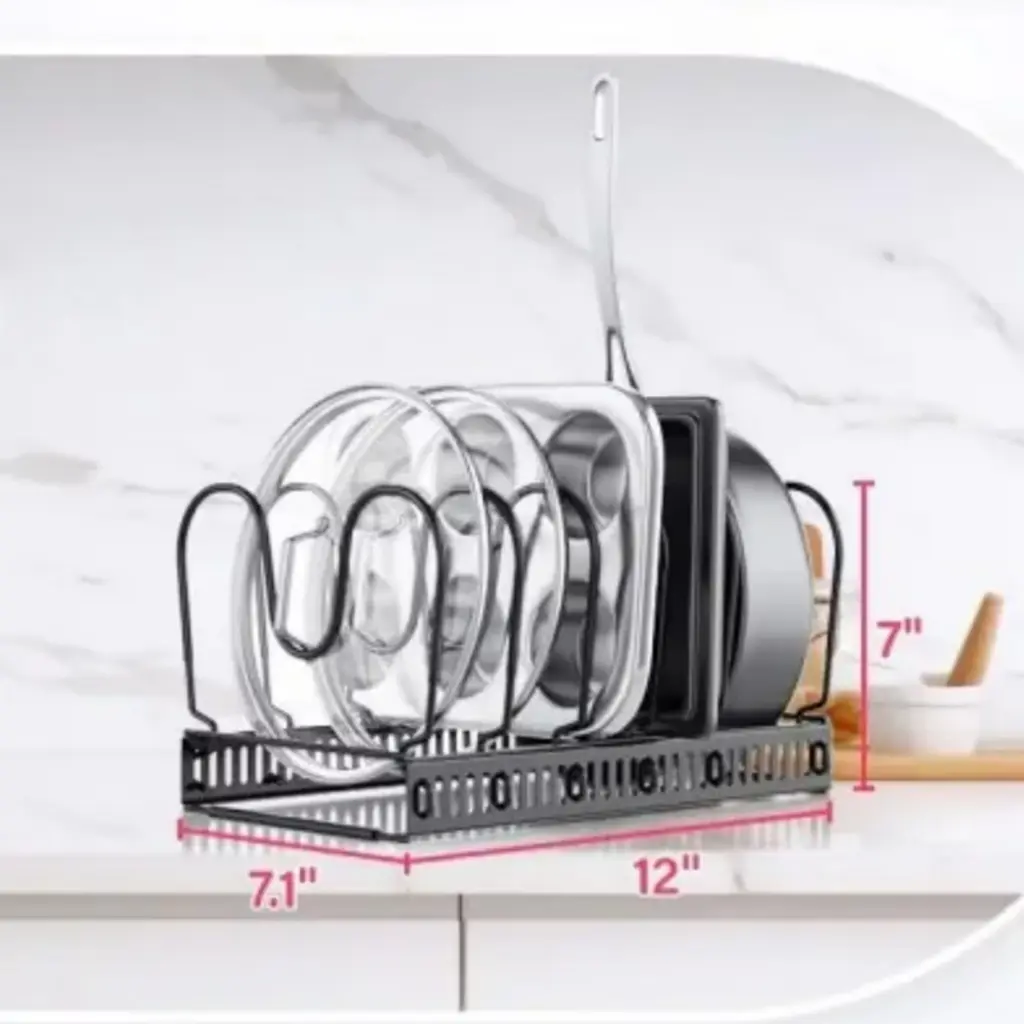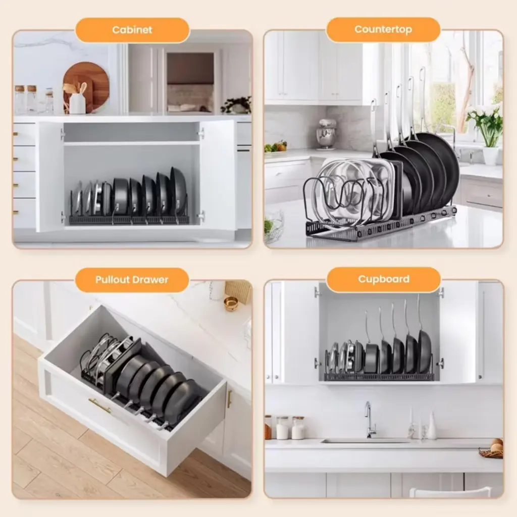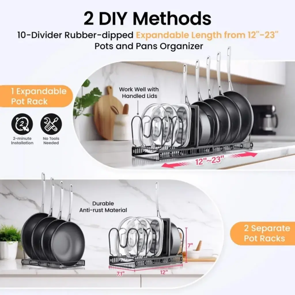 This pot rack organizer offers expandable design, non - slip safety, quick assembly, 10 adjustable compartments, and multi - pan compatibility. Ideal for flexible storage, easy pot access, quick setup, space - saving, and organizing various cookware to create a tidy kitchen.