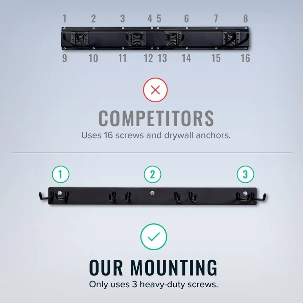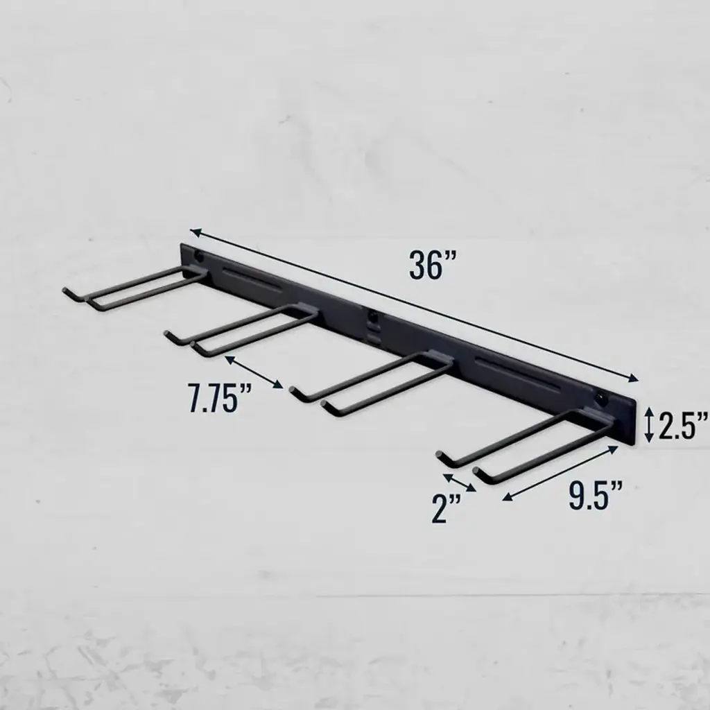GARAGE ORGANIZATION: This garden tool organizer measures 36"W x 9.75"D x 3"H and features four high-capacity tool slots to support 250 lbs of shovels, rakes, power tools, and more. "BUILT LIKE A TANK": The BLAT garage organizer is made of solid steel and is designed to be virtually indestructible. The durable black powder coating prevents rusting and lasts a lifetime. EASY INSTALL: Garage tool organizer wall mount arrives fully assembled. Simply mount it to your wall using the 3 provided lag screws. Designed to secure to standard wall studs spaced 16" apart. MAXIMUM STORAGE: Each of the 4 storage slots are 9.5" deep and 2" wide. The 4 tool hooks are welded onto a sturdy baseplate for a total load capacity of 250 pounds.