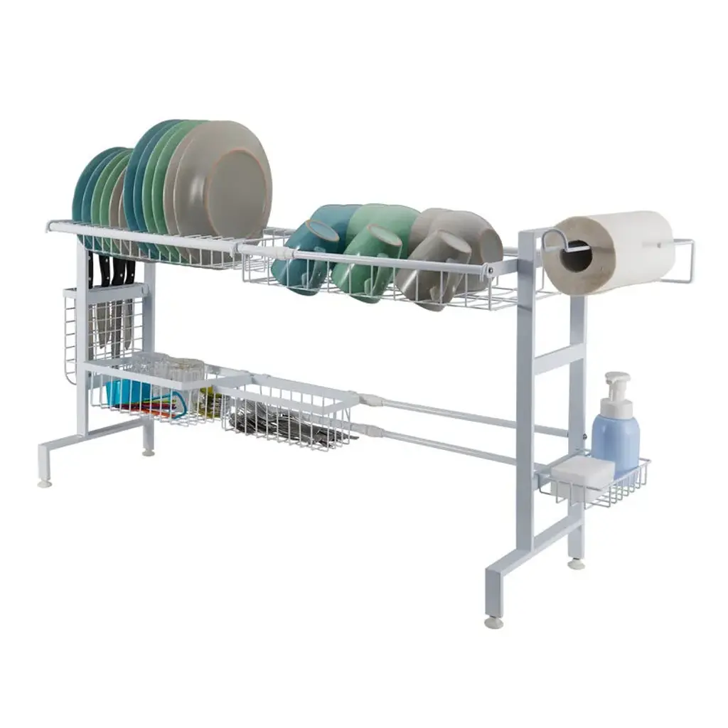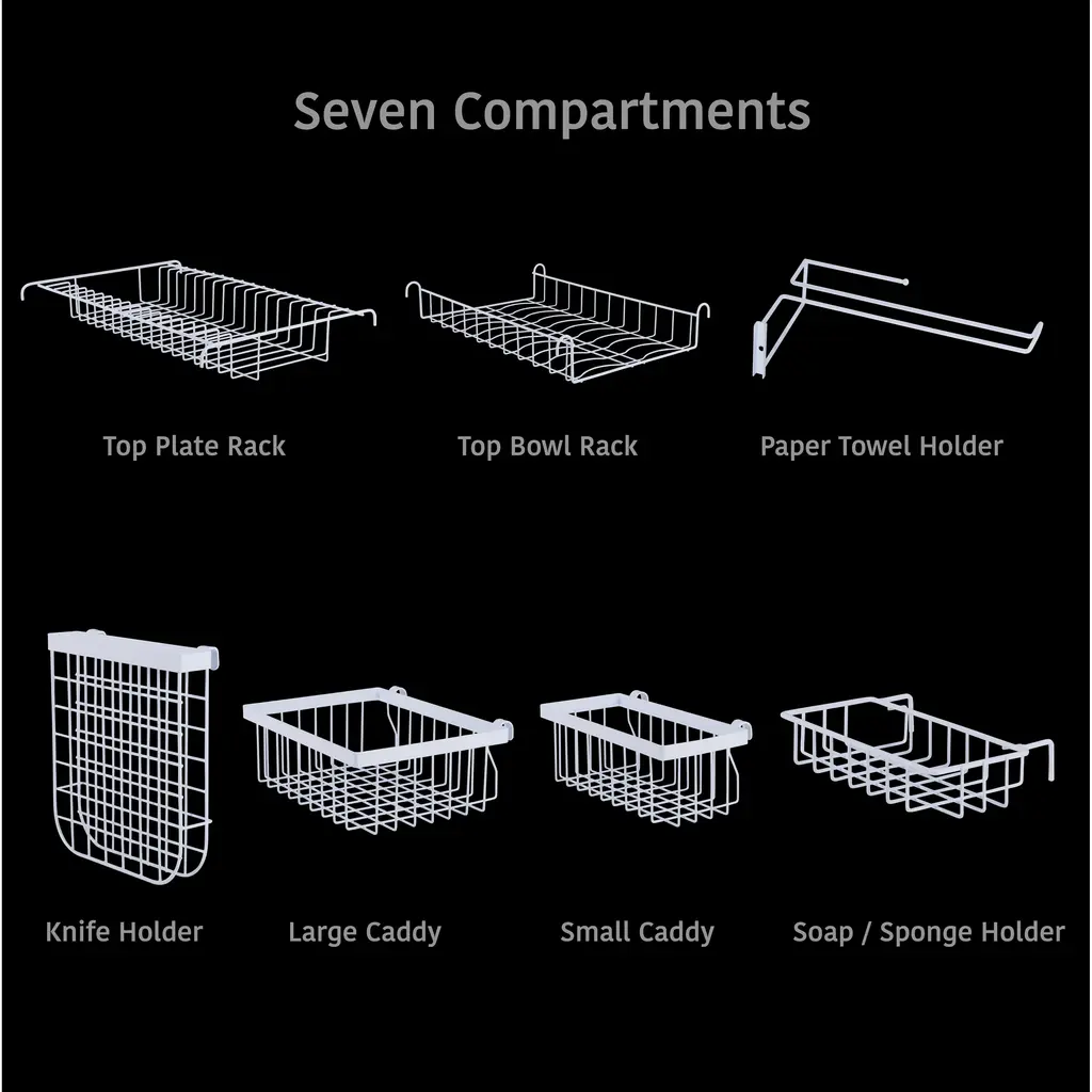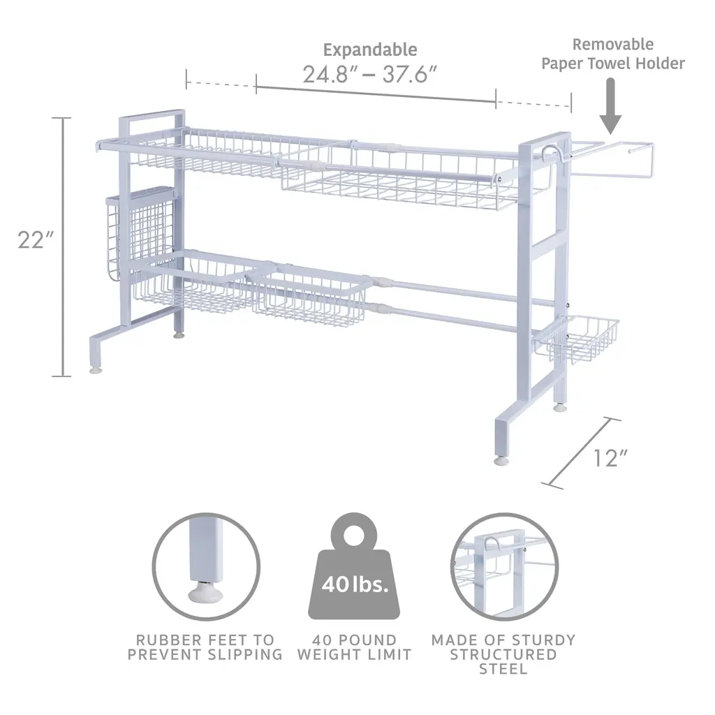 Create instant storage space in your kitchen with this Gourmet Basics Over Sink Expandable White Organizer. Whether you need space to drip-dry dishes and utensils over the sink, or storage for cleaning products in a larger cabinet, this unique organizer is equipped with numerous wire frame baskets to hold your items and keep them in their own space. It features two tiers of baskets, including larger on top and smaller on bottom, side baskets and hooks on the side that can be arranged any way you'd like, and a built-in paper towel holder. Best of all, the baskets are removable so you can expand or shrink the size of the organizer to suit your needs. Crafted of durable carbon steel with a modern white finish, it's also great for use in a bathroom, linen closet, pantry, craft room, or garage workspace Measures 24.8 x 12 x 22 inches. Wipe clean with a damp cloth.CONVENIENT ORGANIZER: 2-tiers of numerous wire frame baskets, hooks, and a built-in paper towel holder EXPANDABLE: baskets remove to adjust the size of the organizer to fit your space SLEEK DESIGN: made of durable, carbon steel with a modern white finish GENEROUSLY SIZED: measures 24.8 x 12 x 22 inches and expands to 37.6" EASY CARE: simply wipe clean with a soft, damp cloth