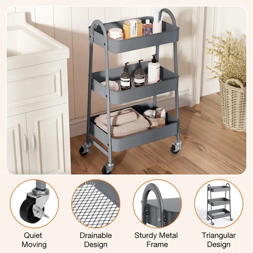 Gulches 3-Tier Small Rolling Cart is a heavy-duty metal utility organizer for kitchens, bathrooms, offices, etc. 3 tiers provide ·Ö²ã storage for tools, toiletries, or snacks; wheels roll smoothly on floors. Compact yet roomy, it fits small spaces while maximizing storage. Metal construction ensures durability, so it holds up to regular use¡ªideal for anyone needing flexible, long-lasting clutter solutions.