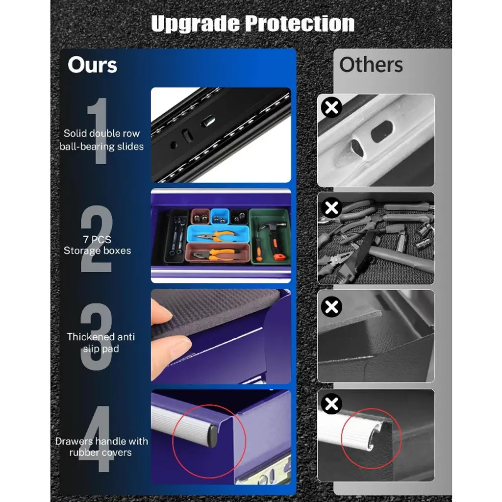 This heavy-duty rolling tool chest offers 5 drawers and 7 storage compartments for versatile organization of tools. Built with powder-coated steel, it resists scratches/dents while supporting 1000 lbs total (300 lbs top surface). Four wheels—including 2 swivel casters with brakes—enable smooth mobility, with a pull handle for effortless maneuvering. Features ball-bearing slide rails for seamless drawer operation, plus a key lock for security. Ideal for garages, workshops, or warehouses, its sleek design doubles as functional furniture. Combines industrial resilience, intelligent organization, and effortless mobility for professionals and DIYers alike.