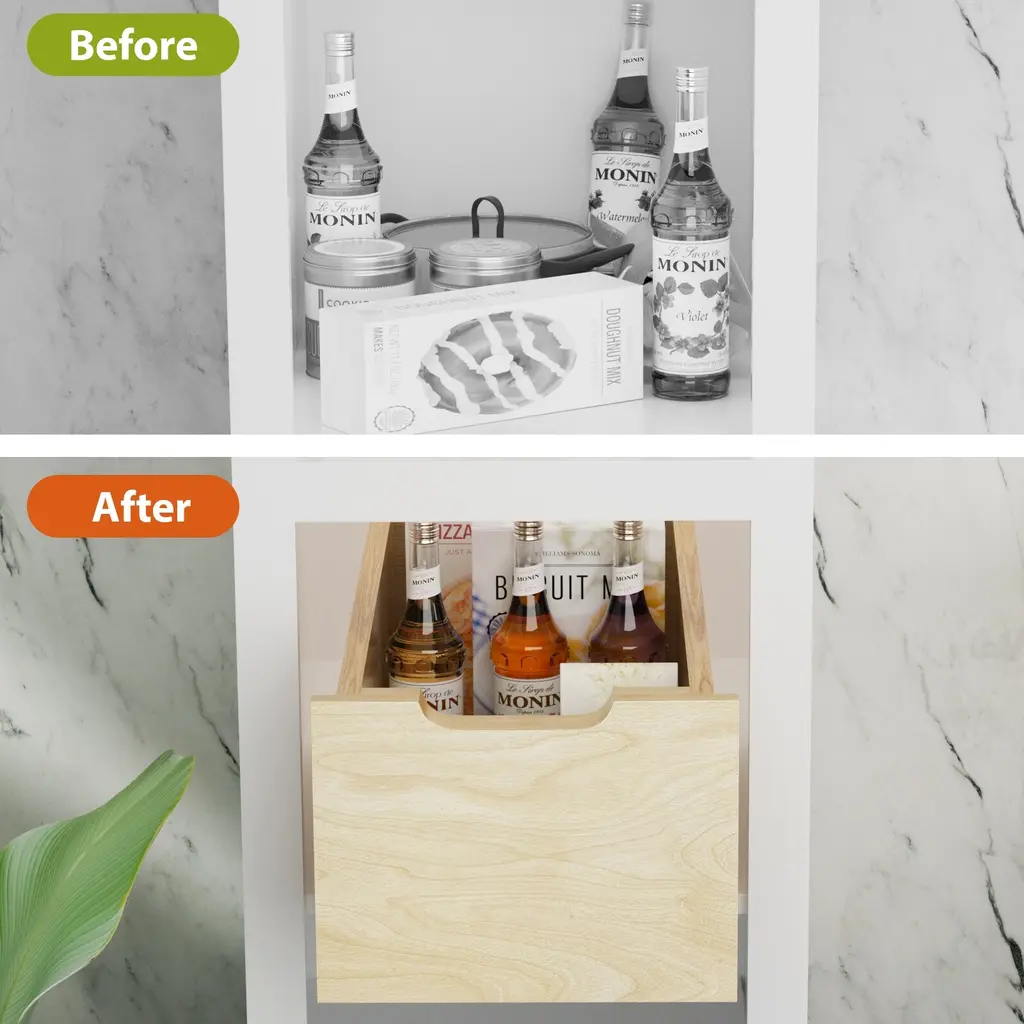 【Ergonomic Design】We understand that one size does not fit all. Therefore, we've designed this 8-inch tall pull out drawers with doubled side and back heights, forming a wrap-around shield to prevent taller items from toppling off your shelves. Perfectly engineered for double stacking cans in your pantry, 8-inch tall birchwood rim in a tapered shape to firmly secure larger items【Easy Assembly】The pull out shelf arrives fully assembled. All you need to do is attach the slide rails to the base or existing full-shelf of your cabinet. A mounting template and all the necessary hardware are included. These pull-out racks simplify your life, making them an ideal choice for your kitchen, pantry, bathroom, closet, or laundry room.(NOTE: Pull-out drawers are mounted on the bottom【Accurate Size】Please ensure you measure the width and depth of your cabinet accurately before purchase. This pull out home organizer fits a 15-inch wide cabinet. Minimum clear width: 11 inches (measured from the hinge); minimum clear depth: 24 inches; minimum clear height: 9 inches【Superior Quality】This pull out kitchen storage cabinet features Hard-close full-extension ball bearing slides, rated for 100 pounds. Constructed from high-quality birch and oak with a natural transparent coating, it's sturdy and built to last. The pull out basket also boasts a natural, elegant color and texture, striking a perfect balance between utility and aesthetics in your kitchen storage solutions【Warranty & Service】If you are not satisfied with the pull-out rack received, feel free to contact us. We guarantee prompt resolution of all your concerns
