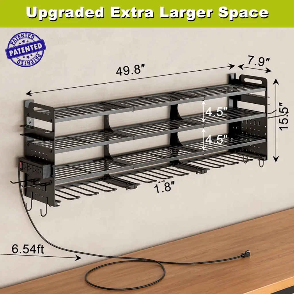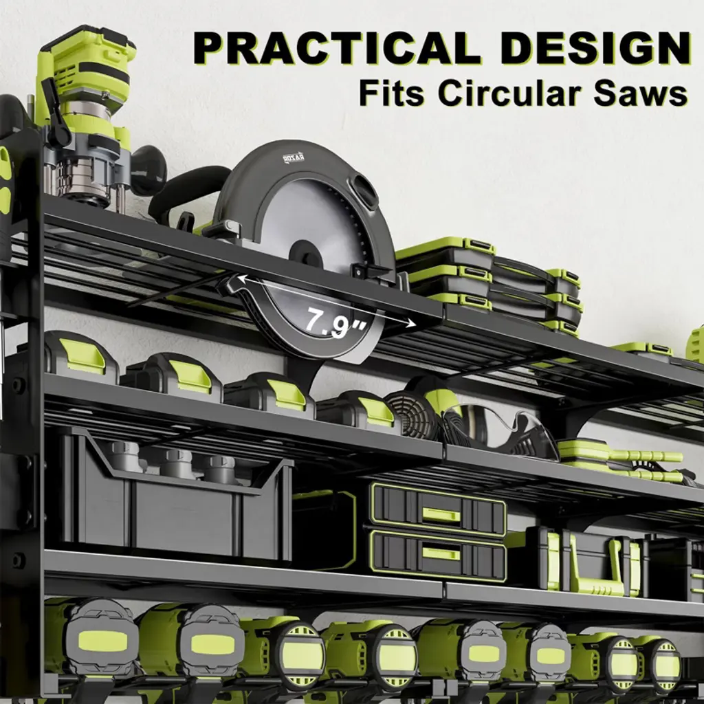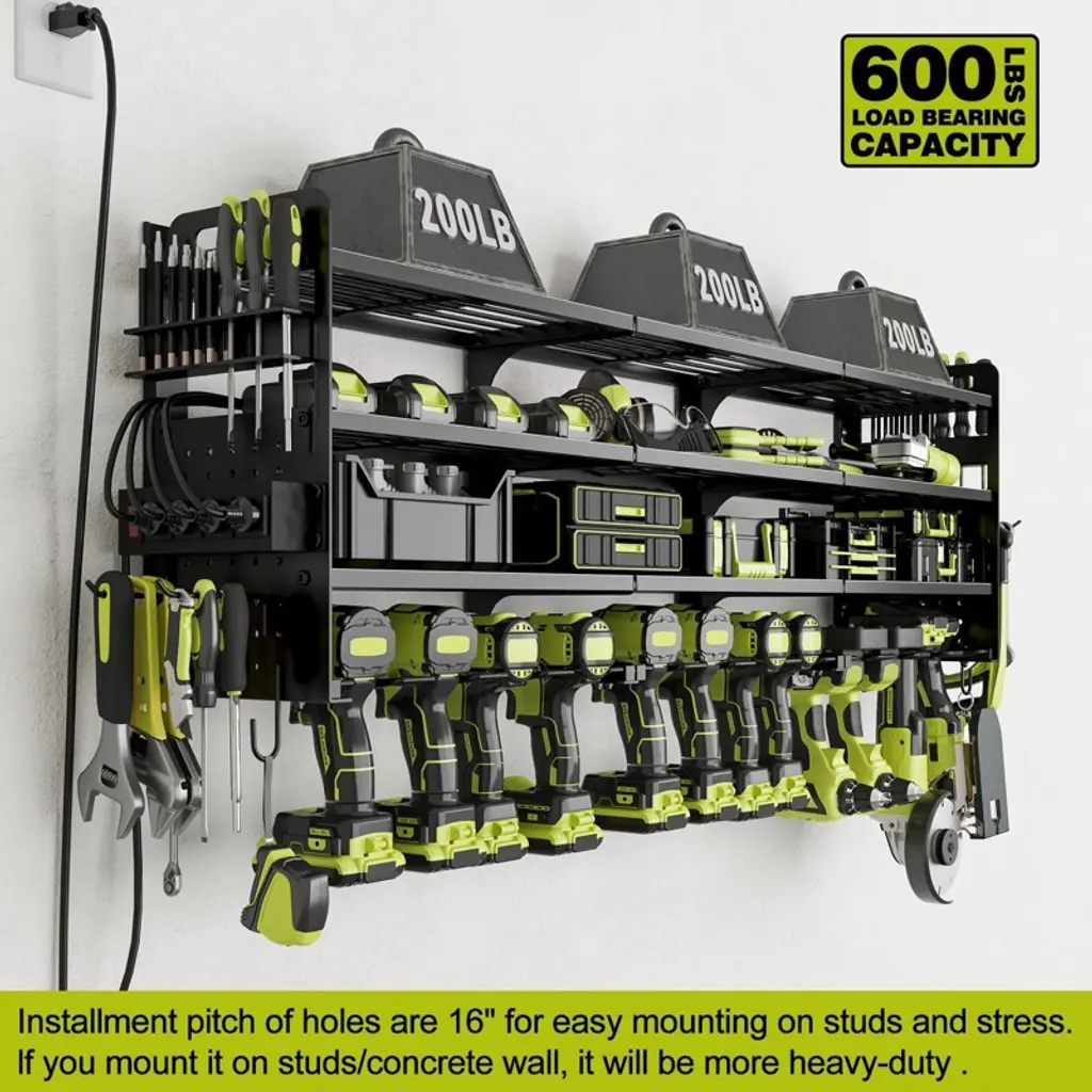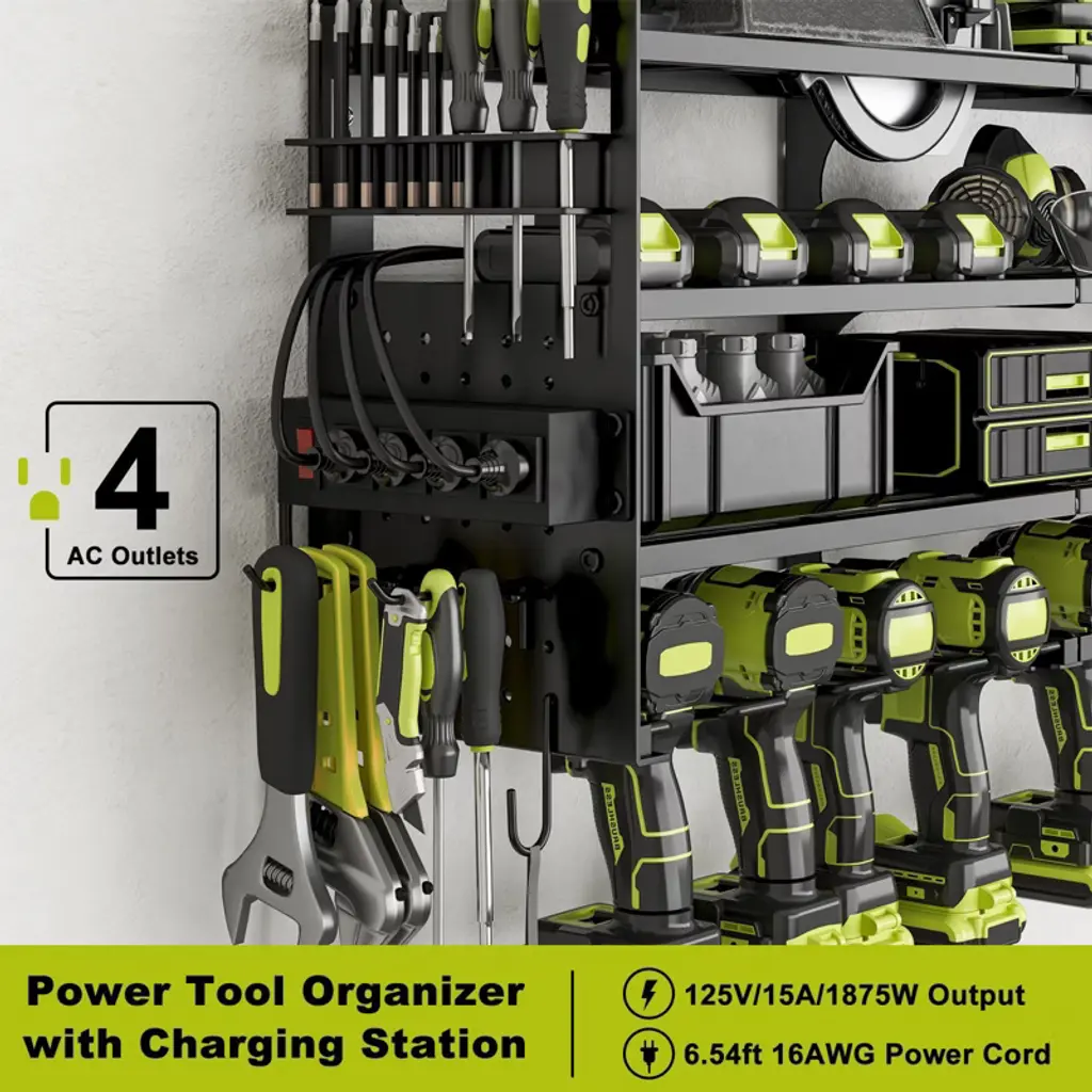 Hausource 12-Drill Power Tool Organizer offers heavy-duty storage with customizable features for serious DIYers. Mount it on wood, concrete, or pegboard walls with ease. Store up to 12 drills, plus hand tools on pegboard side panels and 4 adjustable shelves. Includes a 4-outlet power strip that can mount on either side. Built to hold 600 lbs, this all-in-one rack keeps your workspace organized, tools accessible, and clutter out of sight.
