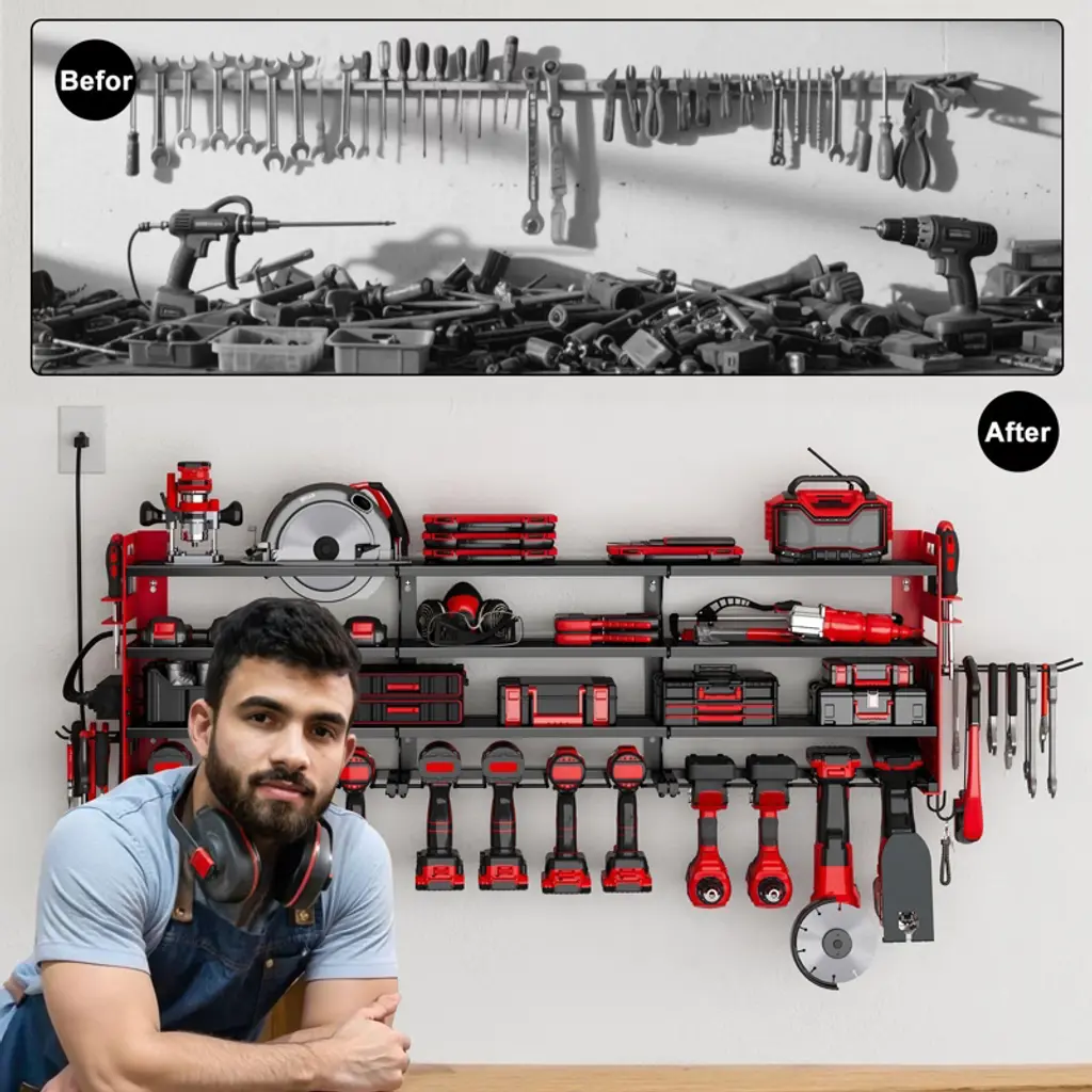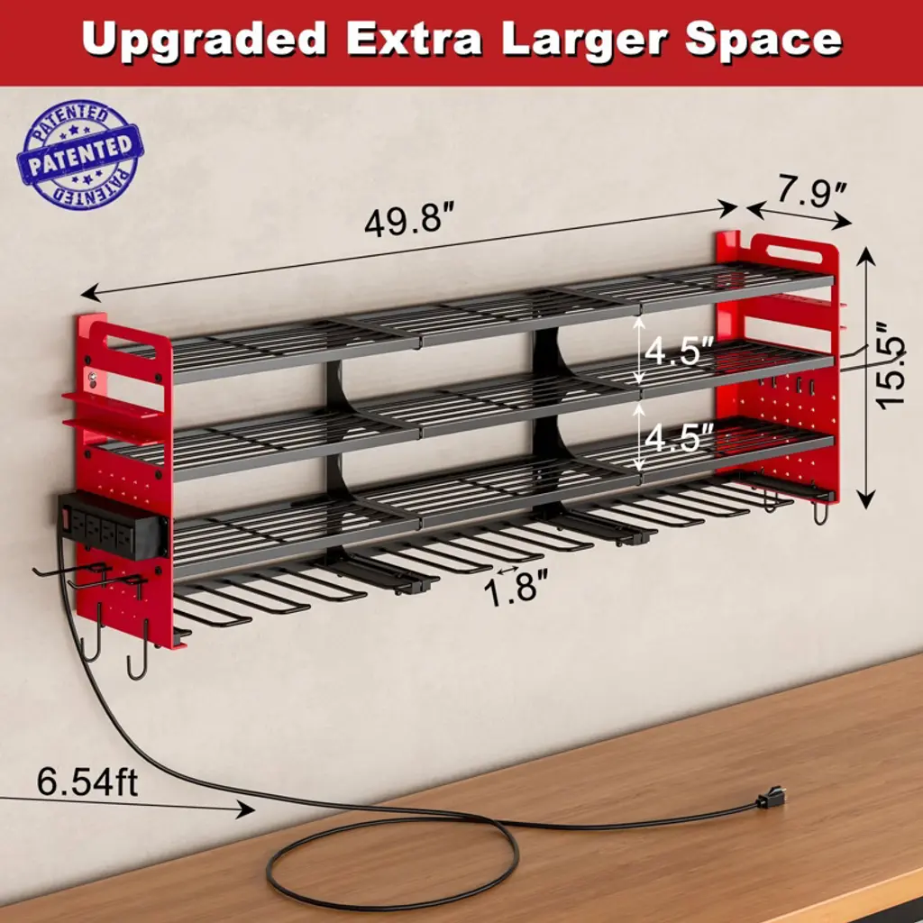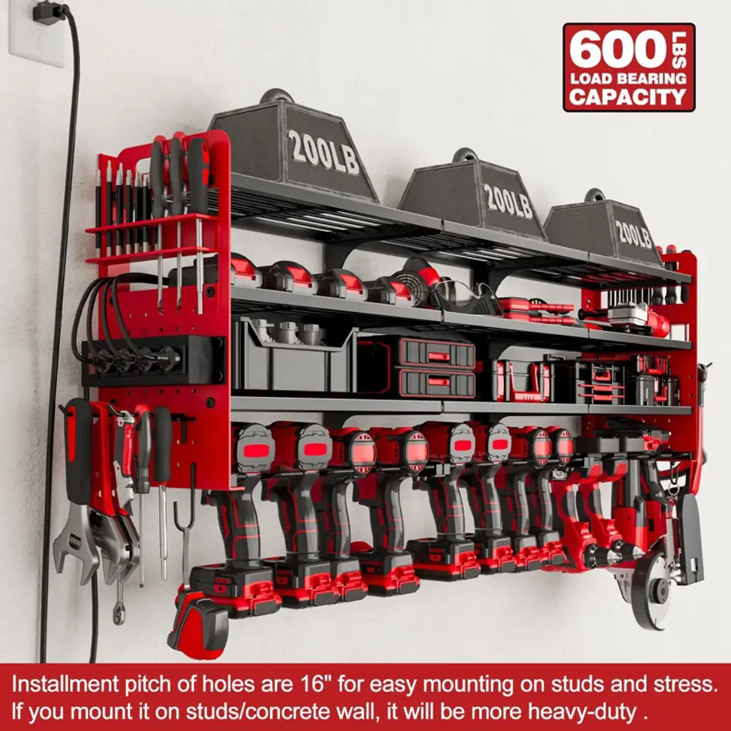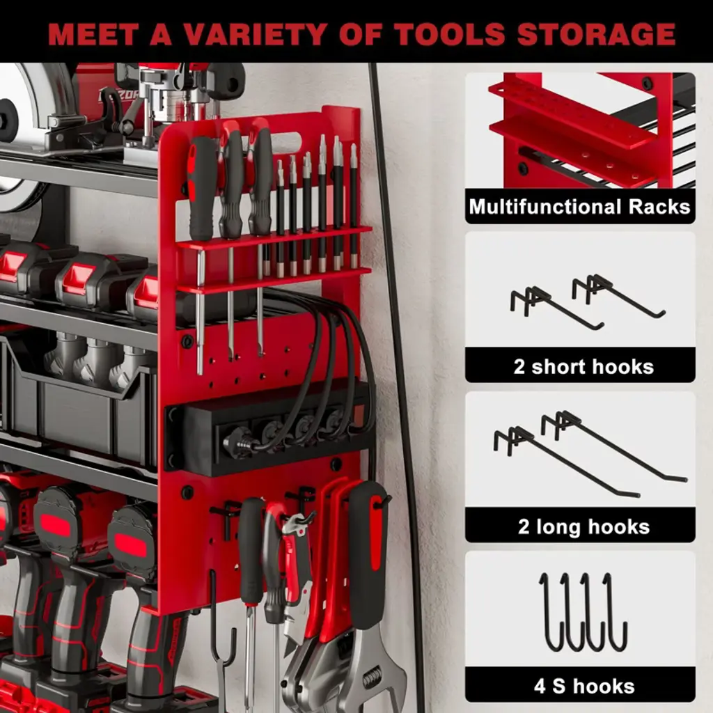 Hausource 12-slot Power Tool Organizer Storage Racks With Pegboard, 4-tier Drill Rack & Power Strip,red