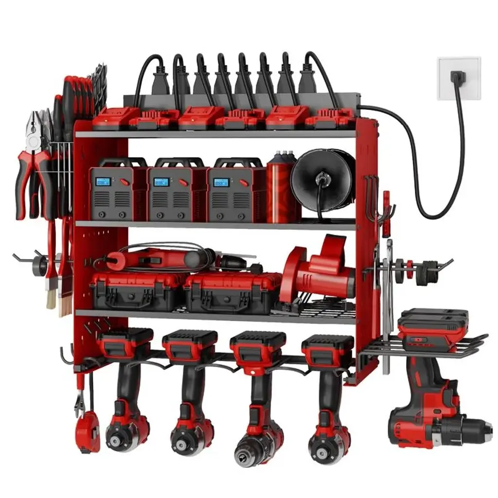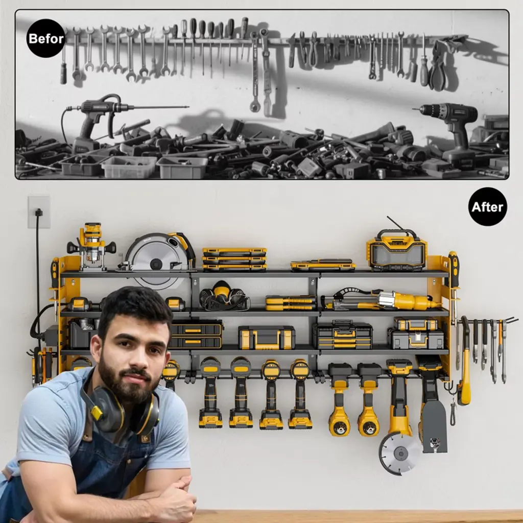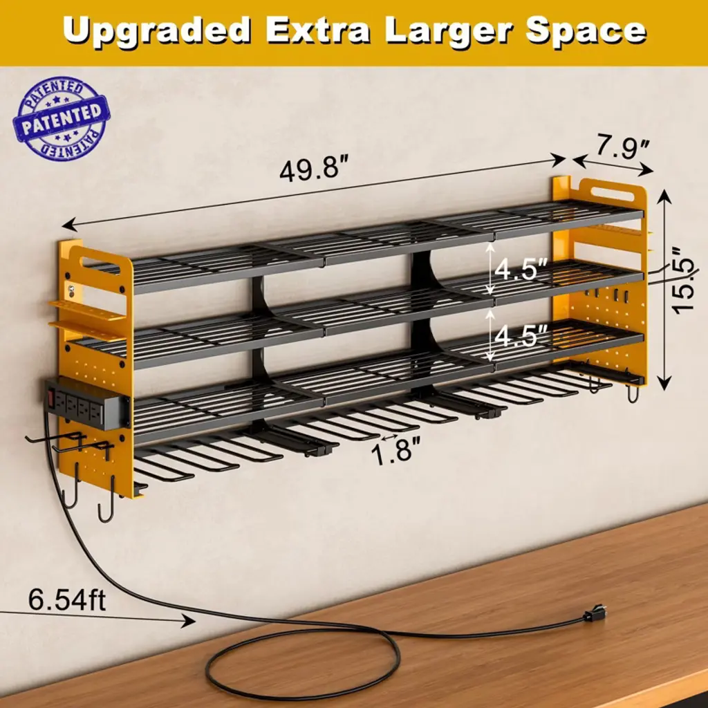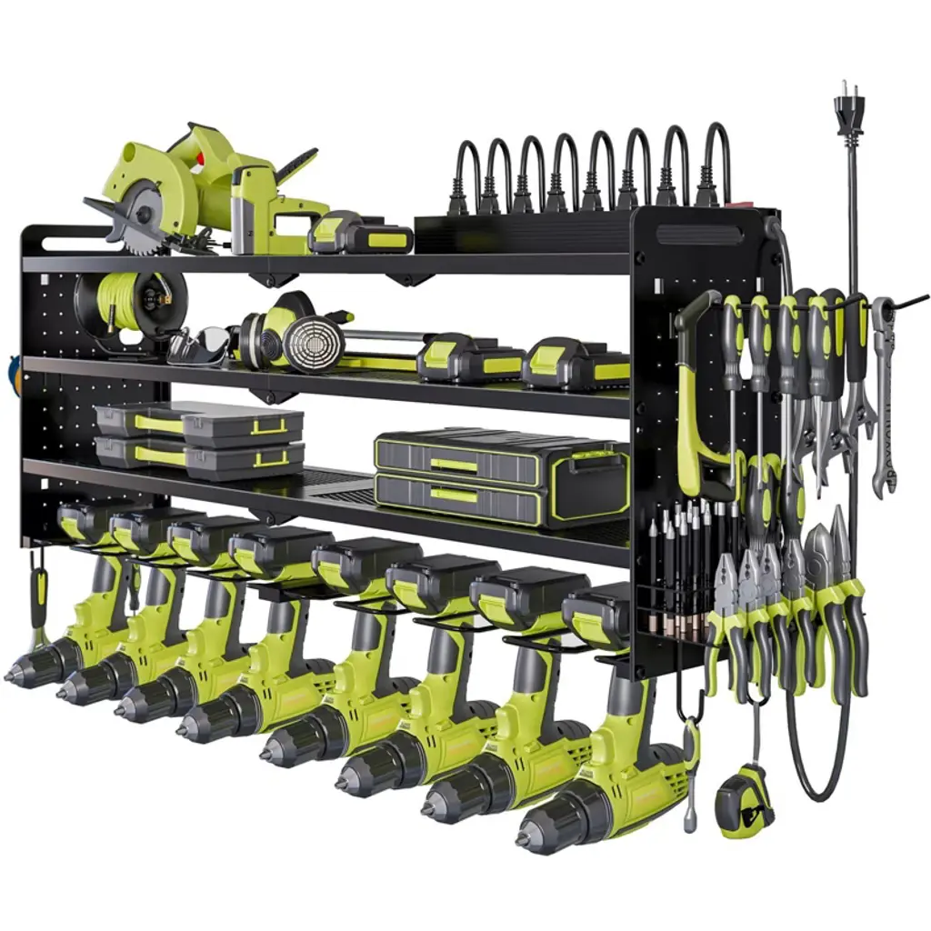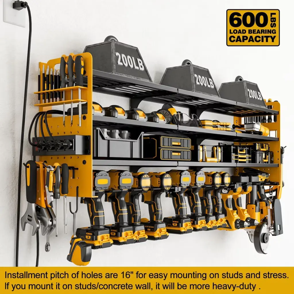 Hausource 12-Drill Power Tool Organizer offers heavy-duty storage with customizable features for serious DIYers. Mount it on wood, concrete, or pegboard walls with ease. Store up to 12 drills, plus hand tools on pegboard side panels and 4 adjustable shelves. Includes a 4-outlet power strip that can mount on either side. Built to hold 600 lbs, this all-in-one rack keeps your workspace organized, tools accessible, and clutter out of sight.
